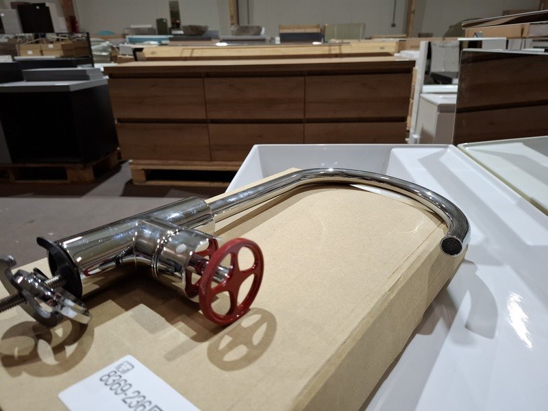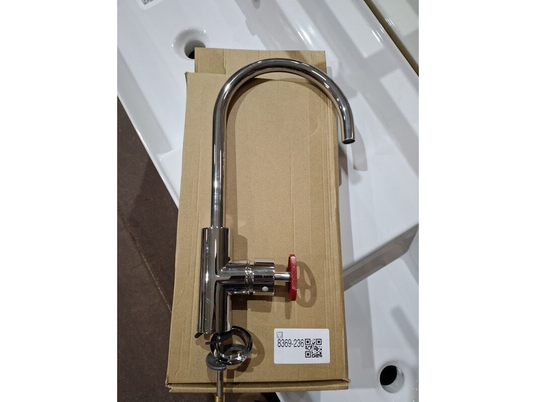 Merk: VT wonen Product: Wastafelkraan Kleur: rood/chroom Specificaties: hoge uitloop