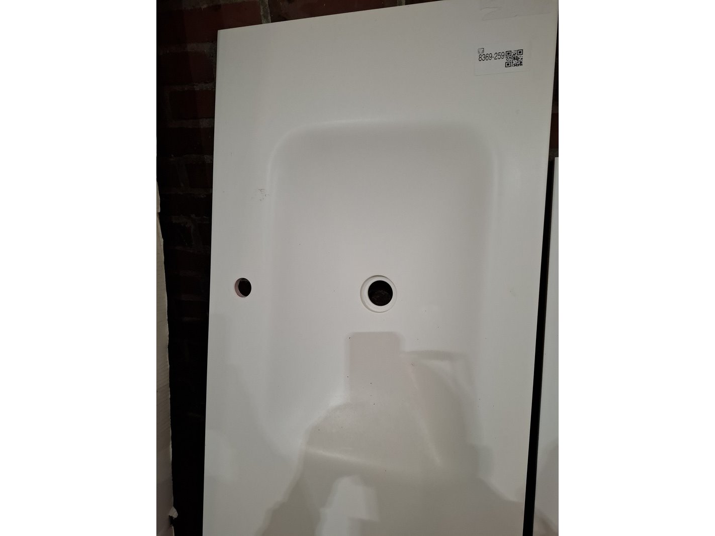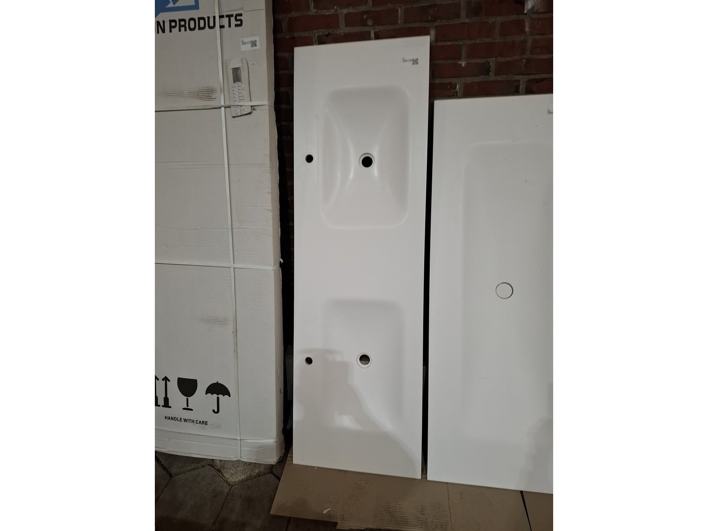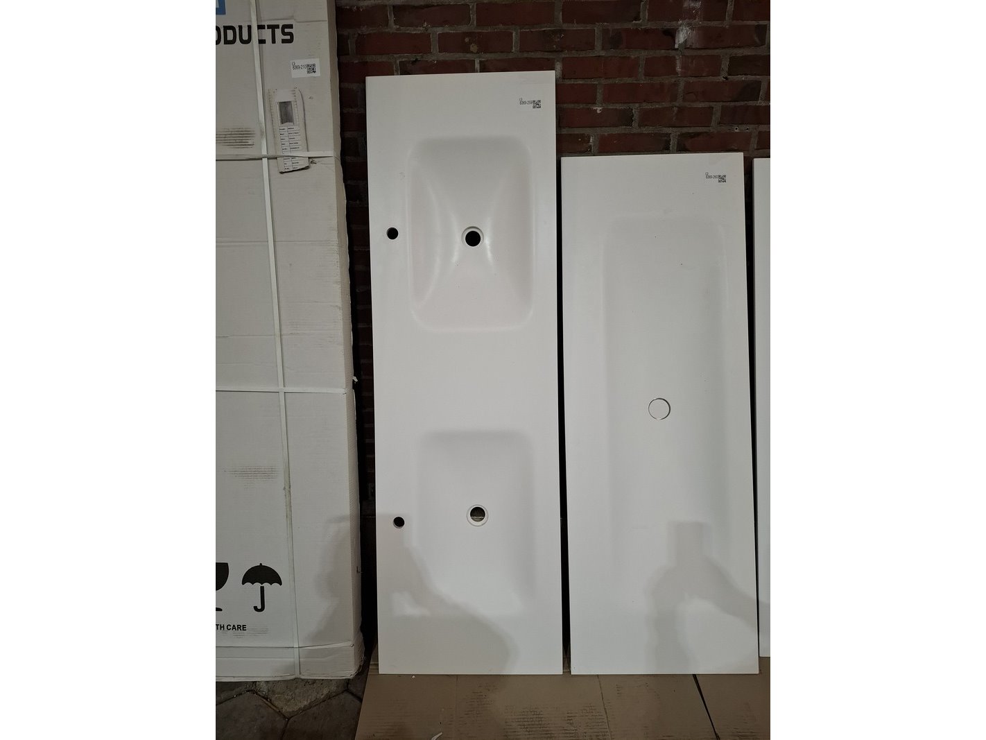 Merk: Elise Product: Wastafel Kleur: mat wit Materiaal: HI-MACS Afmeting: 165x51cm Specificaties: wastafel, solid surface, mat wit, 2 bakken, 2 kraangaten