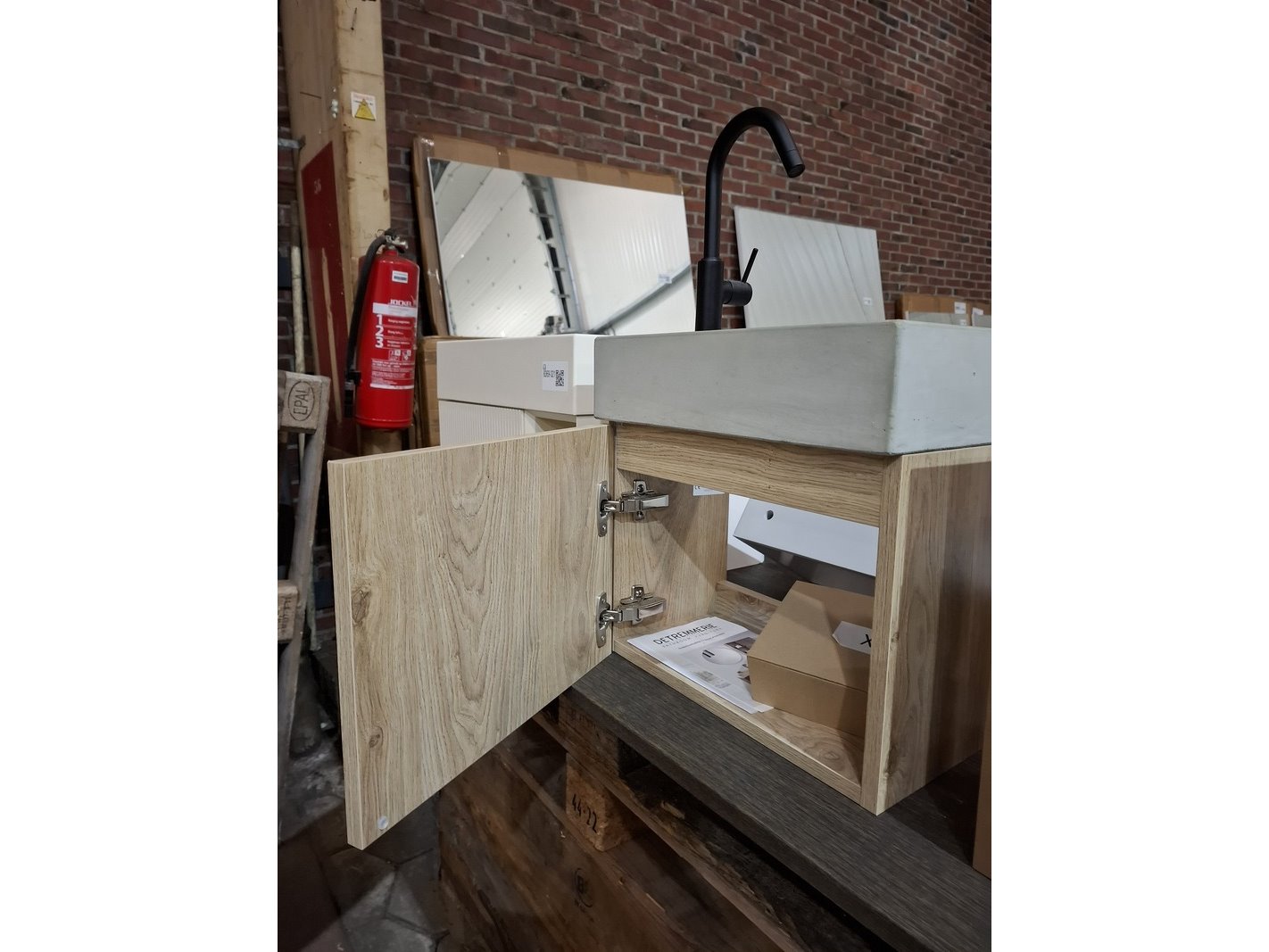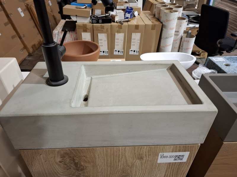 Merk: Detremmerie Product: Fonteinmeubel Kleur: eiken Afmeting: 40x22cm Specificaties: 1 deurtje, push-to-open, polybeton fontein, fonteinkraan, zwart