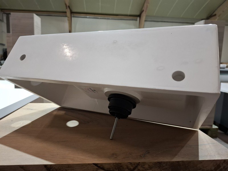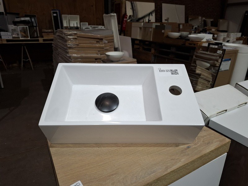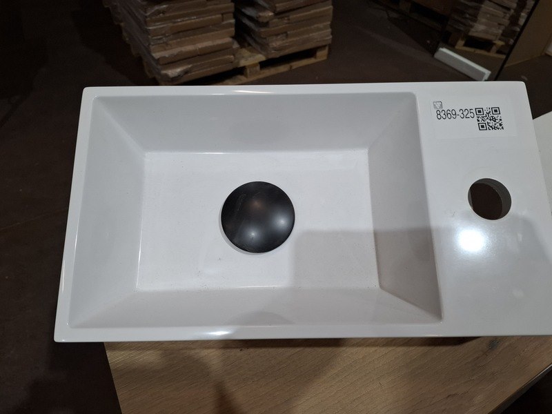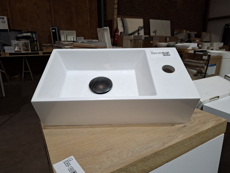 Product: Fontein Materiaal: polybeton Afmeting: 40x22cm Specificaties: rechter uitvoering, 1 kraangat, click waste, mat zwart