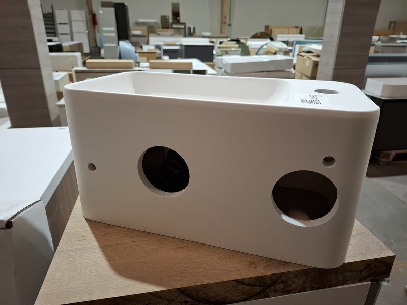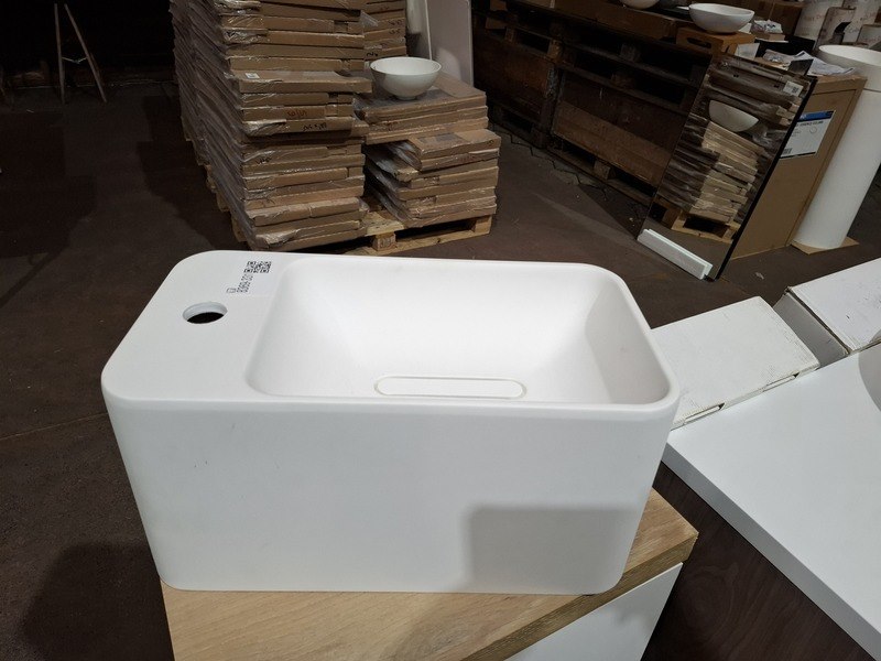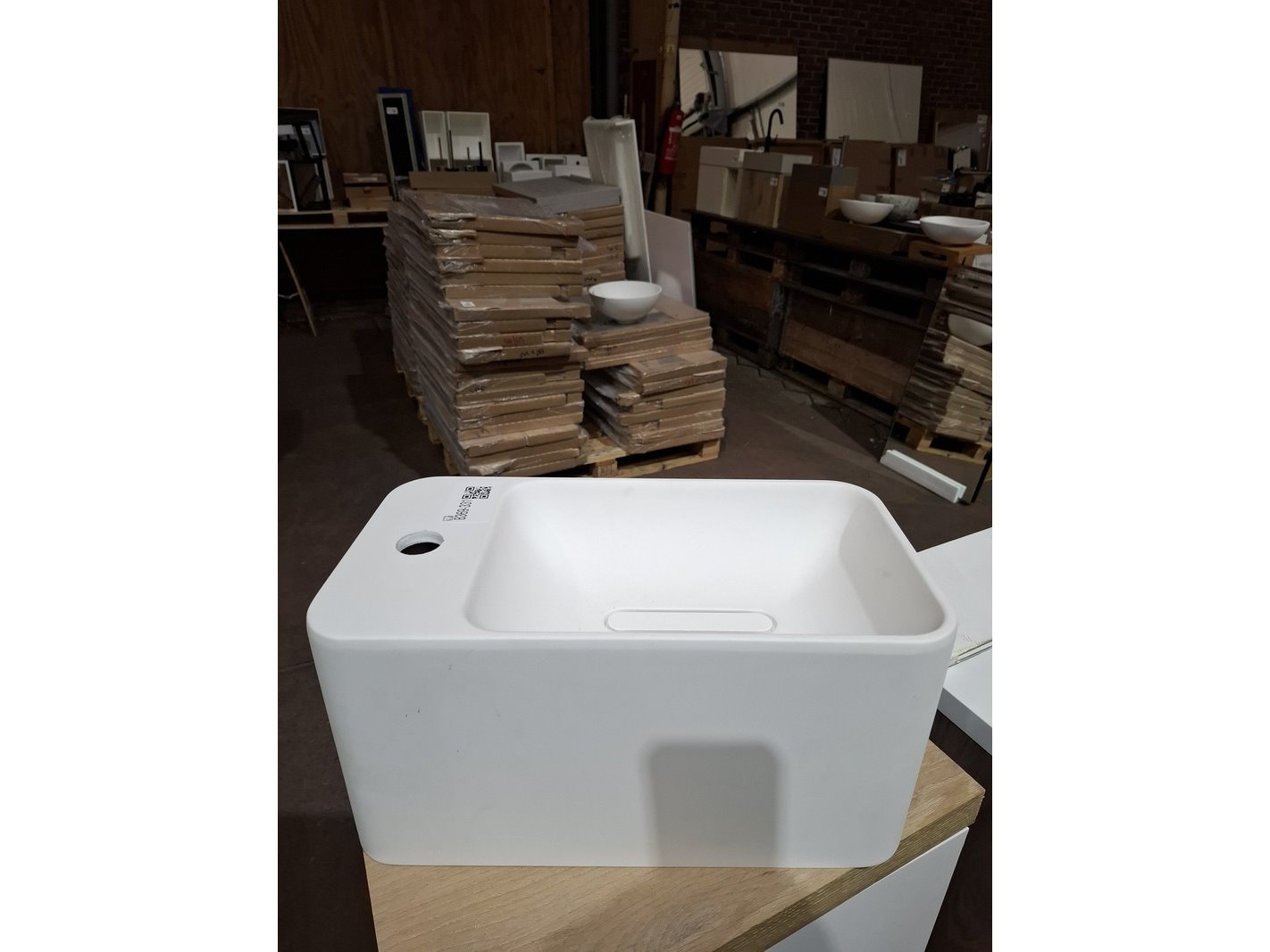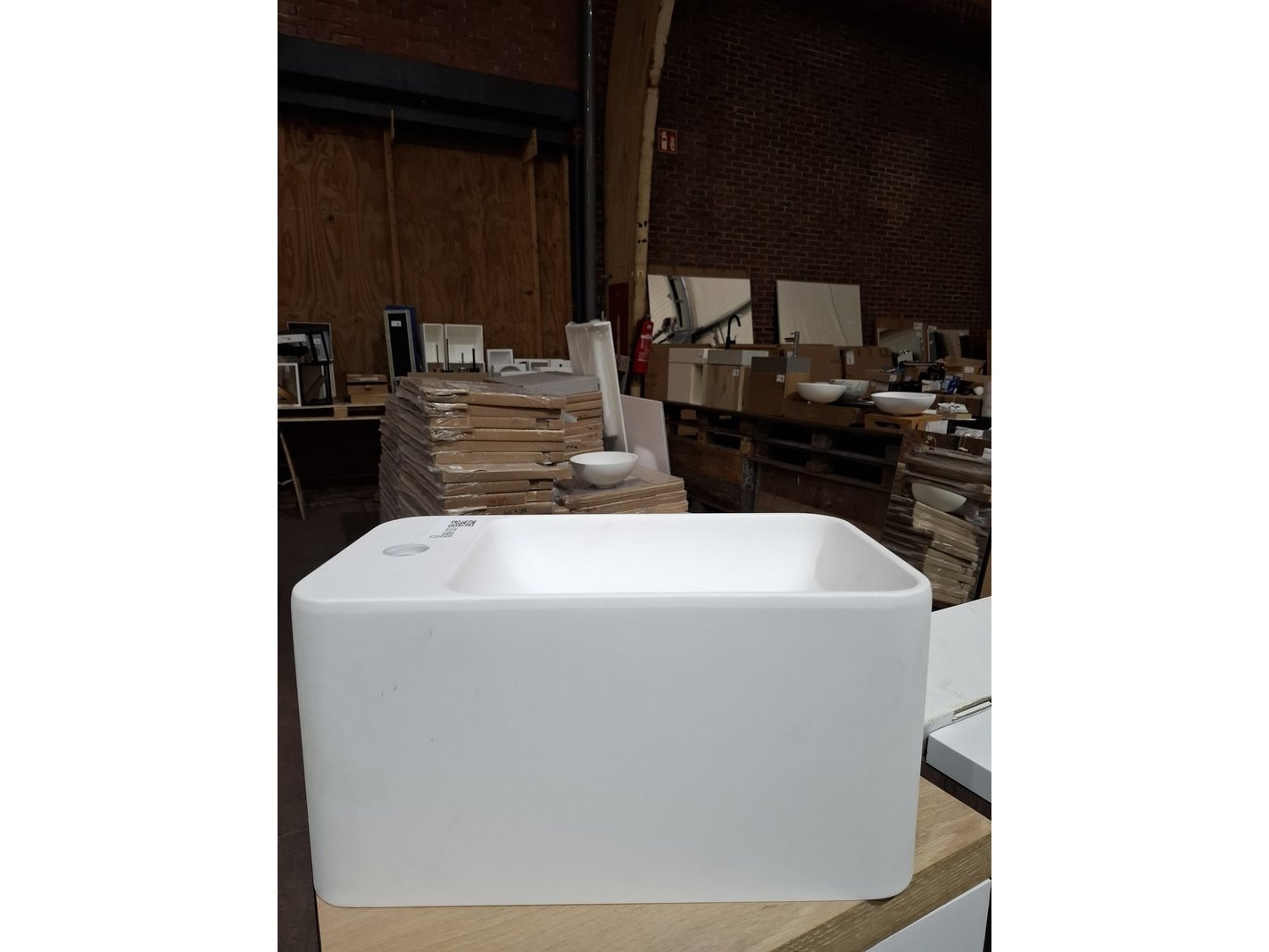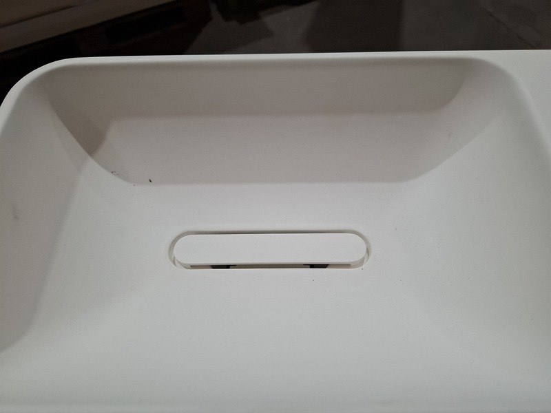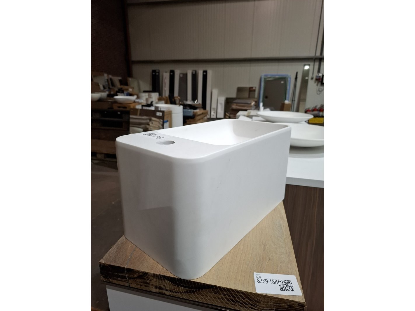 Merk: Dzignstone Product: Fontein Materiaal: solid surface Afmeting: 42x22x(h)21cm Specificaties: met kraangat, verdekte afvoer
