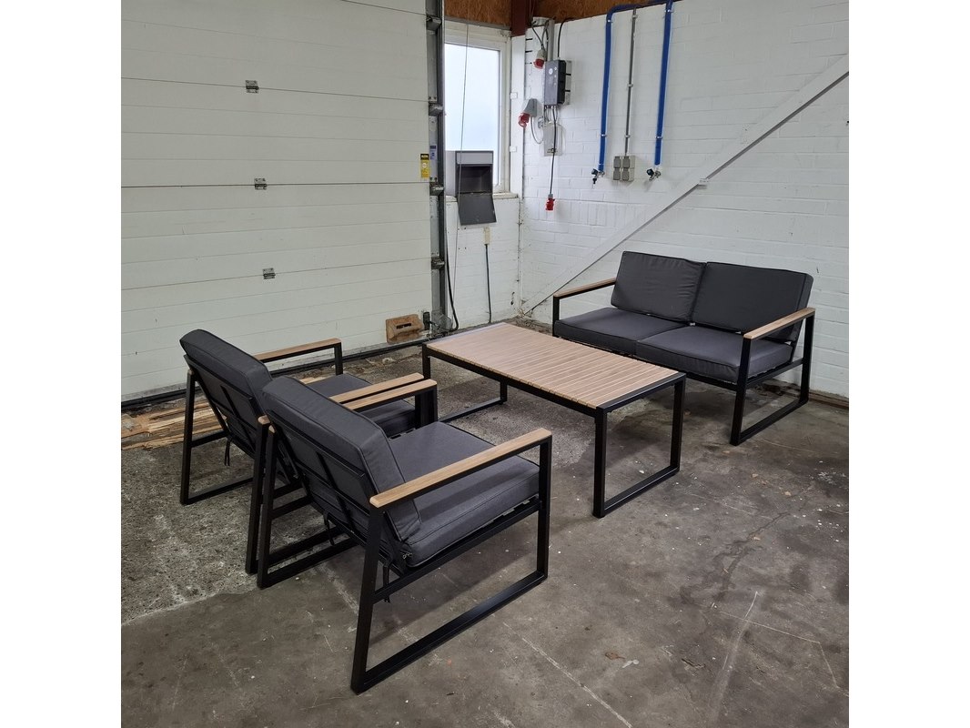 Merk: Furniqs Product: 4-delige tuinmeubelset Materiaal: Metaal / hout Specificaties: serienummer: DM-51410 Bestaande uit: 1x bank (lxbxh) ca. 129 x 80 x 69cm, zithoogte ca. 45 cm 1x bijzettafel (lxbxh) ca. 122 x 60 x 51 cm, 2x stoel (lxbxh) ca. 81 x 69 x 70 cm, zithoogte ca. 45 cm Showroommodel, meubels zijn uitgepakt in elkaar gezet ten behoeve van foto's.