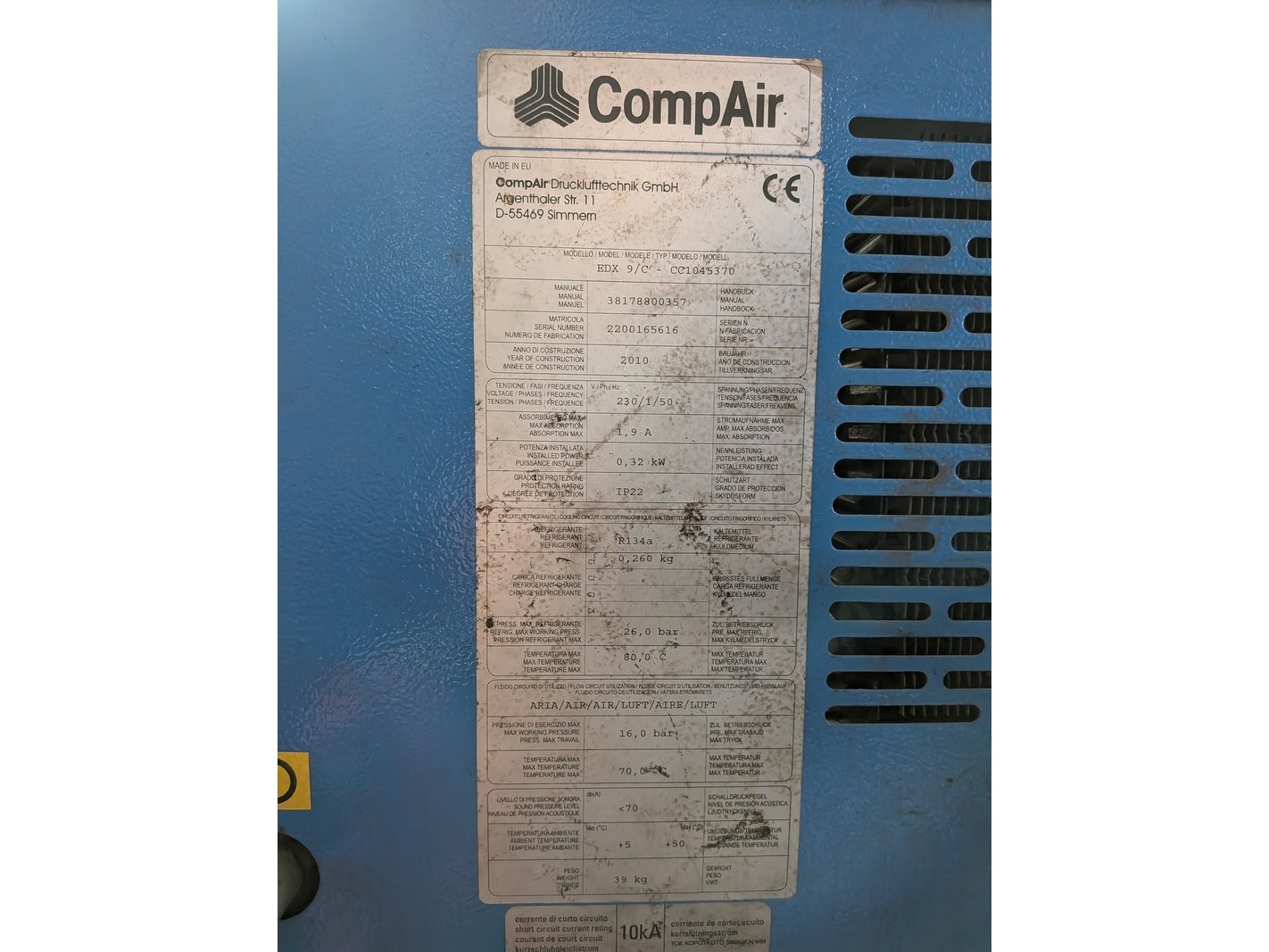 Merk: CompAir Product: Compressor opstelling Specificaties: bestaande uit: compressor CompAir L05, bj 2010, max 10bar, 380V; ontvochtiger CompAir EDX9/C, model CC10453780, bj 2010; buffervat CompAir, 200ltr, bj 2010