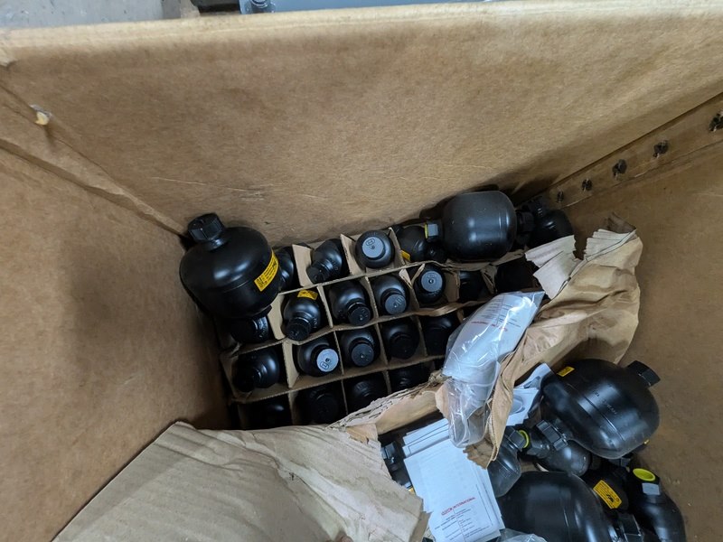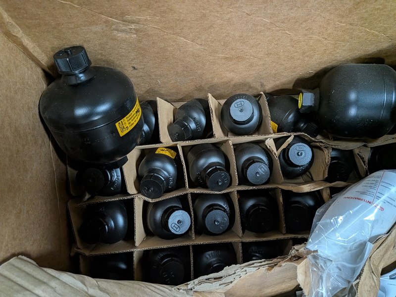 Product: Partij hydraulische accumulatoren Kleur: Hydac Conditie: nieuw Specificaties: diverse uitvoeringen