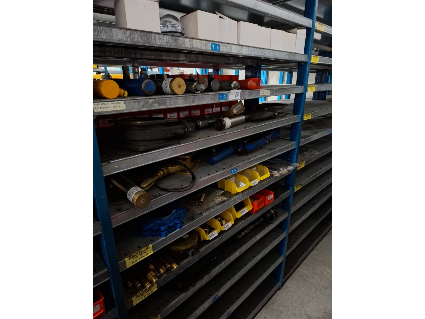 Product: Partij bemester onderdelen en toebehoren Specificaties: o.a. kijkglazen, afsluiters 6-duims, diverse toebehoren t.b.v. afsluiters, bouten, moeren, ringen, gaffels, etc. (in 1,25mtr stelling)