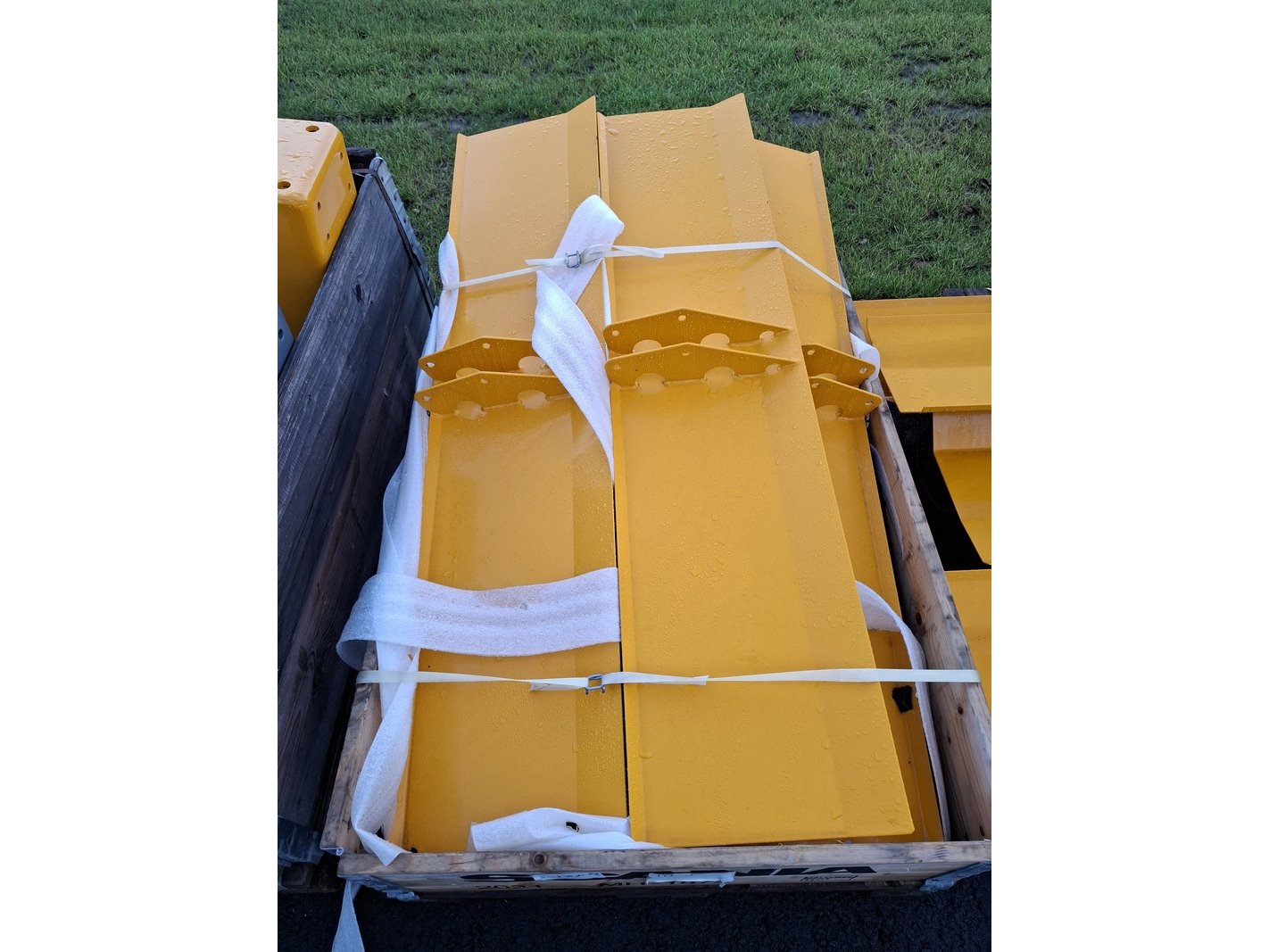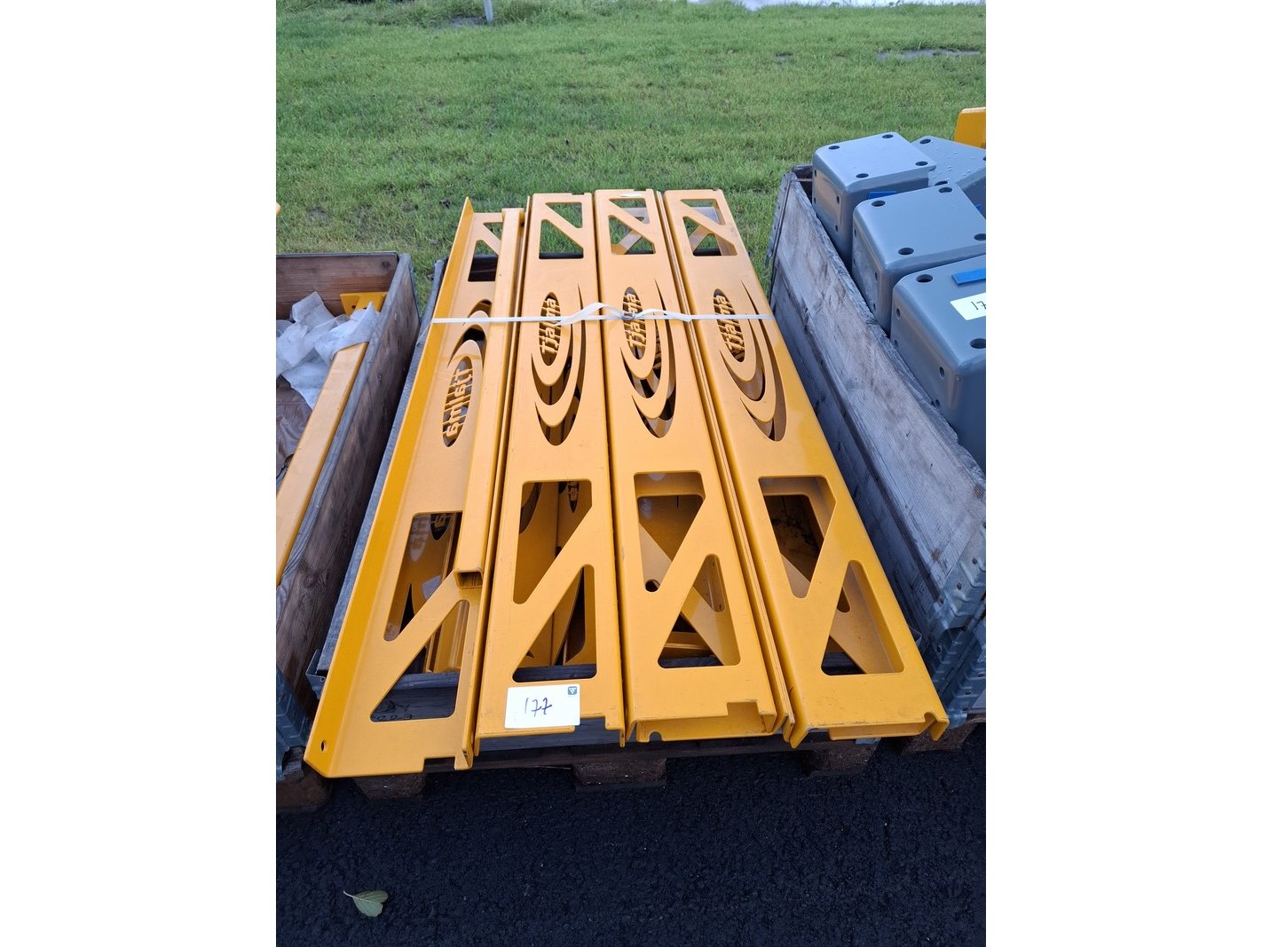 Product: 5x Pallet halffabricaat modulair bemester Specificaties: o.a. afschermkappen, steunen, balken met logo