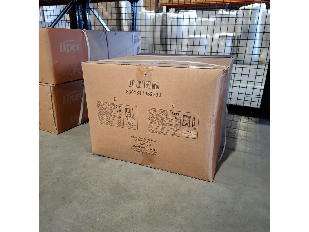 Merk: Liper Product: LED Solar Straatverlichting 60W Kleur: Zwart Materiaal: Aluminium BouwJaar: 2024 Conditie: Nieuw Specificaties: 1.200lm 6000K IP65 IK07 90° stralingshoek 12 Ah Lithium batterij