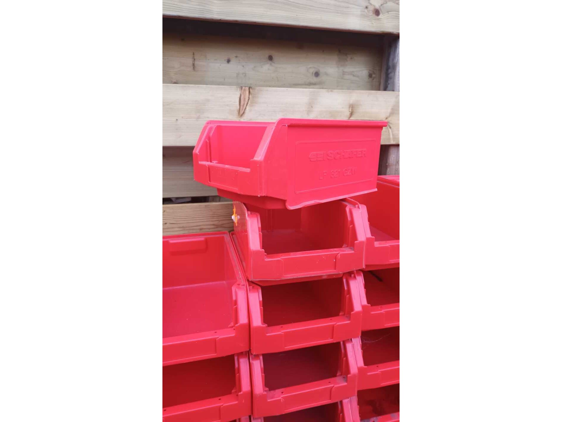 Merk: Schafer Product: Magazijnbakken met grijp opening Kleur: Rood Materiaal: Kunststof Afmeting: 35x20x15 cm Conditie: Gebruikt Specificaties: Eer nette magazijnbakken van Schafer slagvast en goed stapelbaar , voorzien van etikethouder