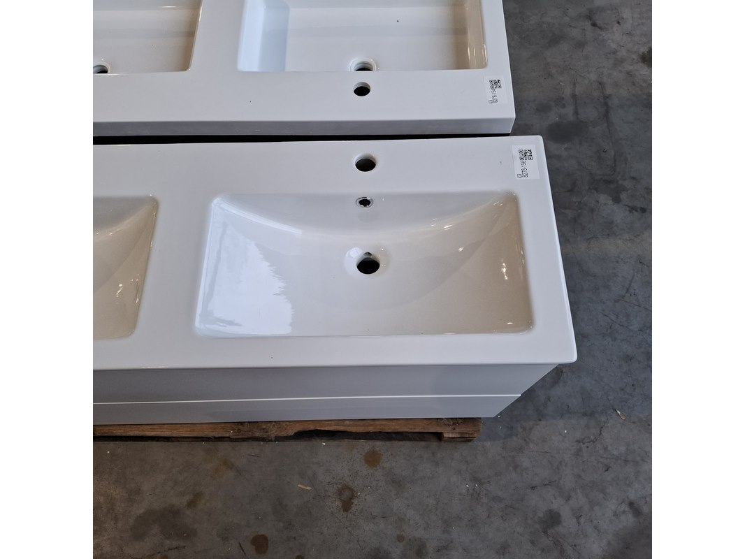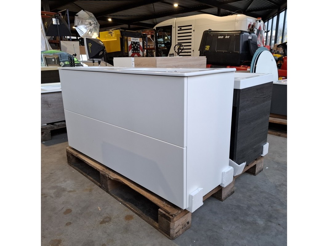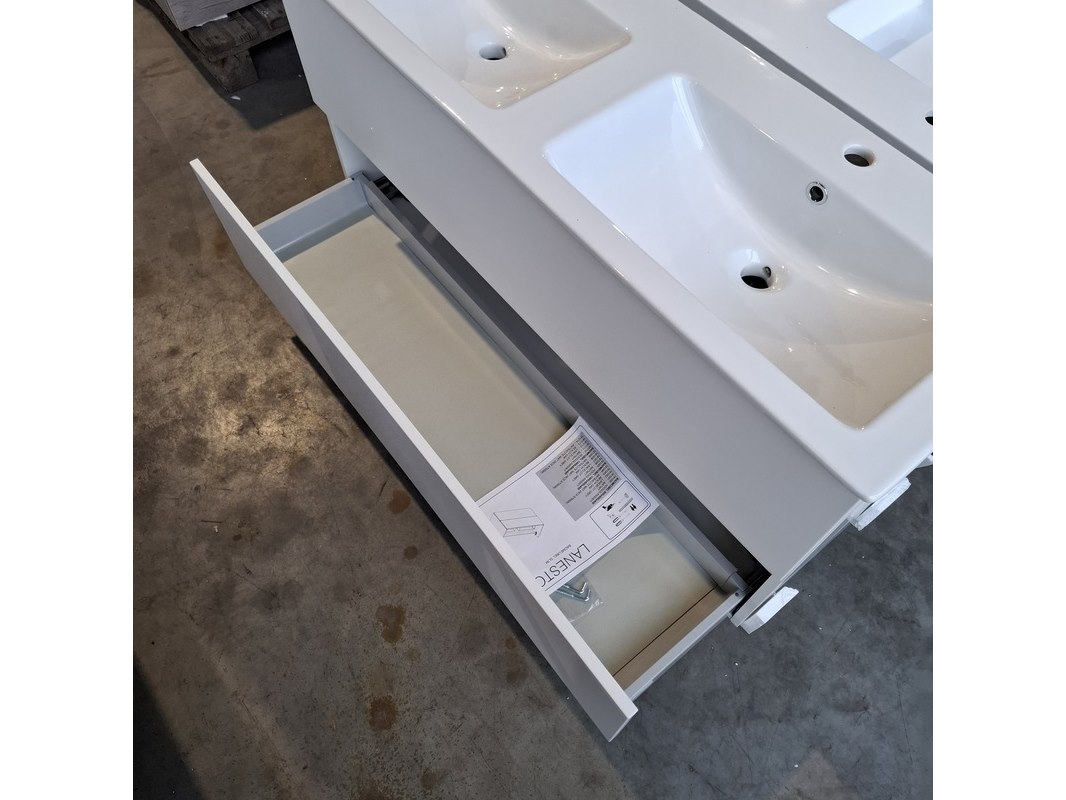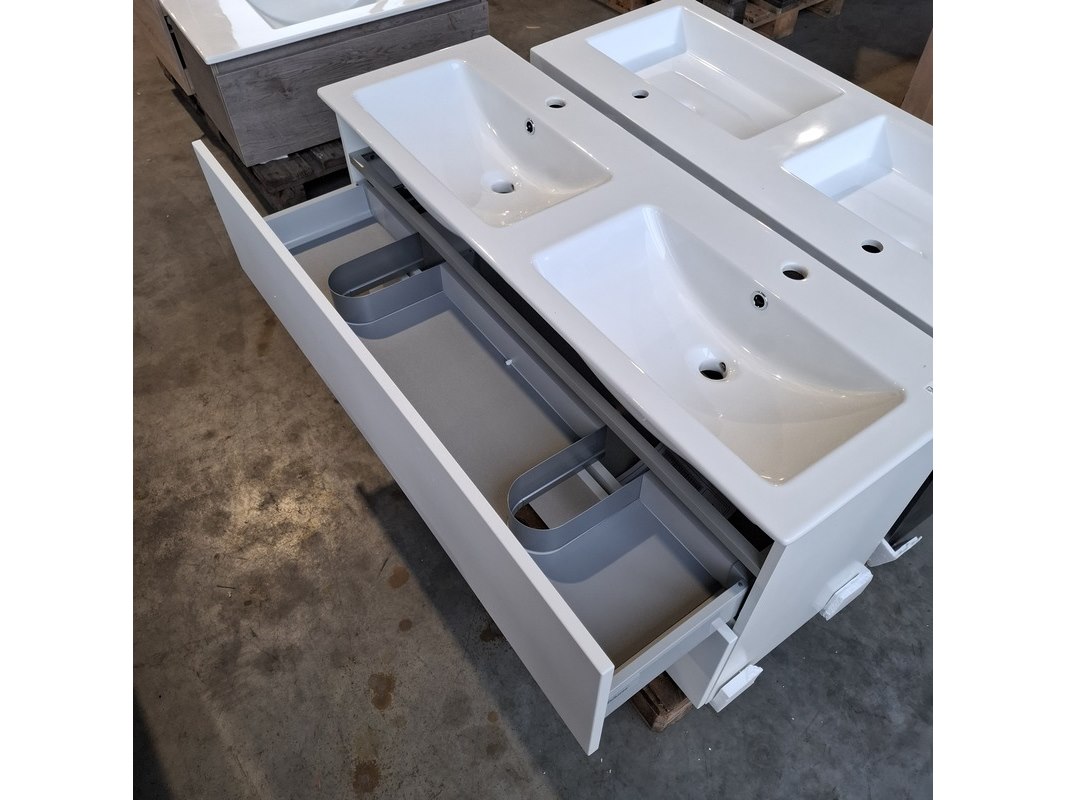Merk: Dekker Product: Badmeubel Kleur: Matwit Afmeting: 120x40cm Specificaties: 2 lades met softclose, met Blum lade-geleiders, push to open systeem, keramische wastafel, glans wit, 2 bakken , 2 kraangaten
