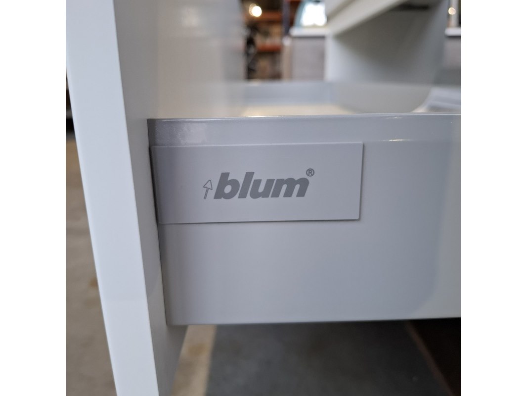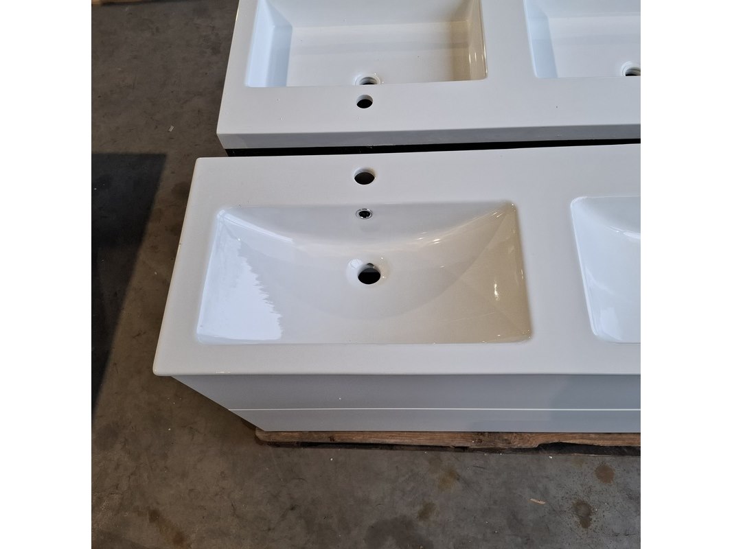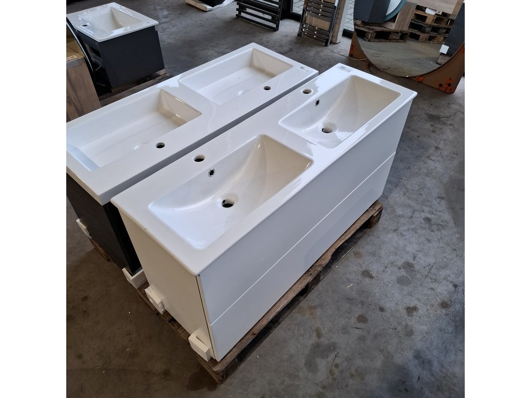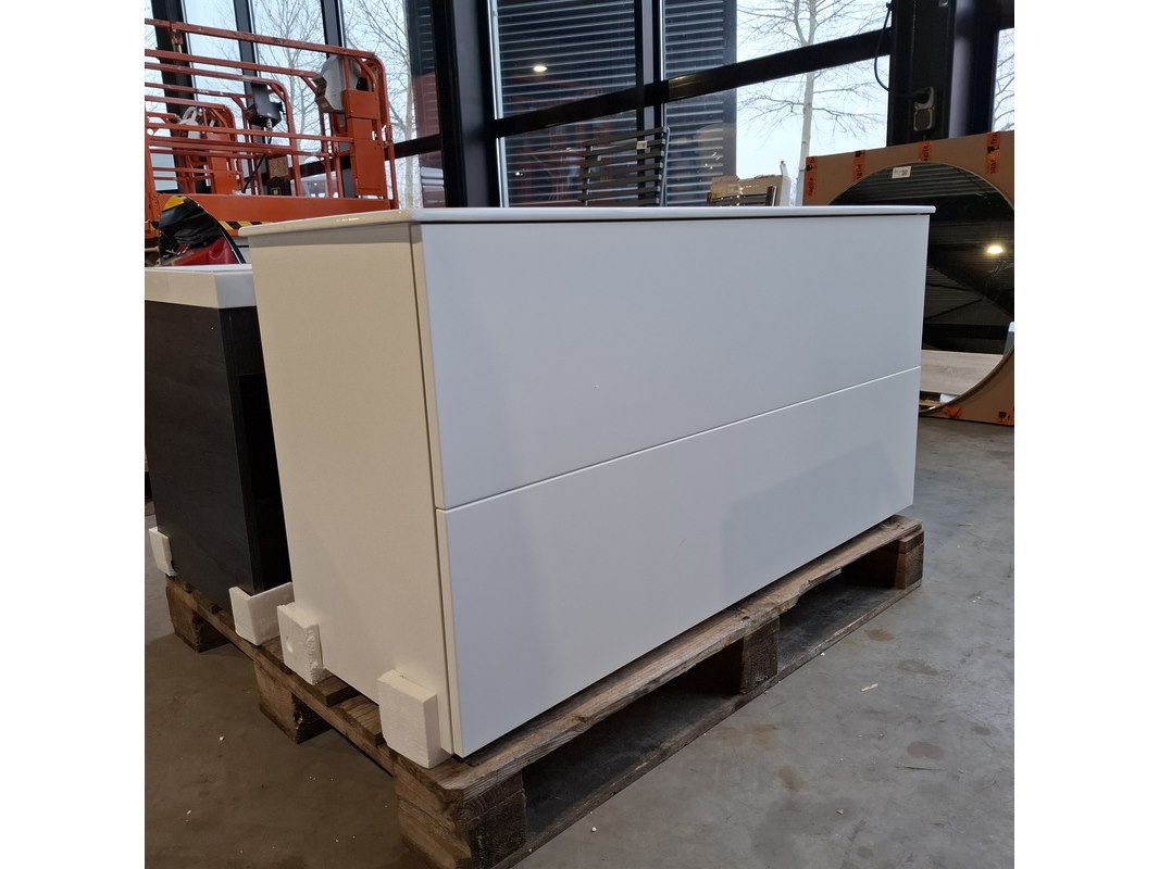 Merk: Dekker Product: Badmeubel Kleur: Matwit Afmeting: 120x40cm Specificaties: 2 lades met softclose, met Blum lade-geleiders, push to open systeem, keramische wastafel, glans wit, 2 bakken , 2 kraangaten