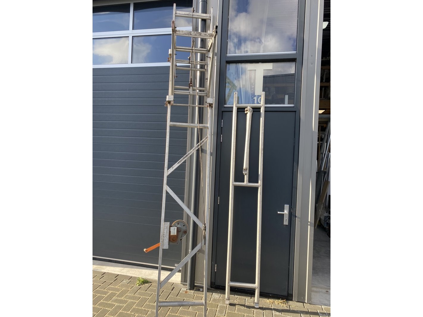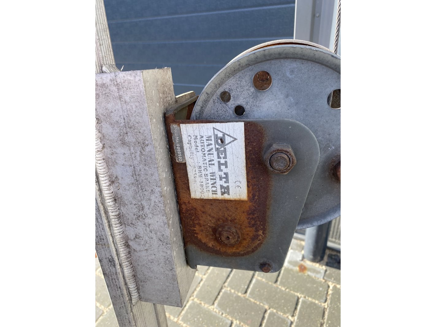Merk: Delta Product: Ladderlift Materiaal: Aluminium Afmeting: Hoogte 375cm. Conditie: Gebruikt Specificaties: Delta BHW1800 ladderlift totaal afmeting hoogte 375cm. plateau afm. b;40cm x l65cm. max. belasting; 824kg. staalkabel; true incl. trapsteun.