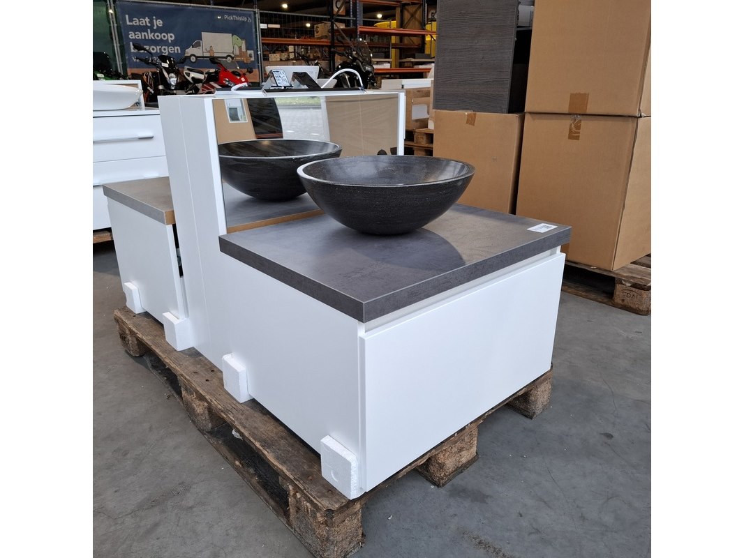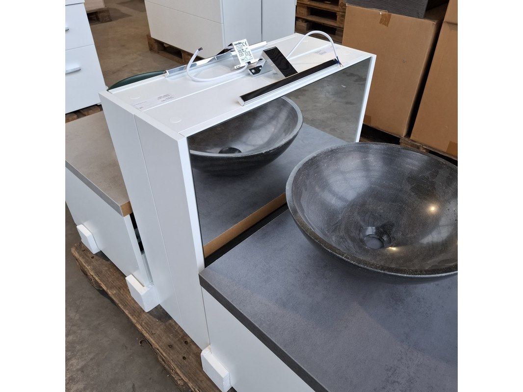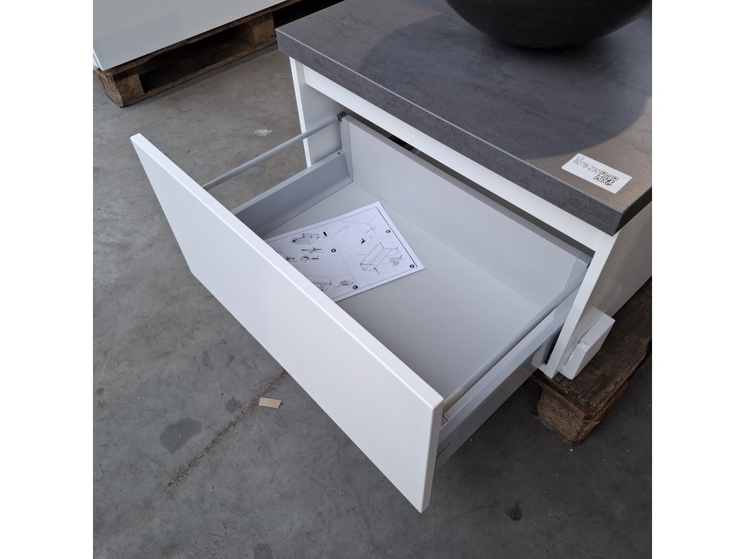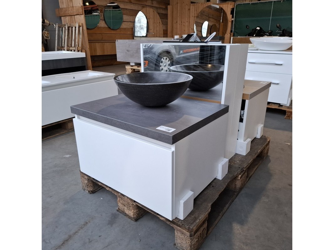 Merk: Dekker Product: Badmeubel Kleur: Matwit Afmeting: 65x50cm Specificaties: 1 lade met softclose, met Blum lade geleidesysteem, topblad, antraciet, waskom, hardsteen, gezoet antraciet, Ø40cm, spiegelkast, matwit, 1 deurtje met softclose, met spiegelkastverlichting