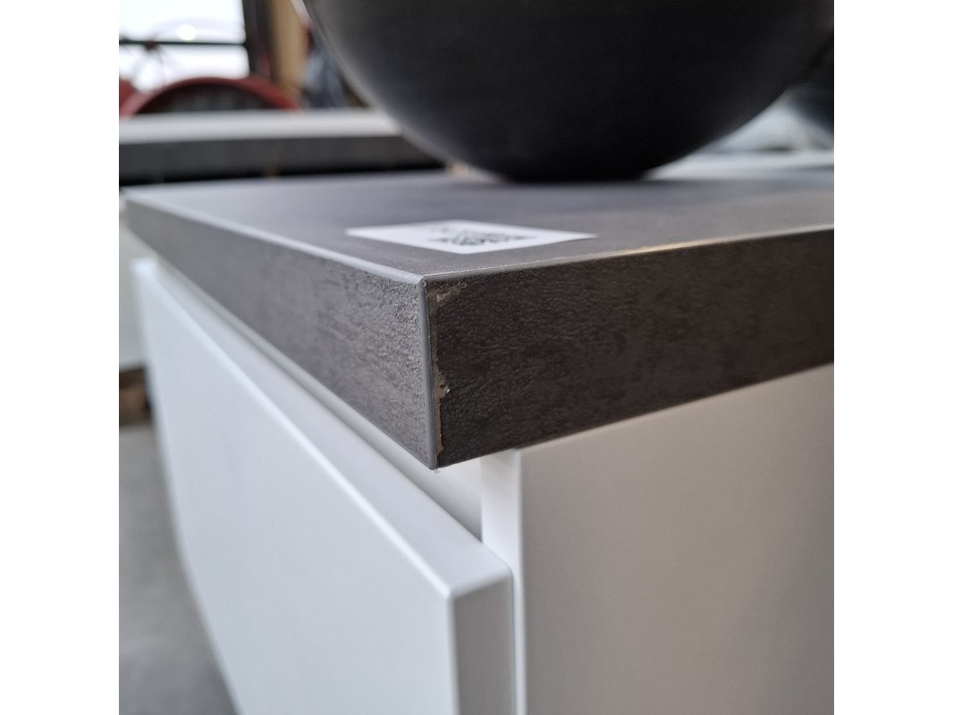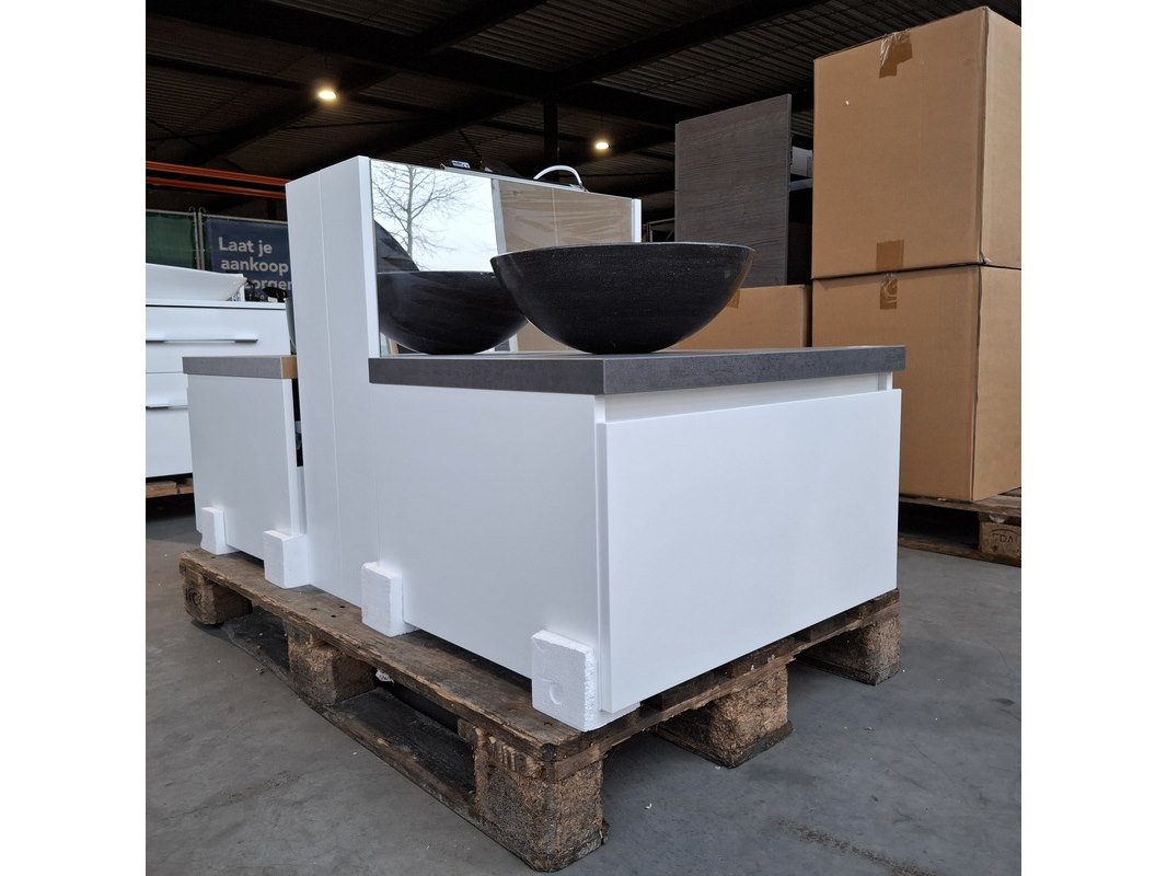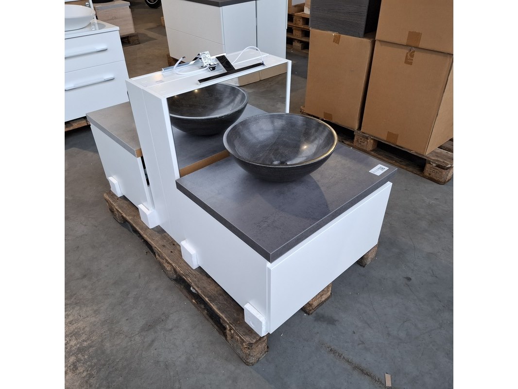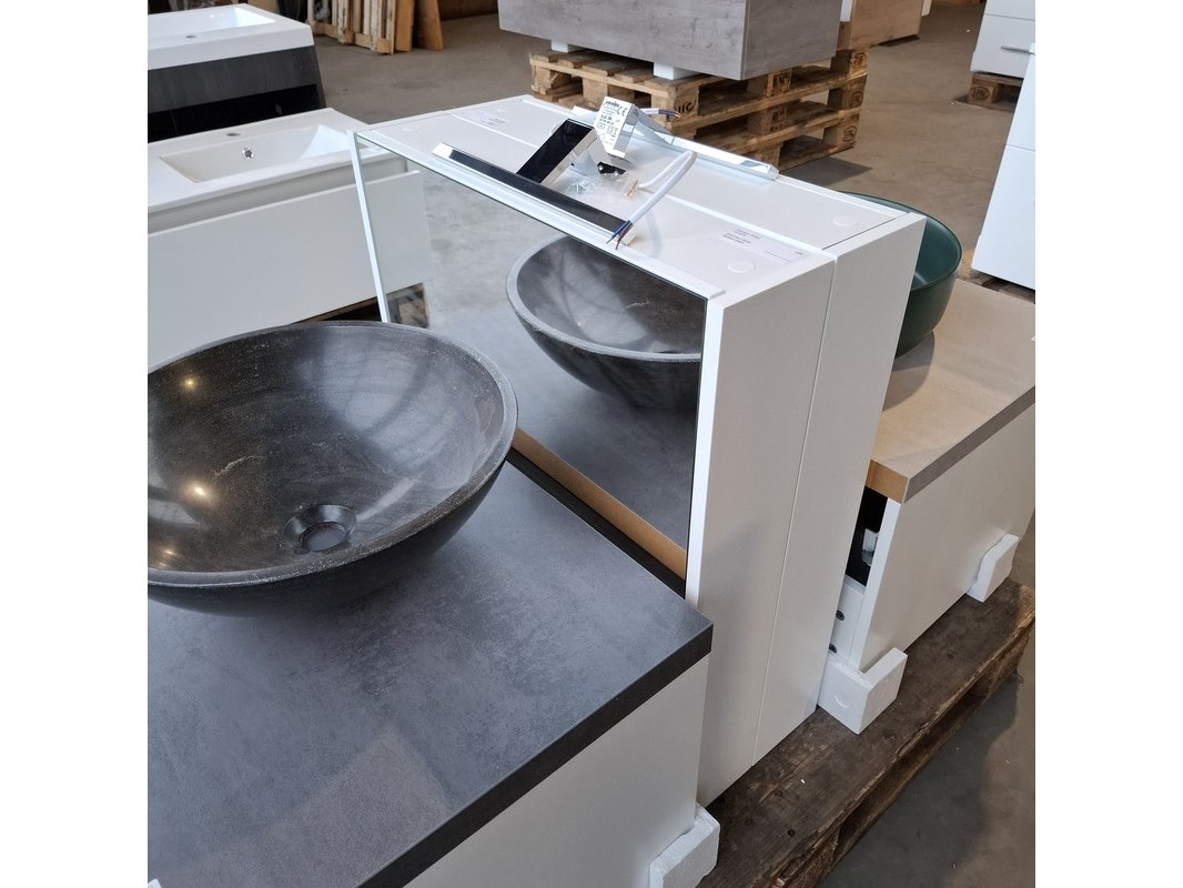 Merk: Dekker Product: Badmeubel Kleur: Matwit Afmeting: 65x50cm Specificaties: 1 lade met softclose, met Blum lade geleidesysteem, topblad, antraciet, waskom, hardsteen, gezoet antraciet, Ø40cm, spiegelkast, matwit, 1 deurtje met softclose, met spiegelkastverlichting