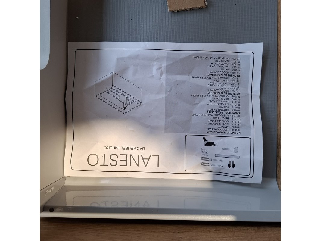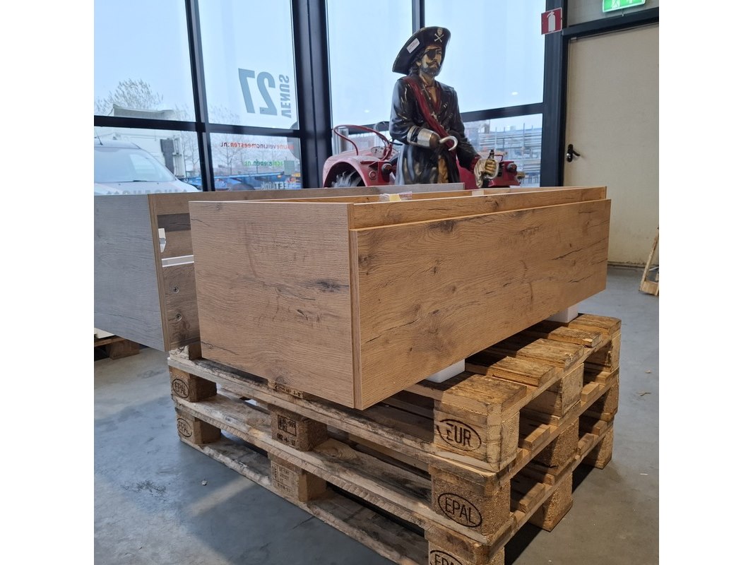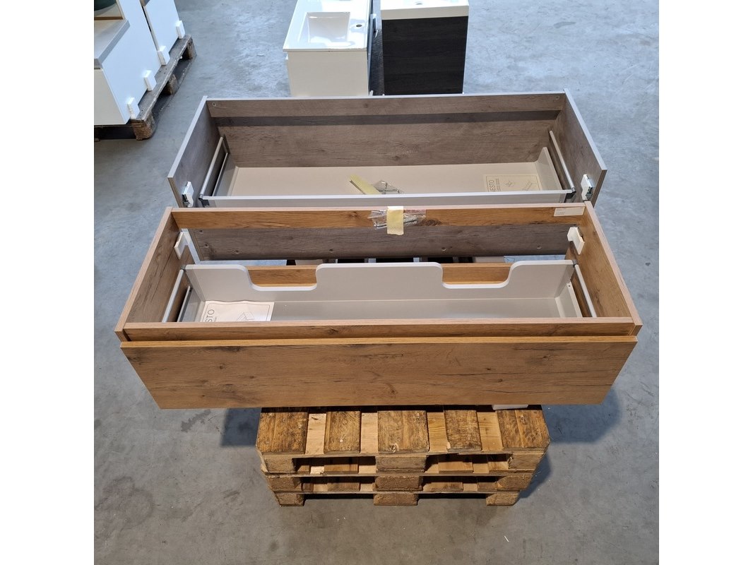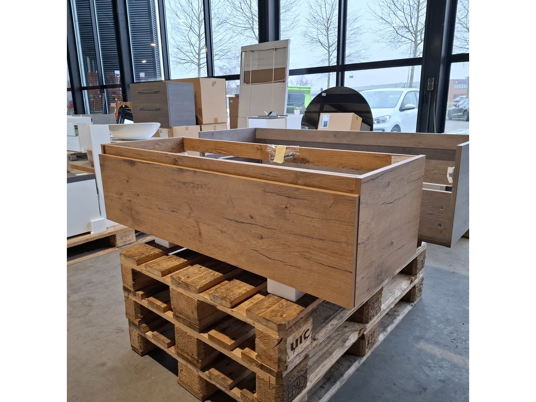 Merk: Dekker Product: Badmeubel Kleur: Lancelot oak Afmeting: 120x46cm Specificaties: 1 lade met softclose, met Blum lade- geleide systeem, voorbeeldmeubel, op afhaaldag staan de andere meubels gepalletteerd inoriginele verpakking klaar