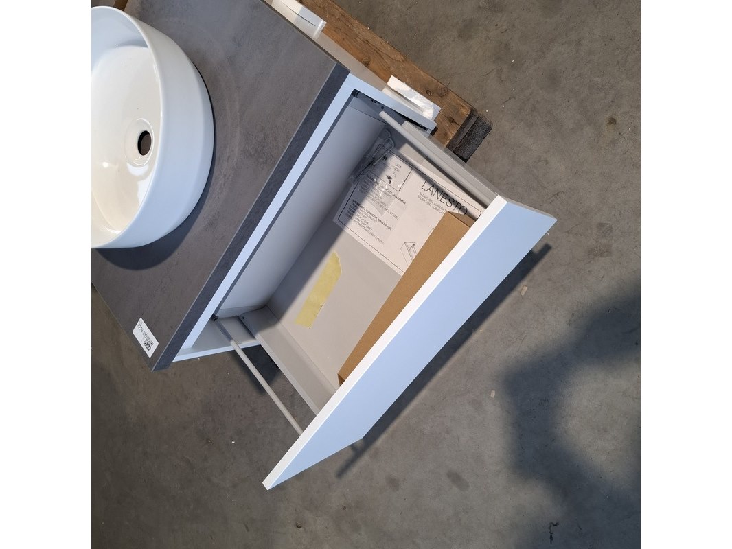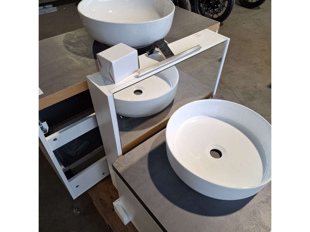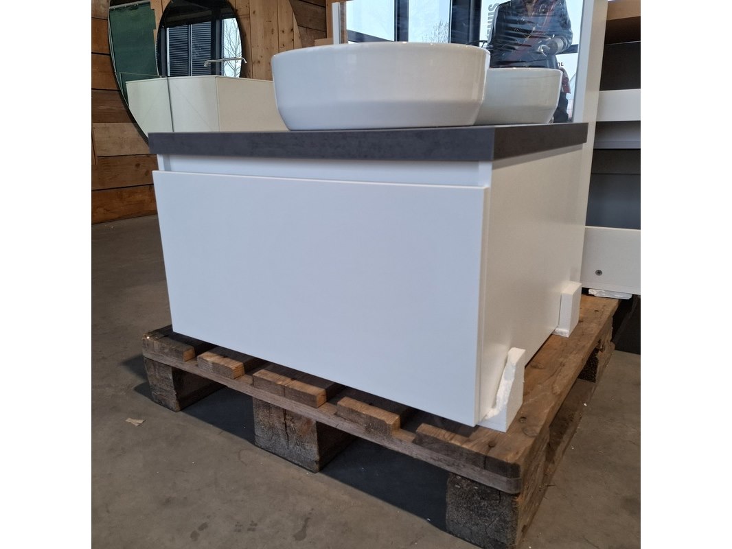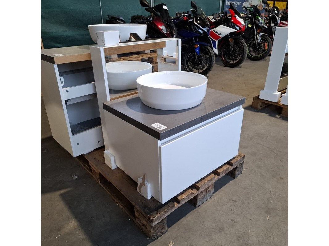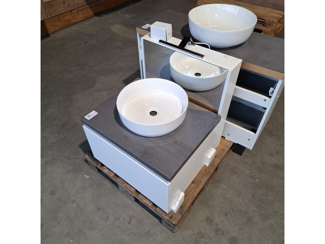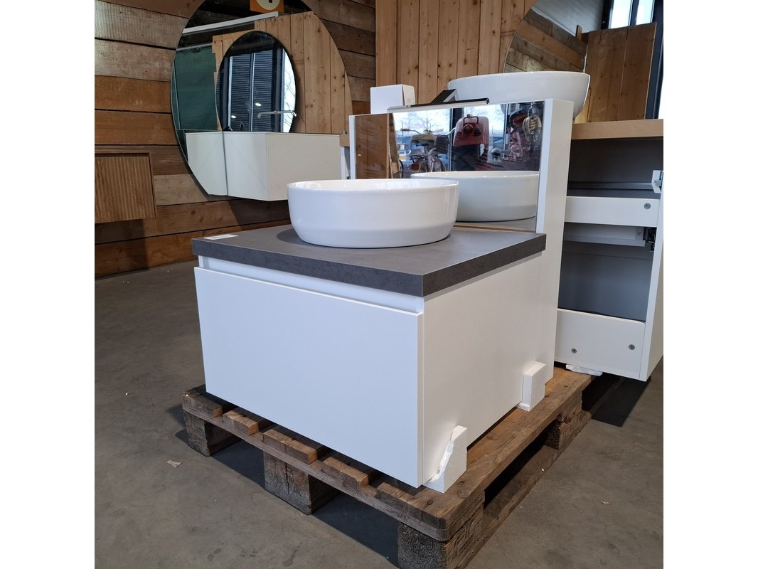 Merk: Dekker Product: Badmeubel Kleur: Matwit Afmeting: 65x50cm Specificaties: 1 lade met softclose, met Blum lade geleidesysteem, antracie, beton grijs, waskom, keramiek, glans wit, incl. click waste, glans wit, Ø40cm, spiegelkast, matwit, 1 deurtje met softclose, met spiegelkastverlichting