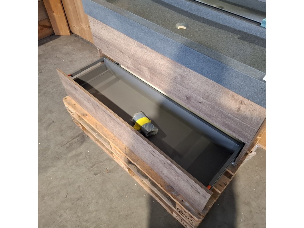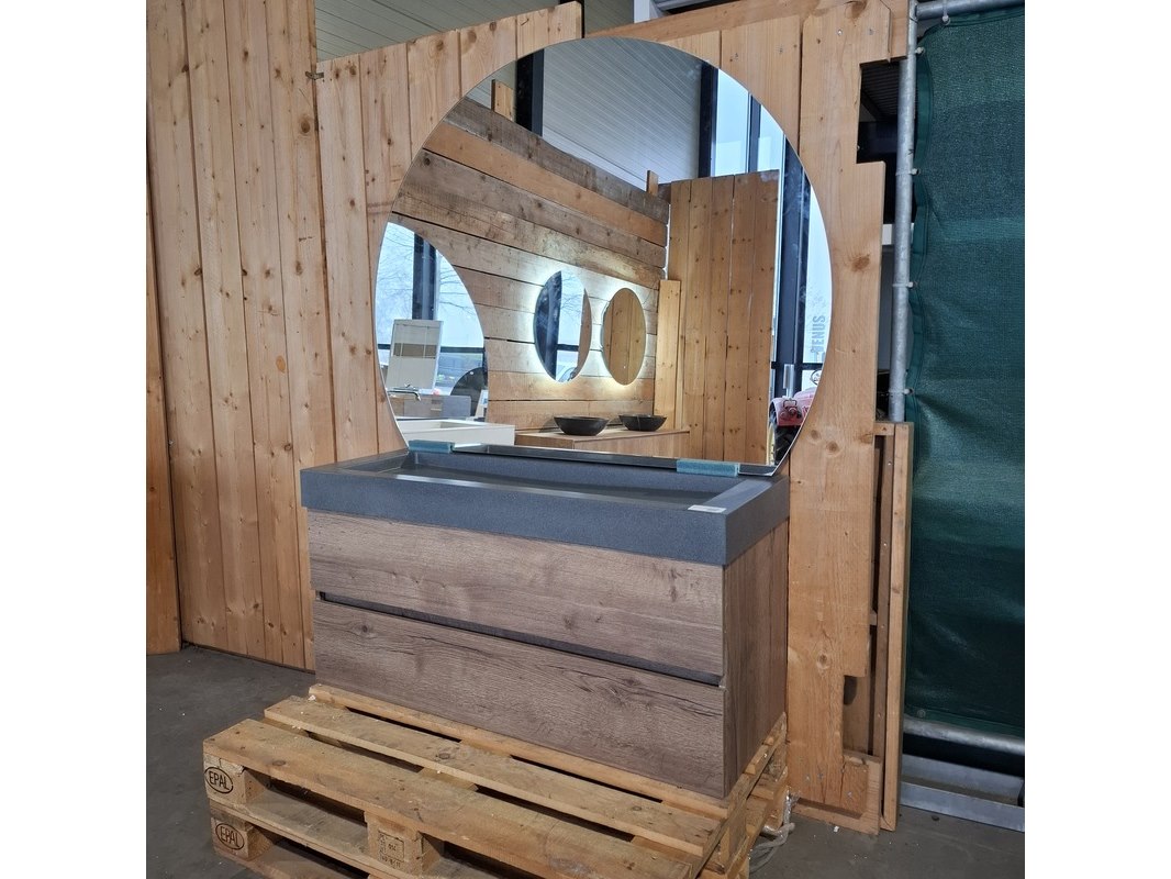 Merk: HR badmeubelen Product: Badmeubel Kleur: Tobacco Afmeting: 120x46cm Specificaties: 2 lades met softclose, met Blum lade-geleidesysteem, polybeton wastafel, mat antraciet, spiegel, MartensDesign, Horizon, 140x110cm, LED verlichting rondom, (dotless)