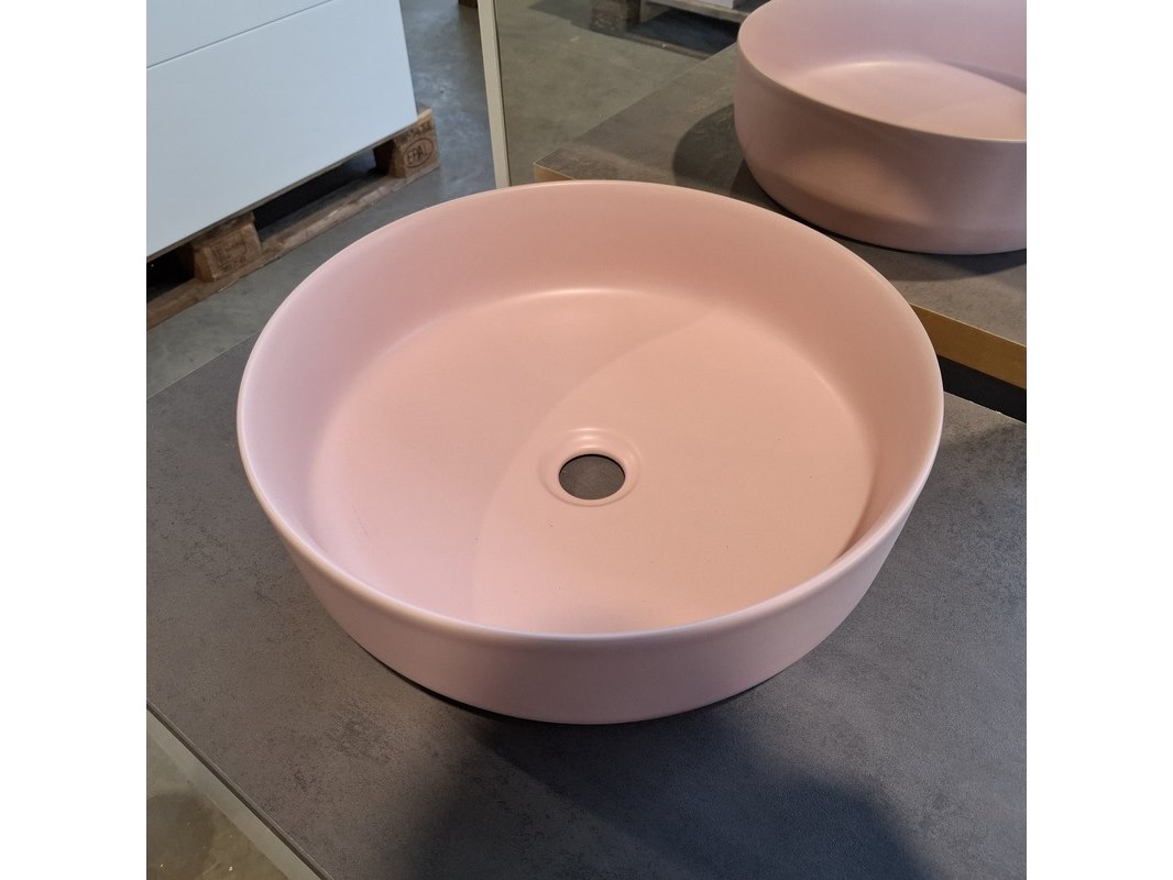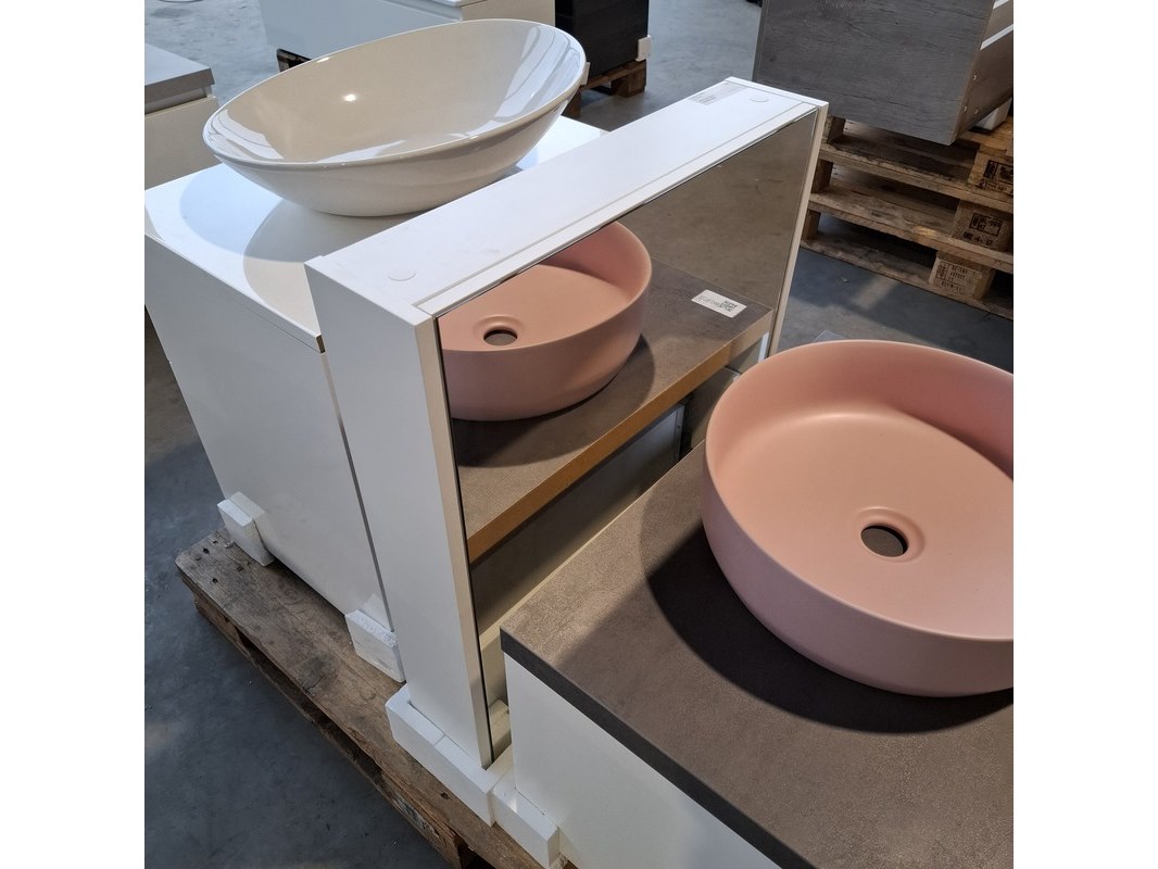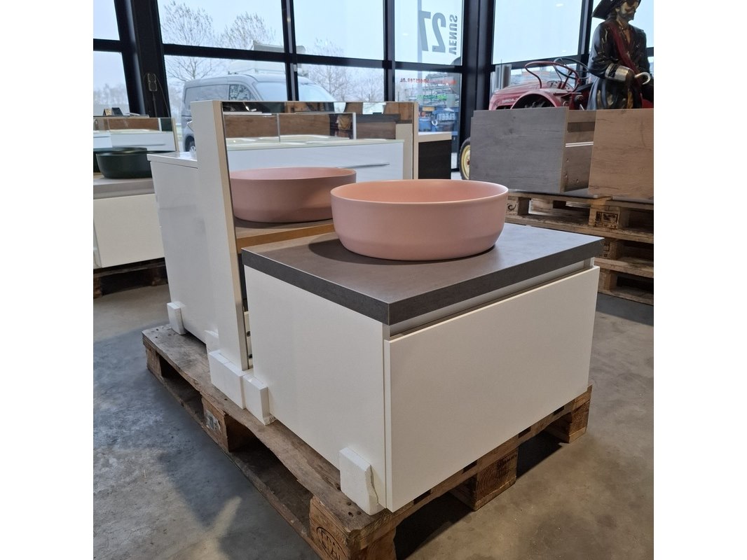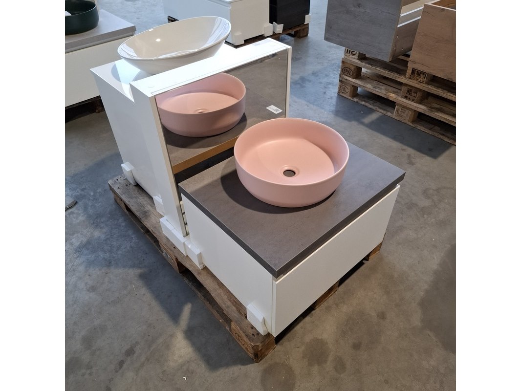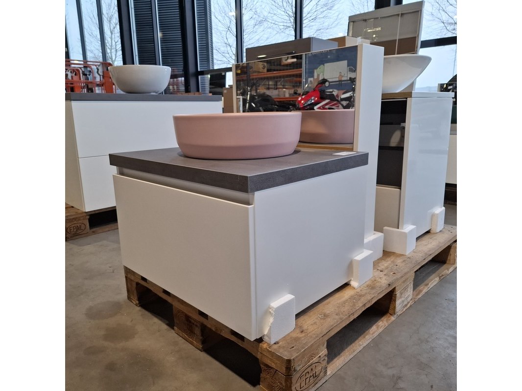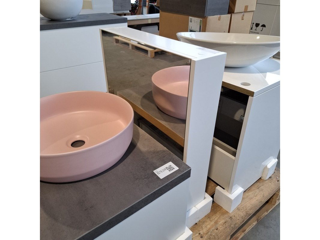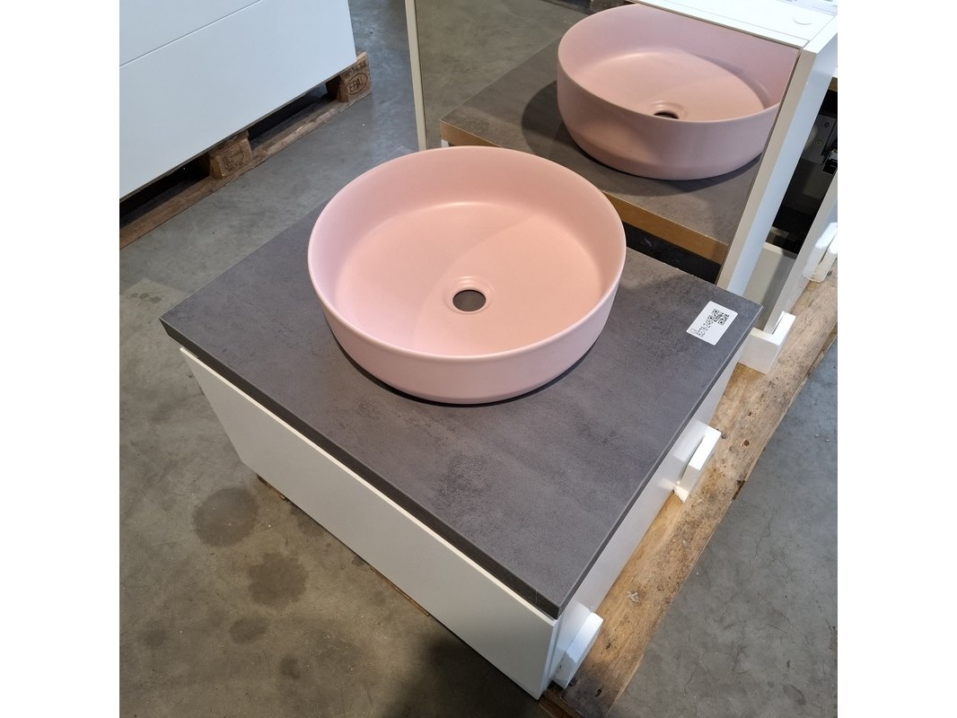 Merk: Dekker Product: Badmeubel Kleur: Mat wit Afmeting: 65x50cm Specificaties: 1 lade met softclose, met Blum lade geleidesysteem, topblad, antraciet, waskom, keramiek, mat roze, Ø40cm, click waste, mat roze, spiegelkast, mat wit, 1 deurtje met softclose, spiegelkastverlichting