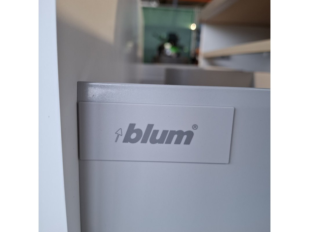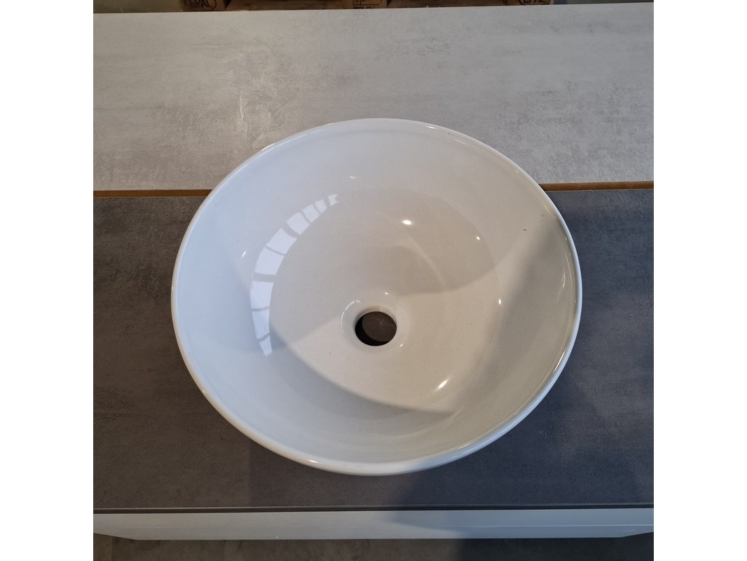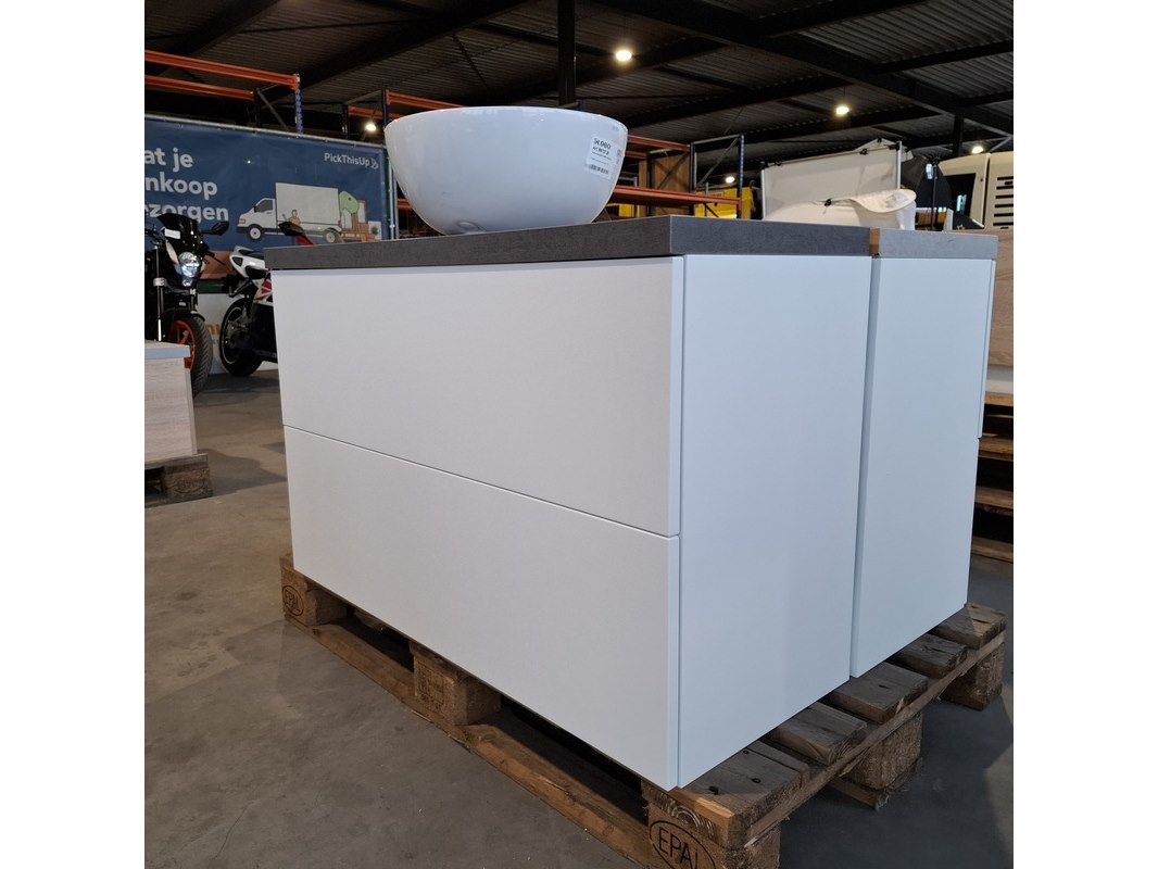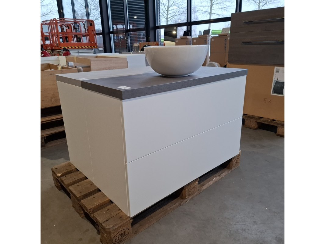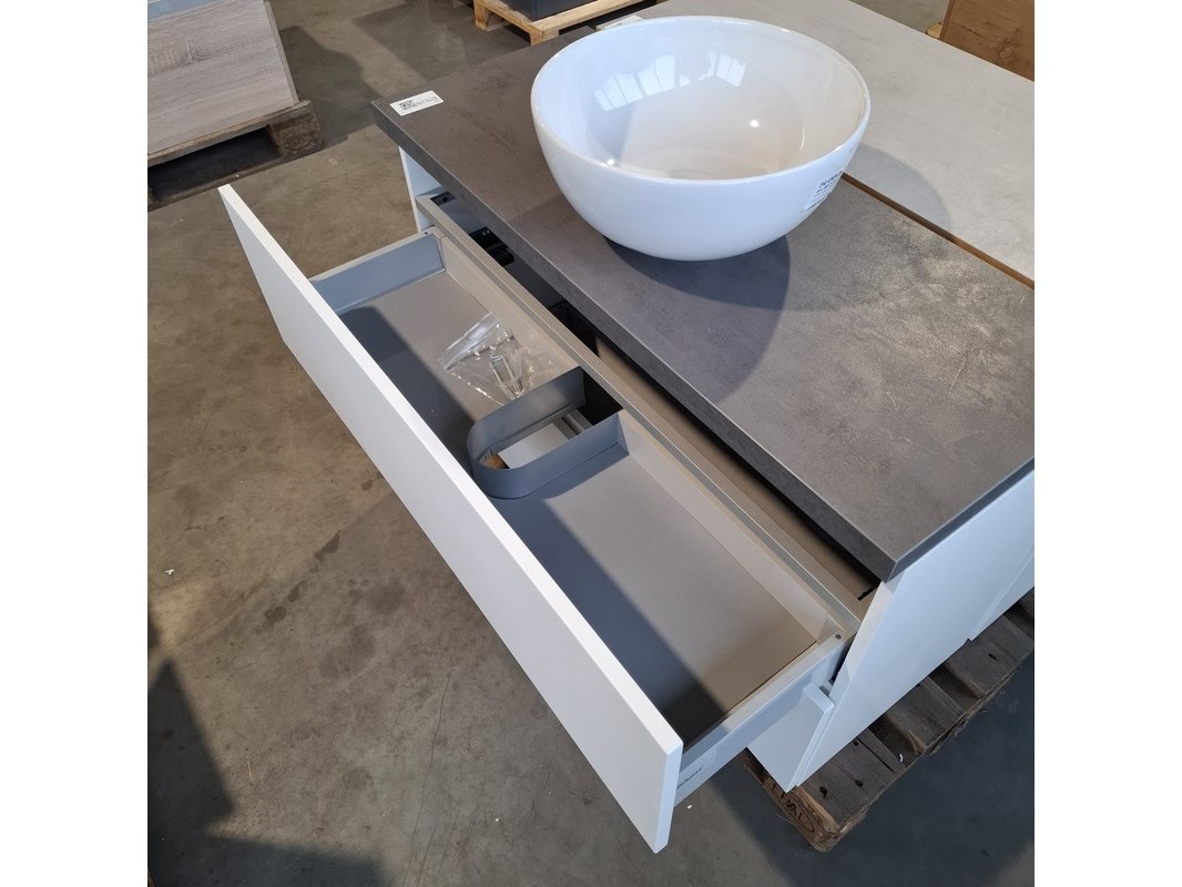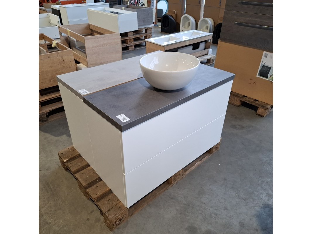 Merk: Dekker Product: Badmeubel Kleur: Mat wit Afmeting: 100x40cm Specificaties: 2 lades met softclose, met Blum lade-geleidesysteem, push to open systeem, topblad, antraciet, keramische waskom, Ø40cm, glans wit