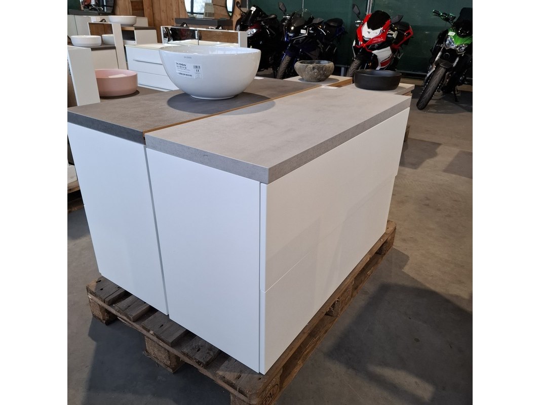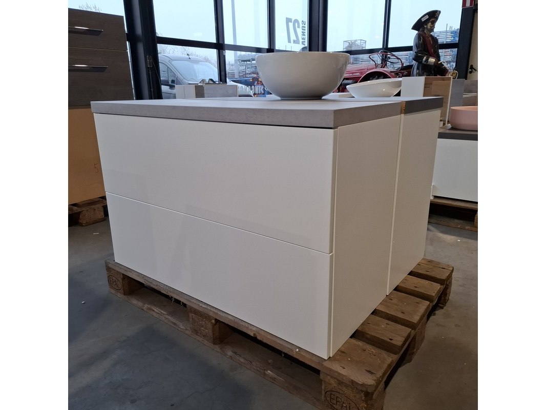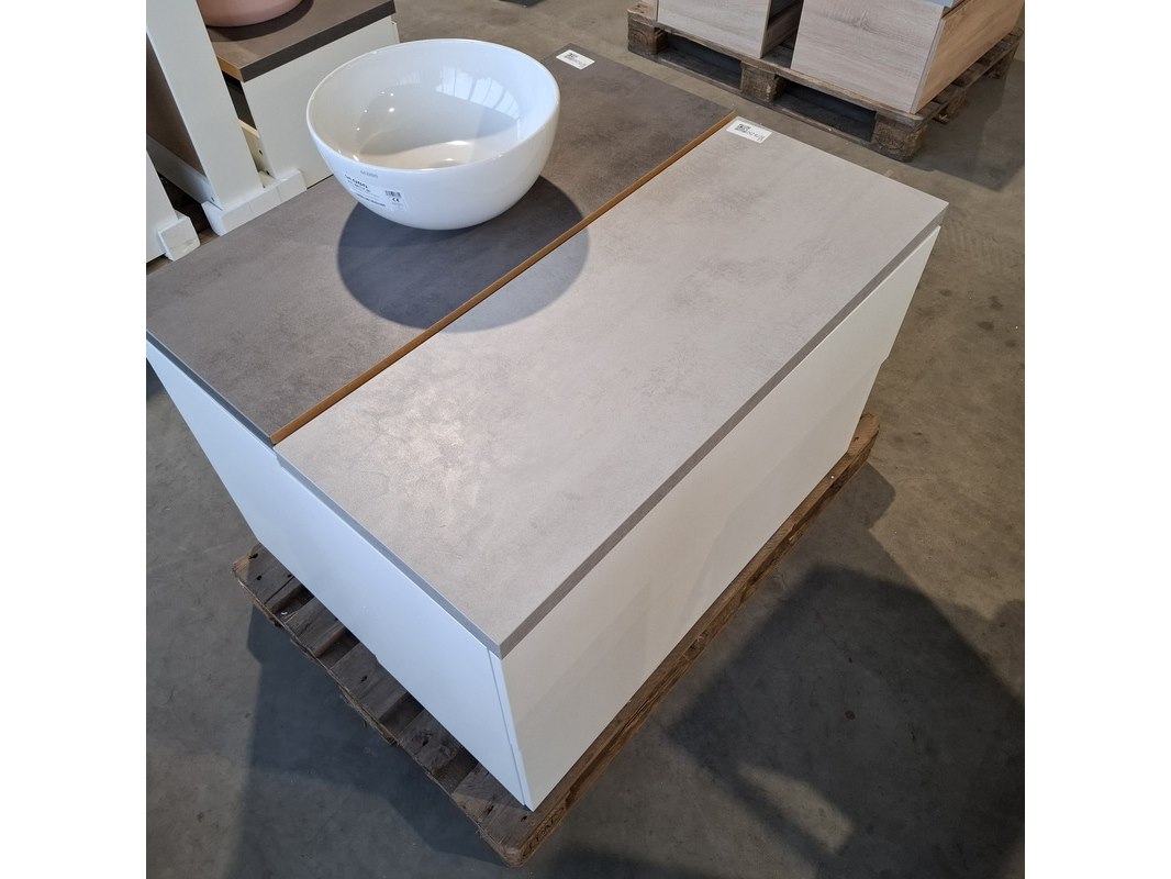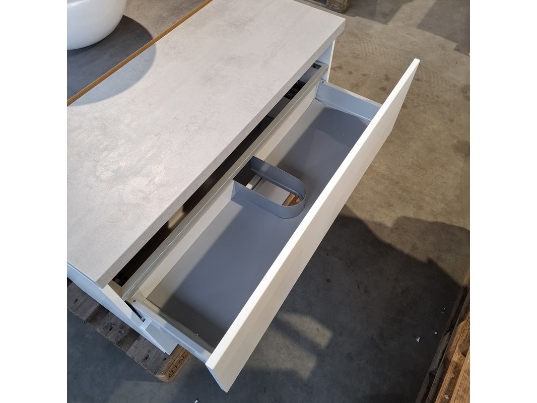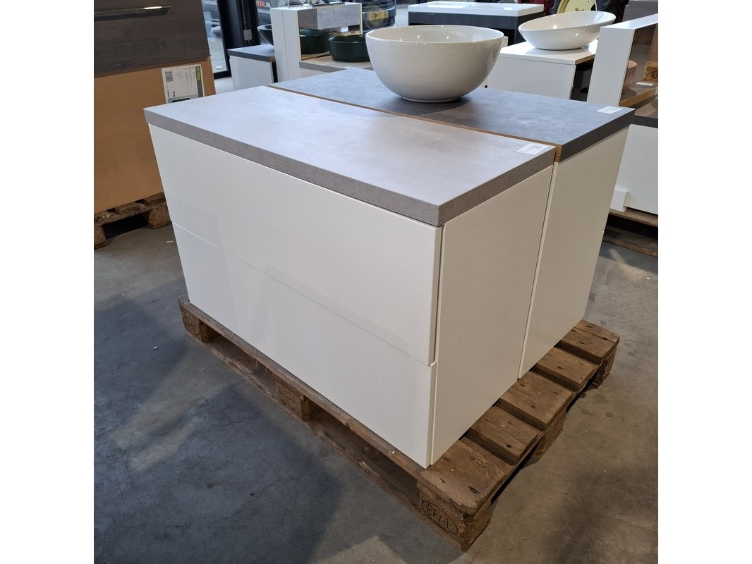 Merk: Dekker Product: Badmeubel Kleur: Mat wit Afmeting: 100x40cm Specificaties: 2 lades met softclose, met Blum lade-geleidesysteem, push to open systeem, topblad, beton grijs