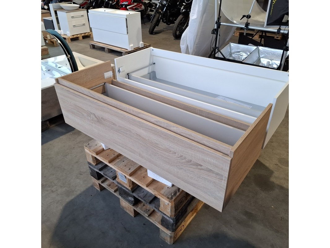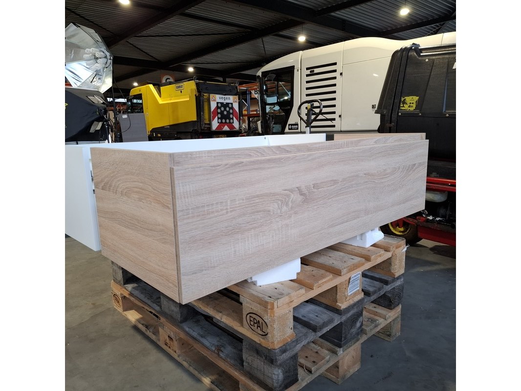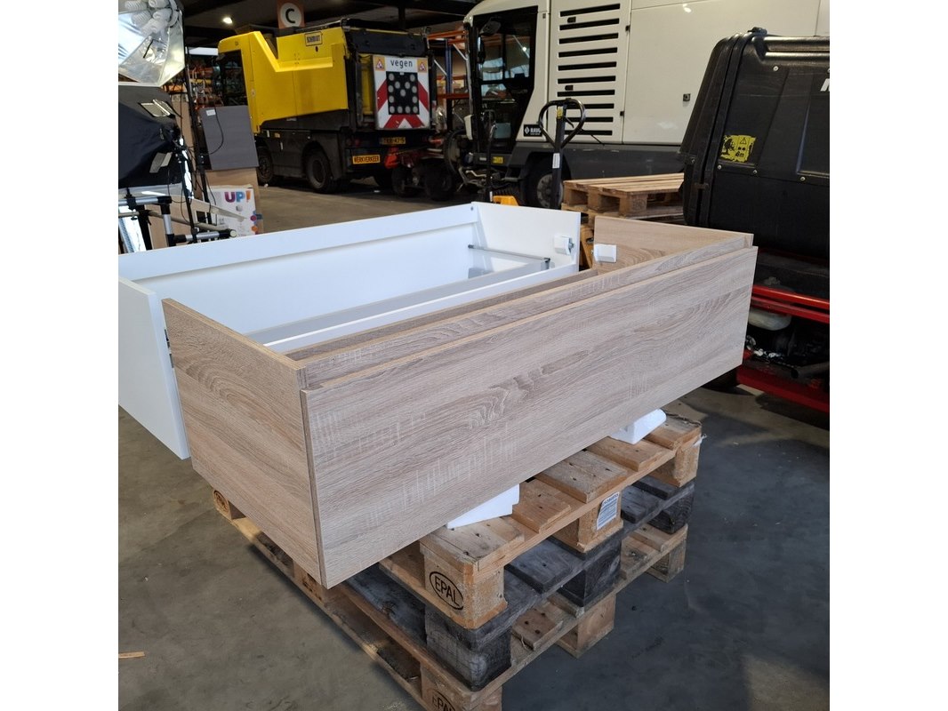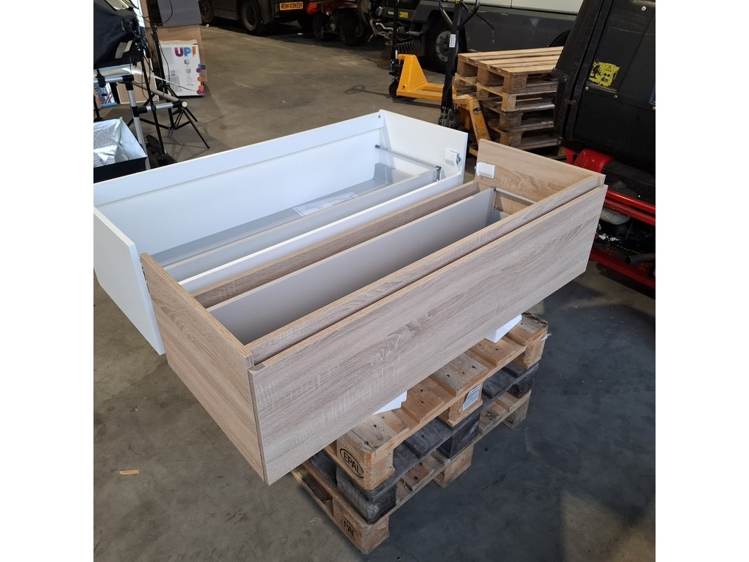 Merk: Dekker Product: Badmeubel Kleur: Beach oak Afmeting: 130x50cm Specificaties: 1 lade met softclose, met Blum lade- geleide systeem, voorbeeldmeubel, op afhaaldag staan de andere meubels gepalletteerd inoriginele verpakking klaar