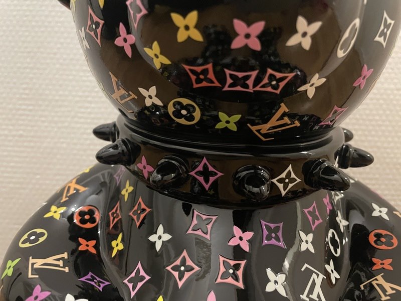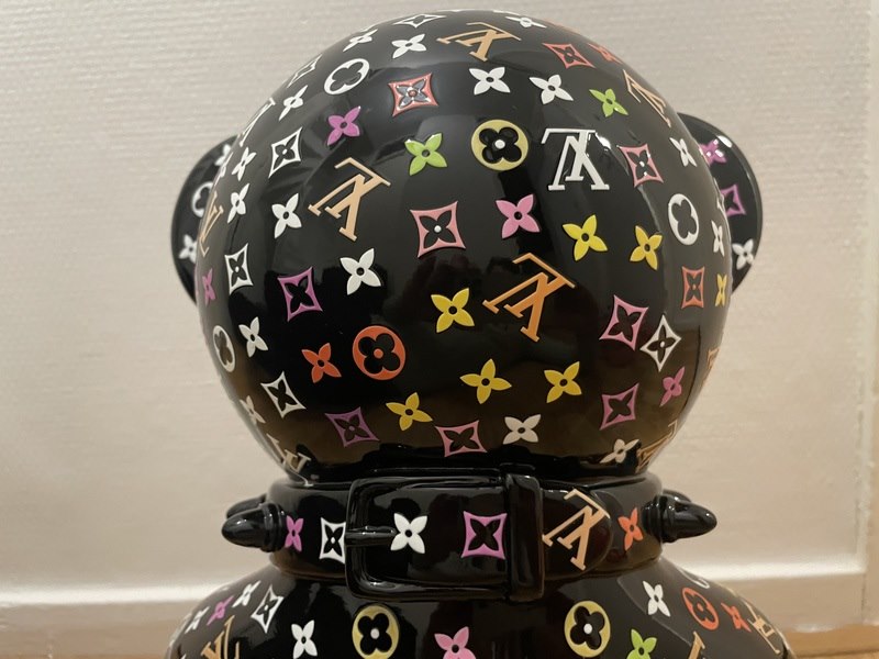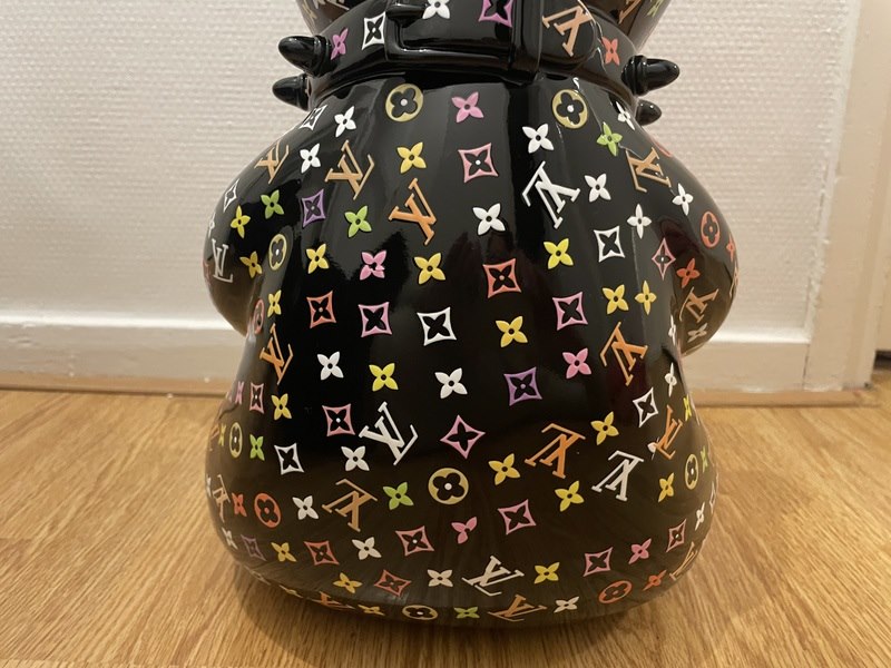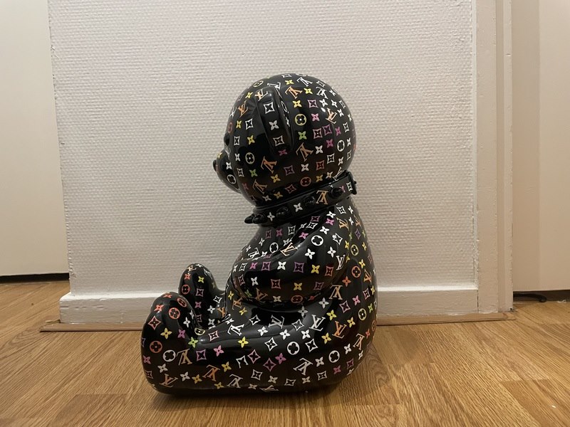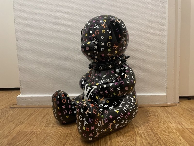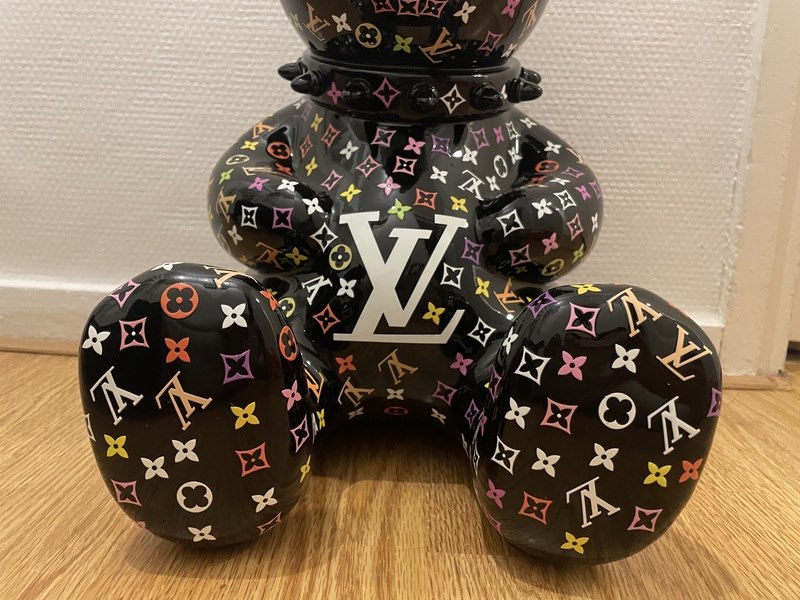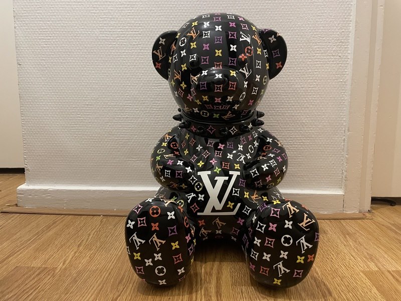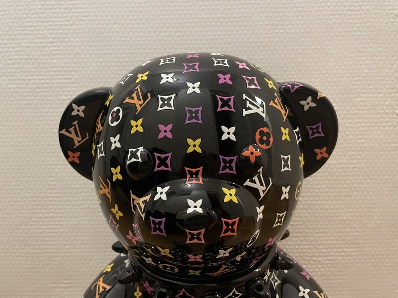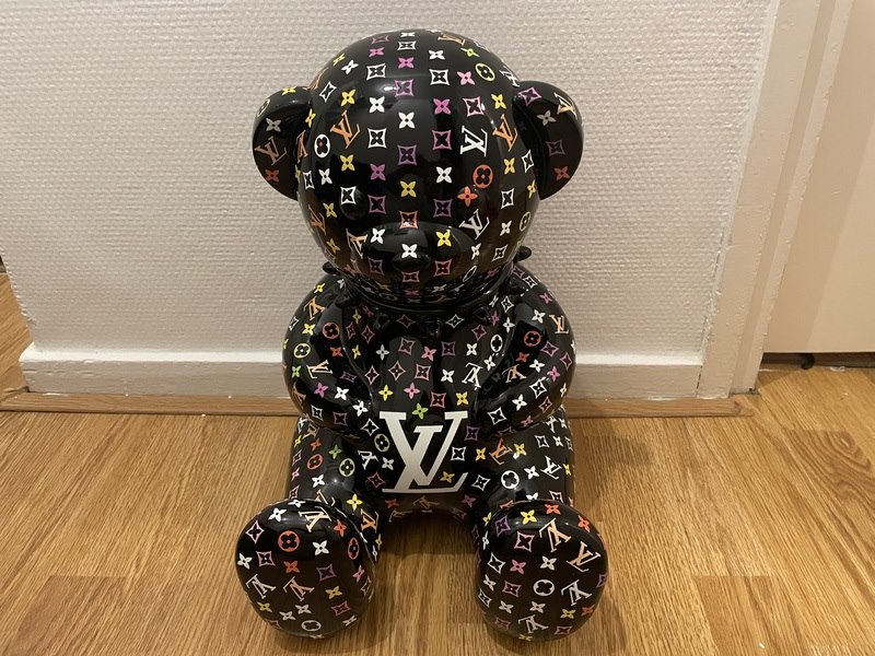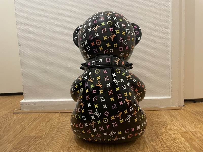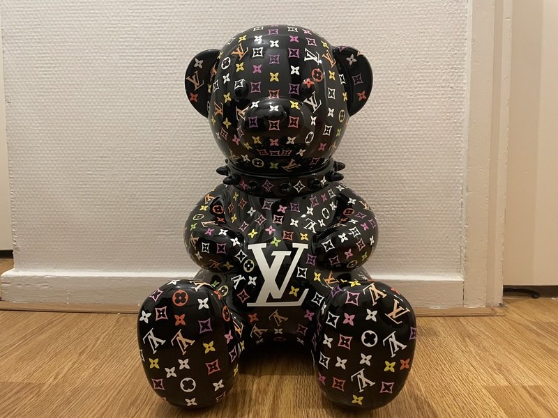Merk: LV Product: Bad Beer Materiaal: Fiberglass Afmeting: 40cm hoog, 30cm breed, 30cm diep Conditie: Nieuw Specificaties: Zwarte beer met Louis Vuitton logo's in verschillende kleuren.