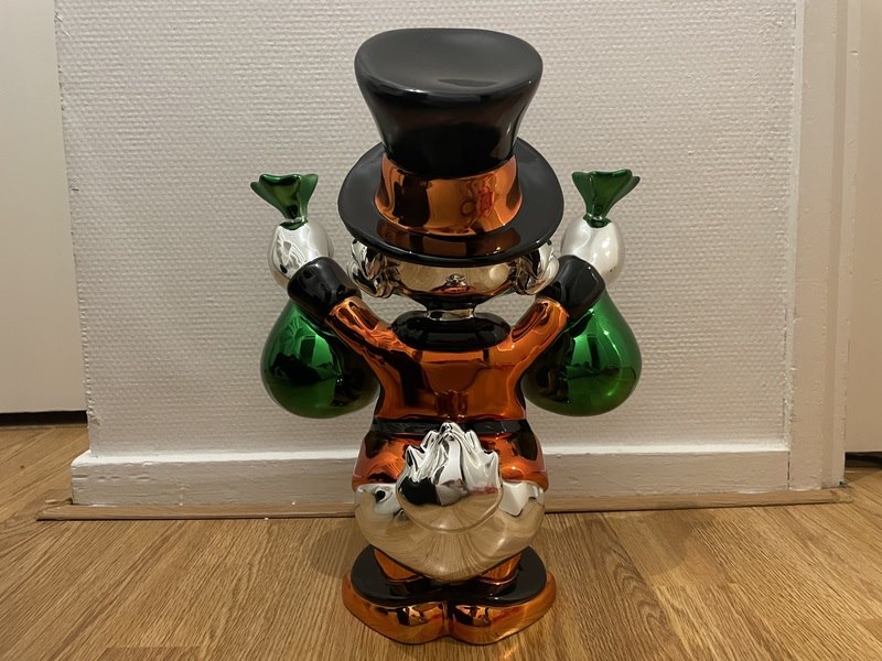 Product: Dagobert Duck sculptuur Materiaal: Gemalen steen gemengd met hars Afmeting: 45cm hoog, 30cm breed Conditie: Nieuw