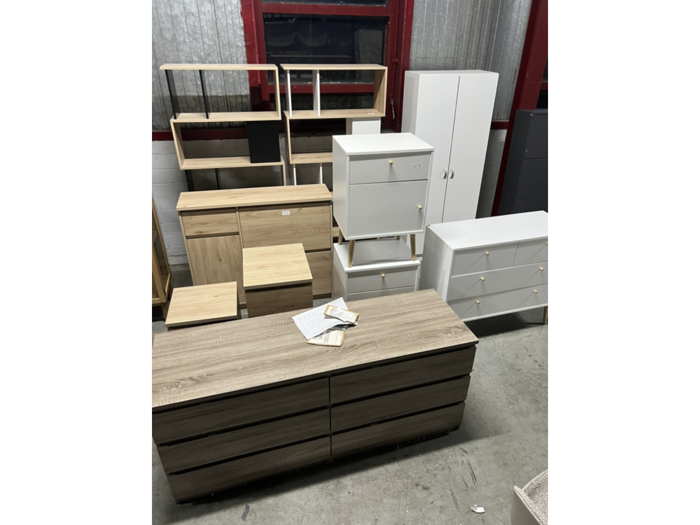 Merk: Byfonq Product: Mixpartij kasten en opbergers Conditie: Nieuw Specificaties: Diverse kasten; kledingkasten, schoenenkasten, nachtkastjes, boekenkasten enz. 10 items.