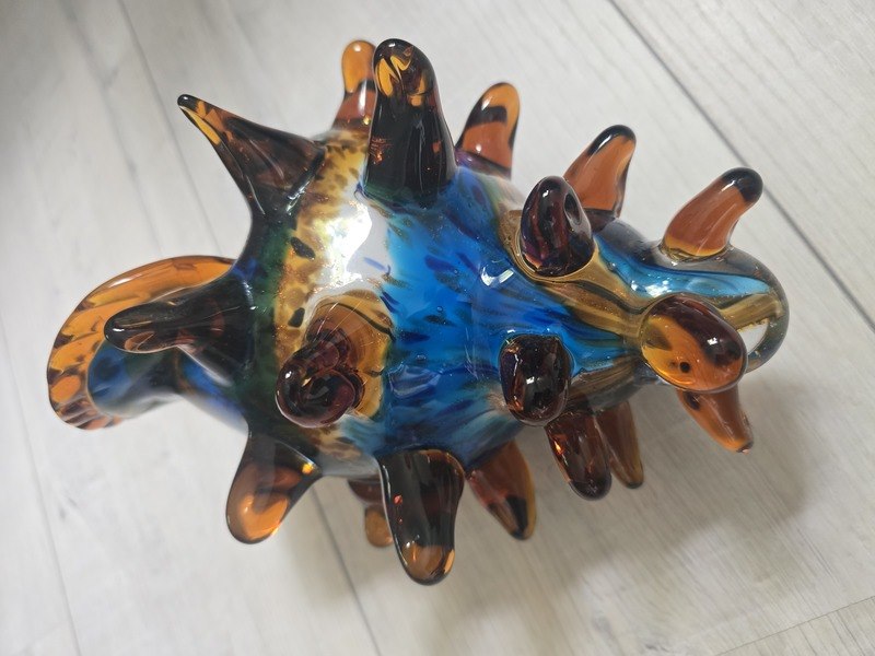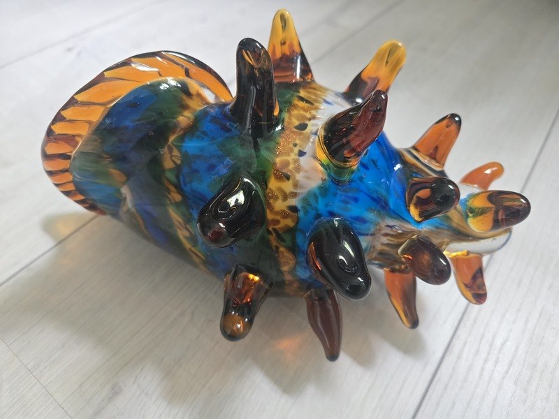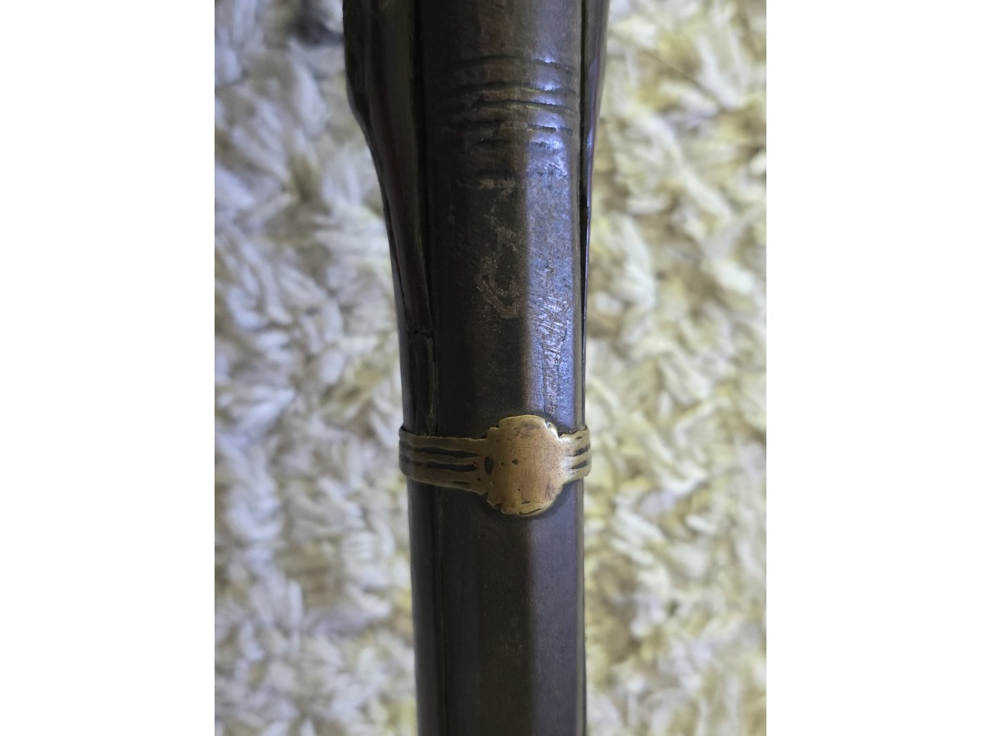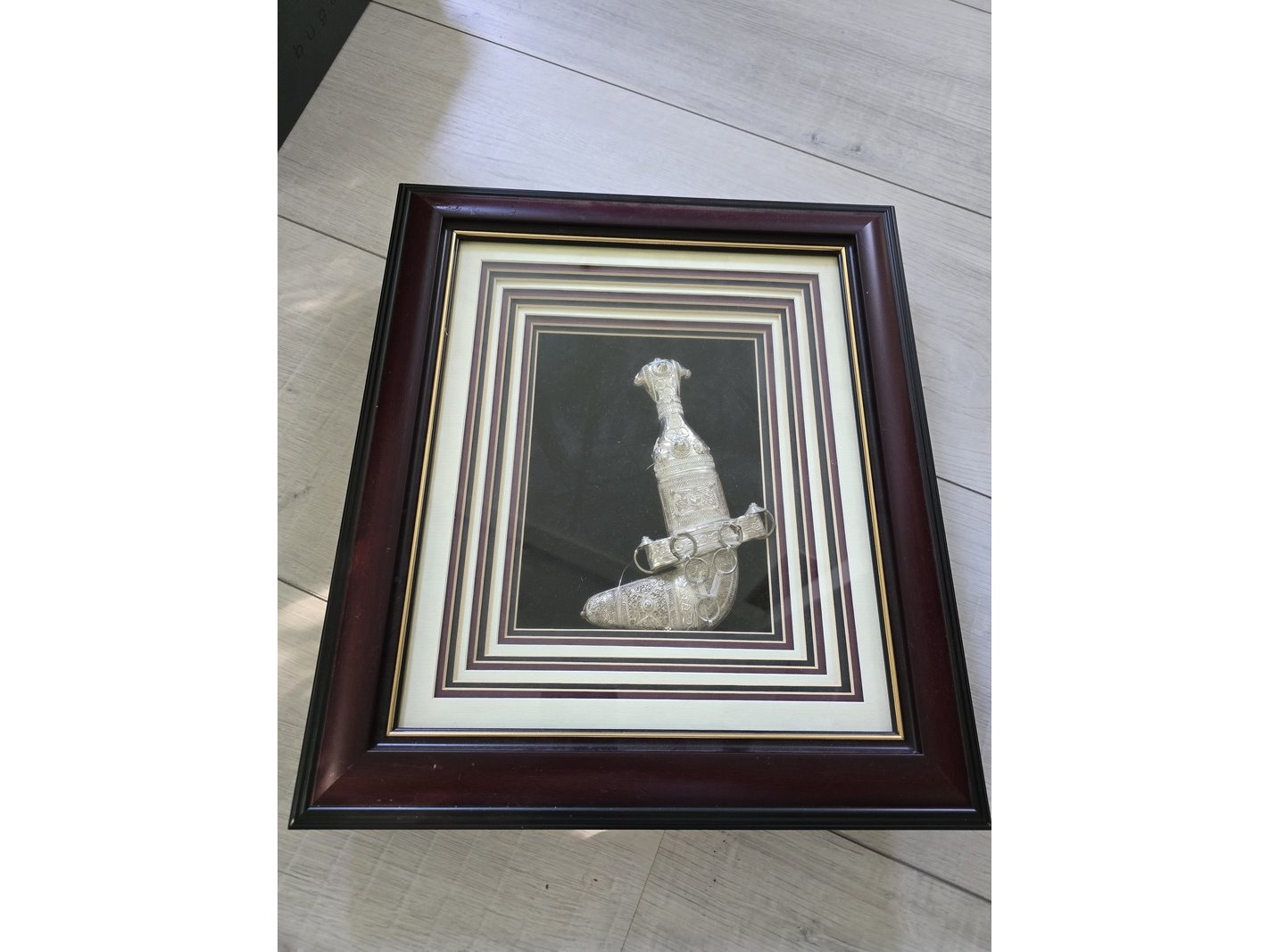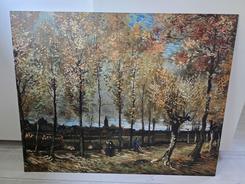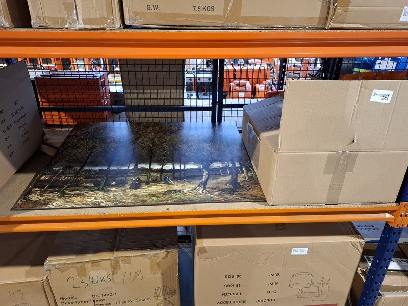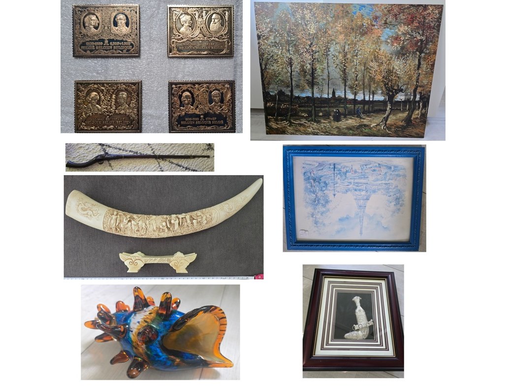 Product: Verzameling diverse objecten Specificaties: 4x Massief belgische postzegels met 925 druk Ingelijst dolk Oud geweer Kunststof slagtand met houder (mogelijk uit Japan) Glazen schelp Murano stijl Groot schilderij Populierenlaan bij Nuenen’ van Vincent van Gogh (Aluminium)