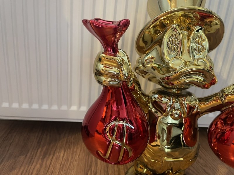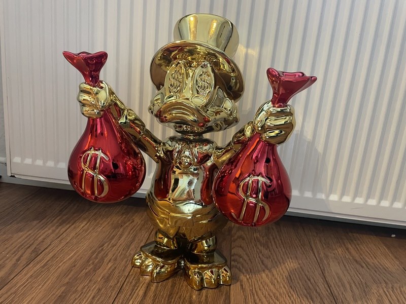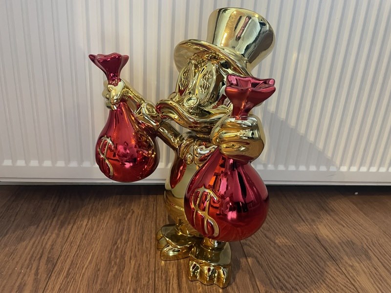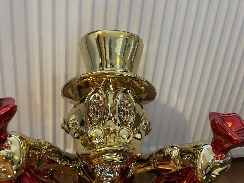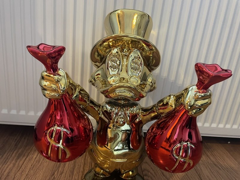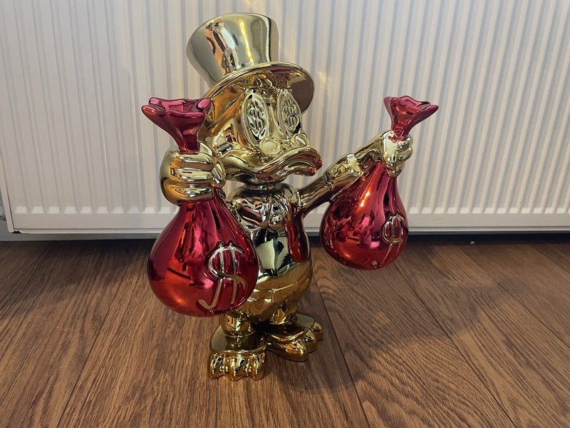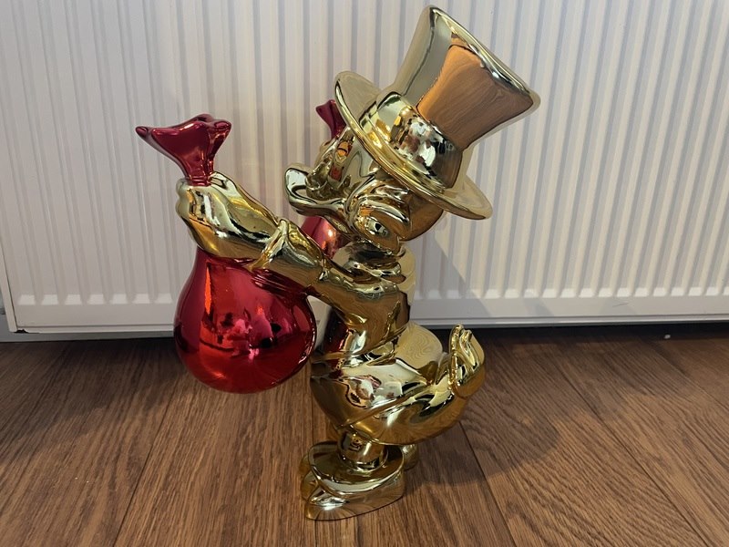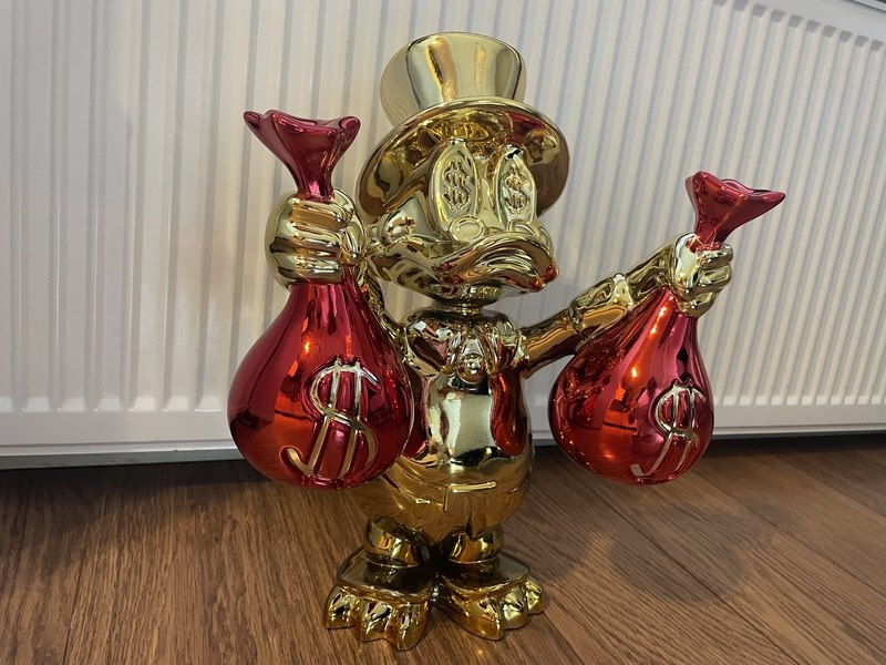 Product: Dagobert Duck sculptuur Materiaal: Gemalen steen gemengd met hars Afmeting: 45cm hoog, 35cm breed Conditie: Nieuw