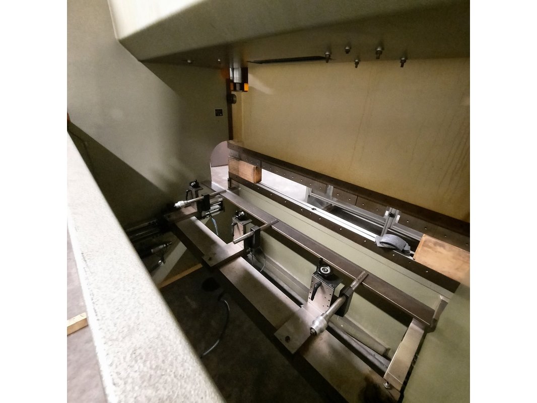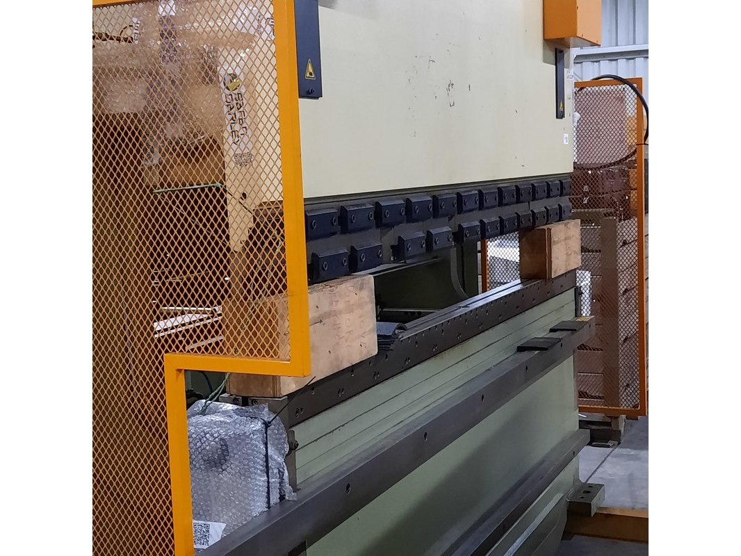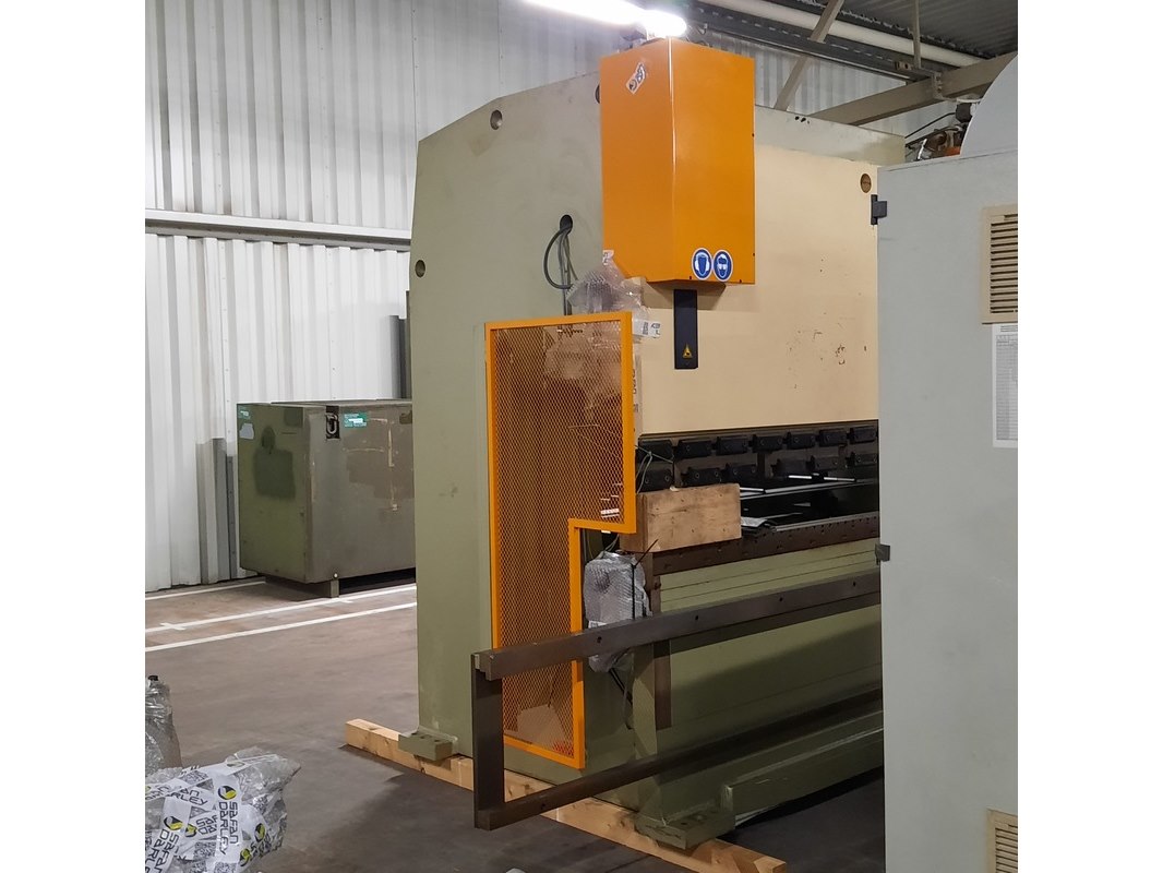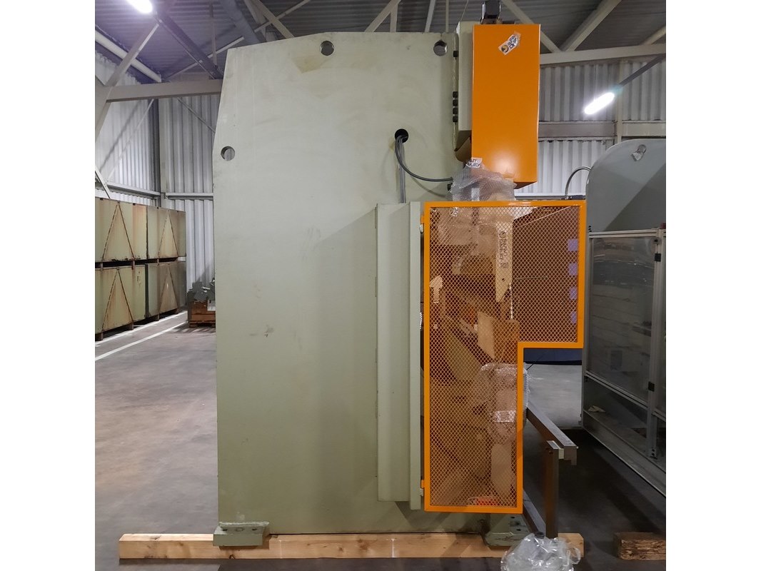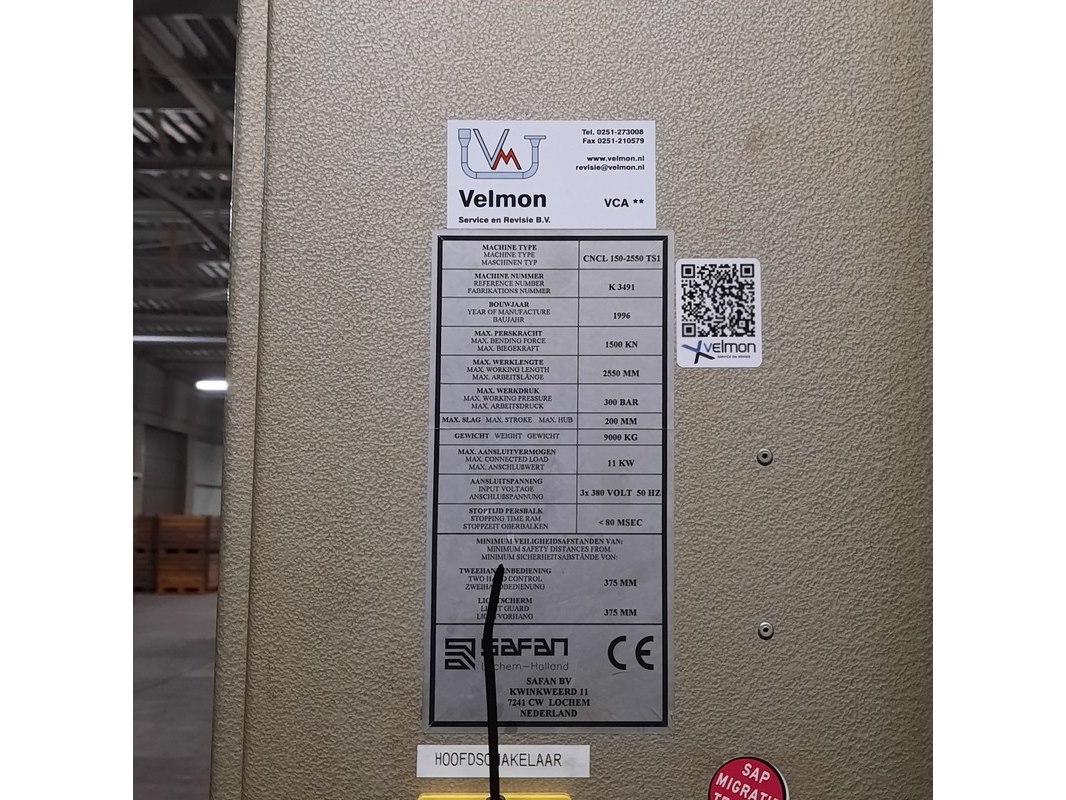 Merk: Safan Product: Kantenbank Afmeting: LxBxH ca. 350x180x260 cm. BouwJaar: 1996 Conditie: gebruikt Specificaties: Perskracht ca. 1500 kN Werklengte ca. 2550 mm Werkdruk ca. 300 BAR Gewicht ca. 9000 Kg. 11 kW 3x380V 50 Hz Technische staat en compleetheid onbekend. Diverse onderdelen zijn gedemonteerd en liggen er los bij.