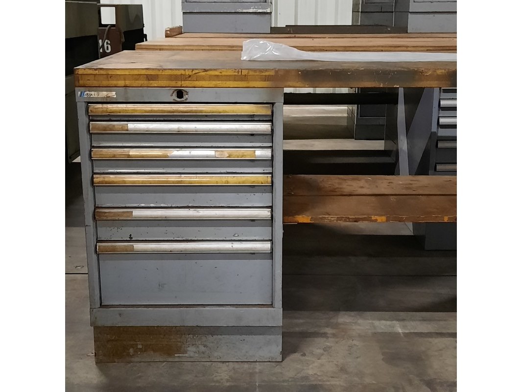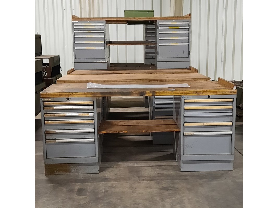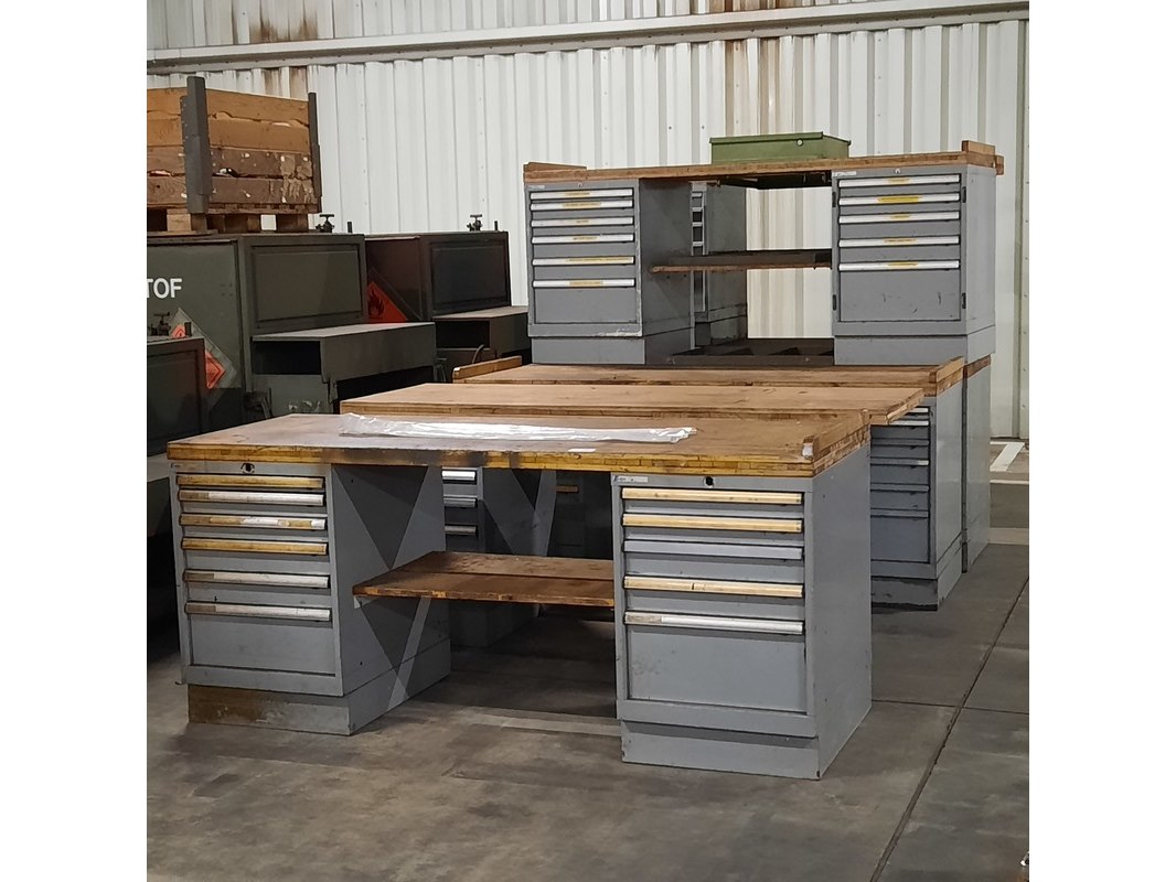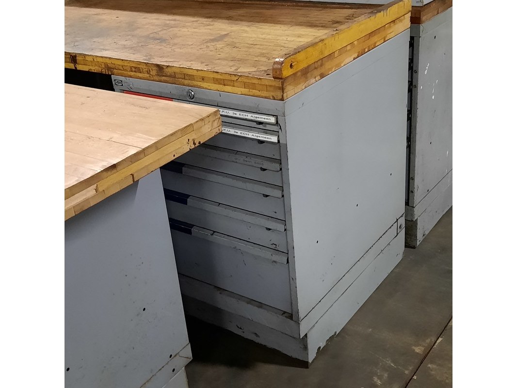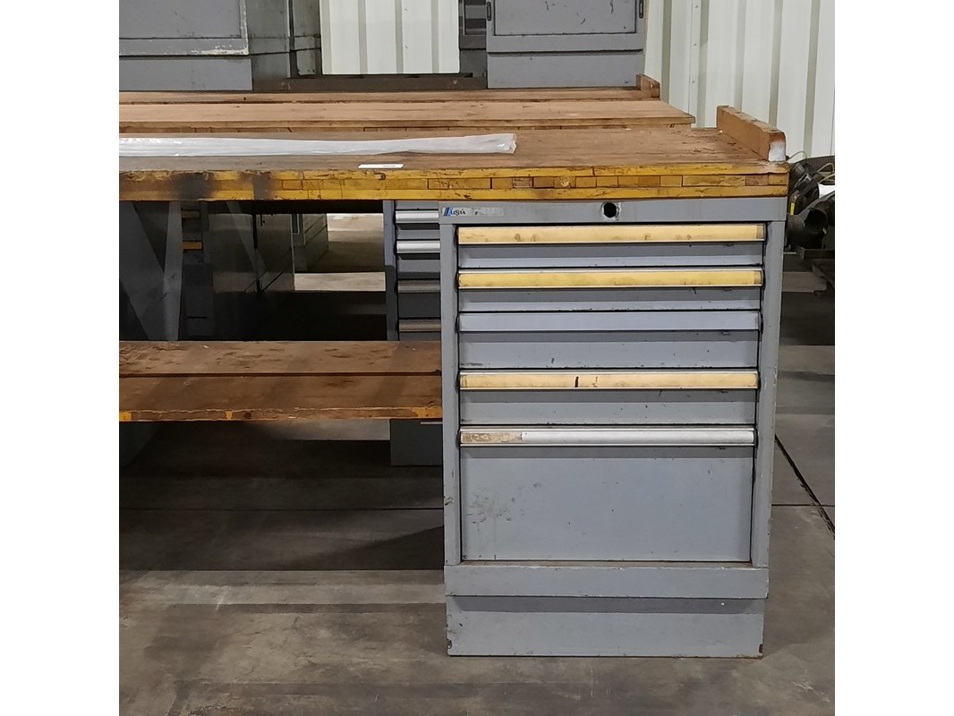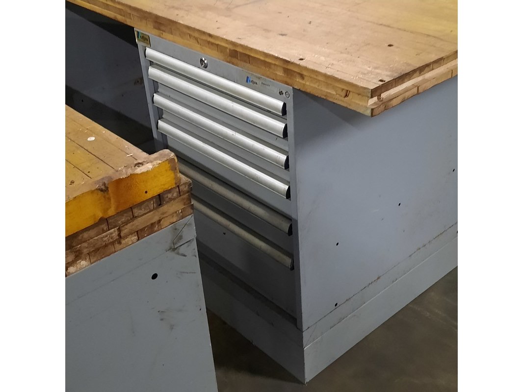 Merk: Lista Product: Werkbank Afmeting: LxBxH ca. 200x73x89 cm. Conditie: gebruikt Specificaties: De werkbanken hebben diverse beschadigingen en gebreken. Exclusief sleutels t.b.v. kastjes. Technische staat en compleetheid onbekend.
