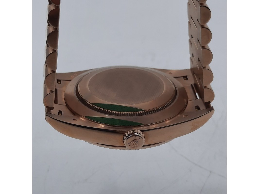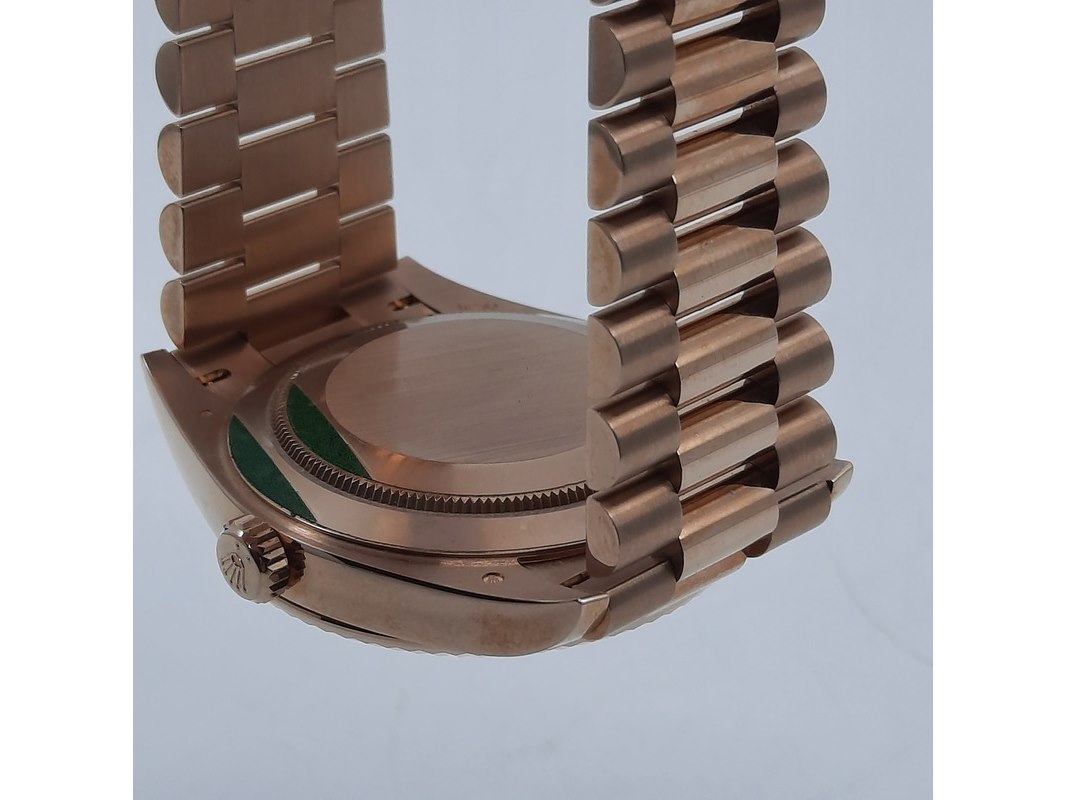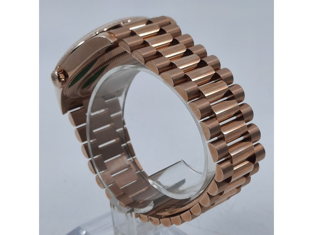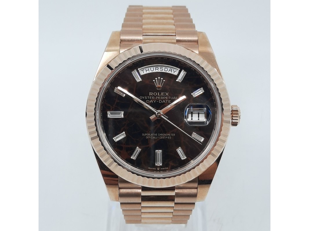 Merk: Rolex Product: Heren polshorloge Conditie: Gebruikt Specificaties: Een roségouden heren polshorloge, Rolex Day-Date (40) 228235. Met Eisenkiesl wijzerplaat, diamant baguette indices en roségouden President model band. Gehalte 'AU750', bruto gewicht ca. 203,6 gram. Inclusief doos en certificaat. Documentatie van 10-01-2022.