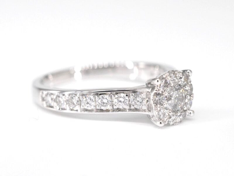 Product: Witgouden entourage ring met diamanten Specificaties: Diamant: Natuurlijk Slijpvorm: Briljant geslepen Gewicht (carat): 1.00 carat Kleur: F-G Zuiverheid: SI-P Slijpkwaliteit: Zeer mooi Juweel: Ring Gewicht: 3.40 gram Ringmaat (op maat gemaakt*): 54 (17.25 mm) Materiaal: 14k goud (585) Conditie: Nieuw Verpakking: Luxe sieradendoos Toelichting: De kwaliteit is overgenomen van het rapport behorend bij item. De waardebepaling is een beoordeling van een gecertificeerde diamantair, gebaseerd op consumentenprijzen. Consumentenprijs: € 3.850,- *Ringen kunnen als het mogelijk is op maat gemaakt worden.