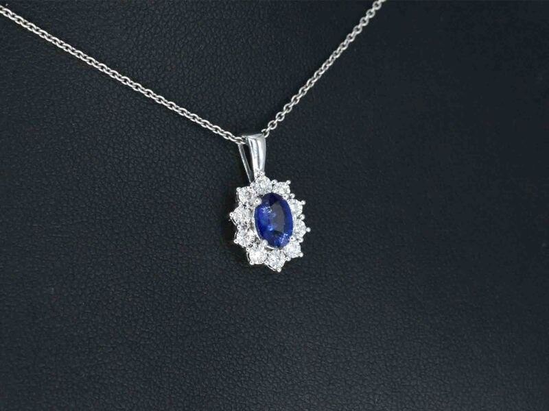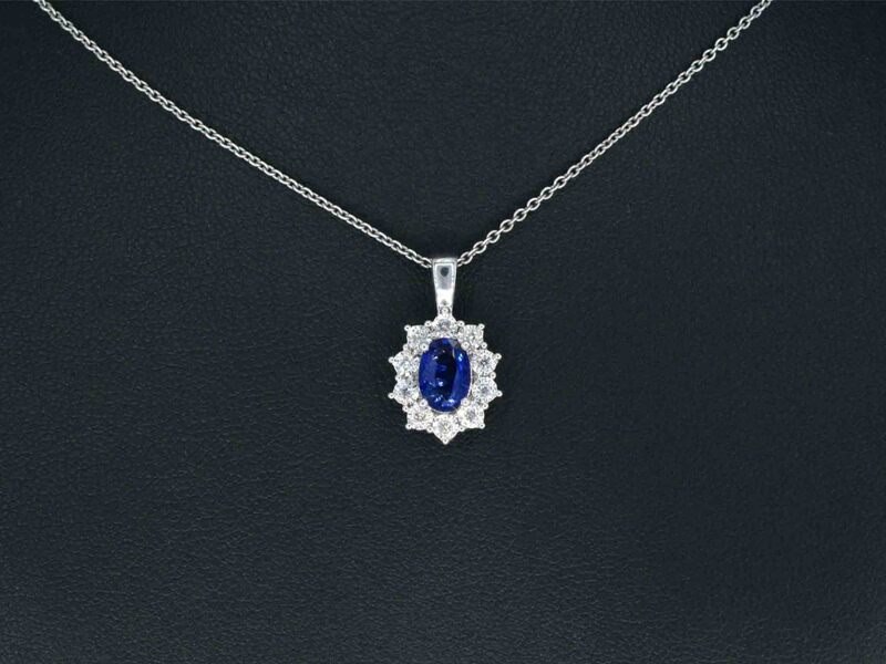 Product: Witgouden entourage hanger met diamanten en saffier Specificaties: Diamant: Natuurlijk Aantal: 10 stuks Slijpvorm: Briljant geslepen Gewicht (carat): 0.15 carat Kleur: F-G Zuiverheid: SI-P Slijpkwaliteit: Zeer mooi Edelsteen: Saffier Slijpvorm: Ovaal geslepen Gewicht (carat): 0.75 carat Kleur: Blauw Juweel: Hanger (excl. ketting) Gewicht: 1.5 gram Afmetingen/lengte: 1.6 x 0.9 cm Materiaal: 14 karaat (585) Conditie: Nieuw Verpakking: Luxe sieradendoos Toelichting: De kwaliteit is overgenomen van het rapport behorend bij item. De waardebepaling is een beoordeling van een gecertificeerde diamantair, gebaseerd op consumentenprijzen. Consumentenprijs: € 1.540,-