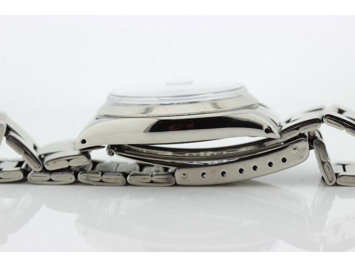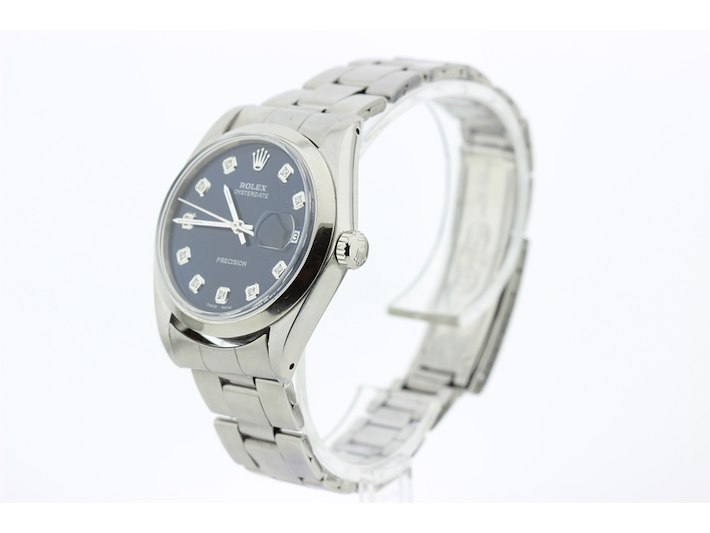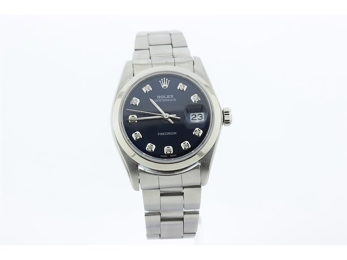 Merk: Rolex Product: Heren polshorloge Kleur: blauwe wijzerplaat Materiaal: RVS Afmeting: 34 mm. BouwJaar: 1985 Conditie: gebruikt Specificaties: Rolex Oysterdate precision met blauwe nieuw opgemaakte wijzerplaat met stalen folded link oysterband in goede staat. Gladde bezel, nieuw plexiglas en revisie door eigen horlogemaker. Loopt perfect -5 seconden per dag. Waterdicht getest tot 3 atm. Wij garanderen de echtheid ervan uitdrukkelijk, en u kunt deze bij een Rolex verkoper laten verifiëren. Waterdichtheid niet gegarandeerd mits vermeld. Inclusief originele Rolex reisverpakking en eigen certificaat van echtheid. Serienummer: 8652933 Functies: Uur, minuut en datum Lunette: stalen gladde bezel Uurwerktype: mechanisch, kaliber 1225 Hoogte: 11 mm Polsomvang: 17 cm