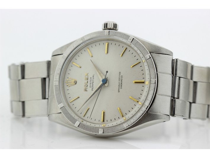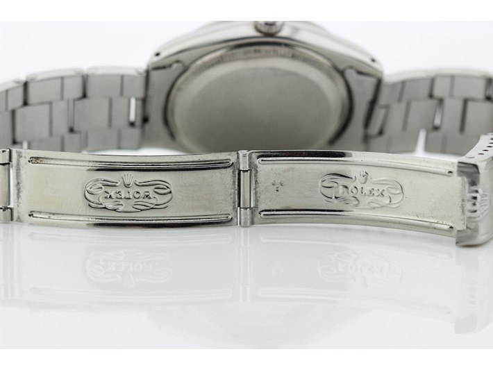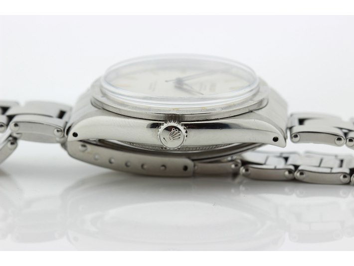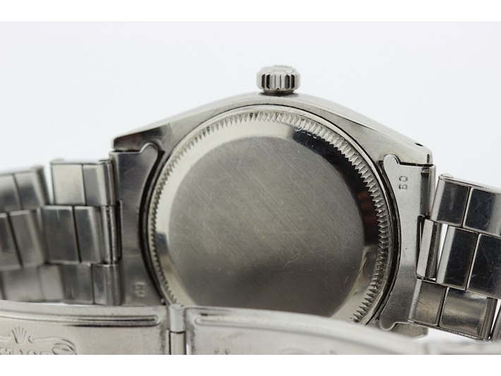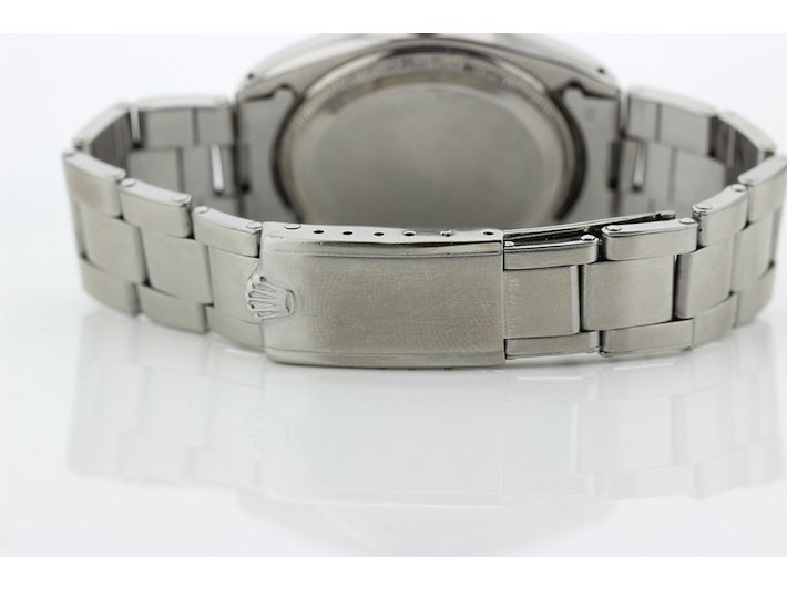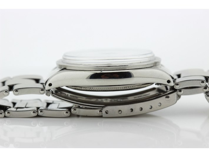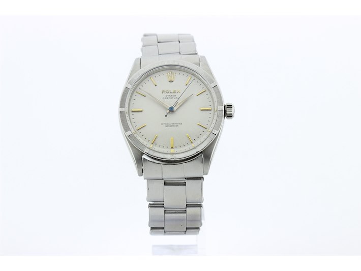 Merk: Rolex Product: Heren polshorloge Kleur: crème wijzerplaat Materiaal: RVS Afmeting: 34 mm. BouwJaar: 1957 Conditie: gebruikt Specificaties: Rolex Oyster perpetual met creme nieuw opgemaakte wijzerplaat met stalen folded link oysterband in goede staat. Engine turned bezel, nieuw plexiglas en revisie door eigen horlogemaker. Loopt perfect +2 seconden per dag. Wij garanderen de echtheid ervan uitdrukkelijk, en u kunt deze bij een Rolex verkoper laten verifiëren. Inclusief originele Rolex reisverpakking en eigen certificaat van echtheid. Serienummer: 265128 Functies: Uur, minuut en datum Uurwerktype: mechanisch, kaliber 1030 Lunette: stalen engine turned bezel Hoogte: 11,55 mm Polsomvang: 17 cm