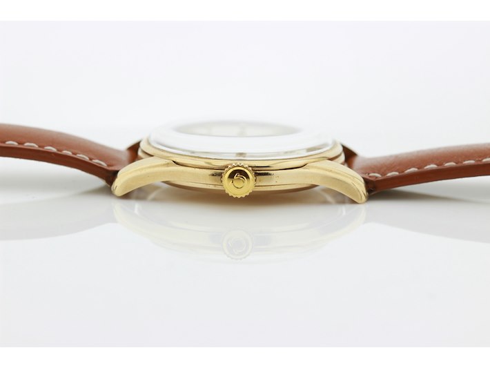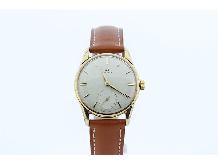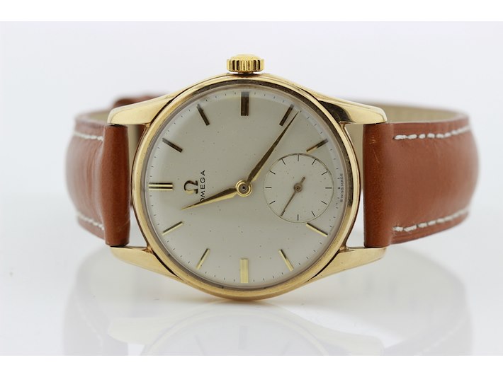 Merk: Omega Product: Heren polshorloge Kleur: crème wijzerplaat Materiaal: 9 karaat rosegoud Afmeting: 34 mm. BouwJaar: 60 er jaren Conditie: gebruikt Specificaties: Vintage Omega 9 karaats geelgouden heren polshorloge met creme wijzerplaat met secondewijzer op de zes, voorzien van een leren band en double Omega gesp. Loopt perfect +7 seconden per dag. Wij garanderen de echtheid ervan uitdrukkelijk, en u kunt deze bij een Omega verkoper laten verifiëren.Waterdichtheid niet gegarandeerd mits vermeld. Inclusief originele omega service verpakking en eigen certificaat van echtheid. Functies: Uur, minuut en seconde Uurwerktype: mechanisch Hoogte: 8,8 mm Polsomvang: 18 cm