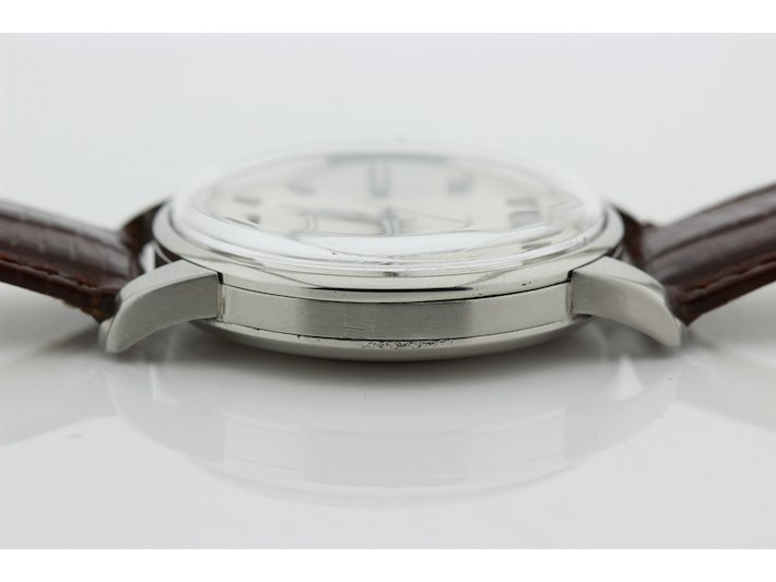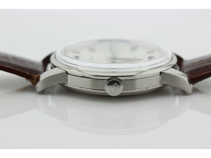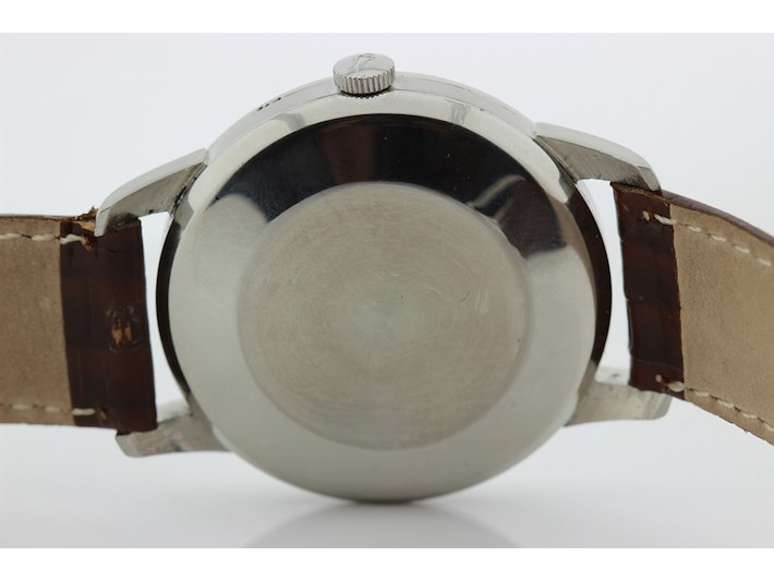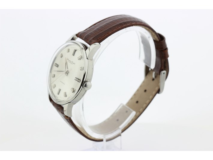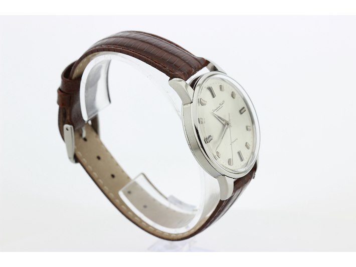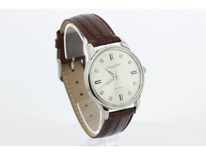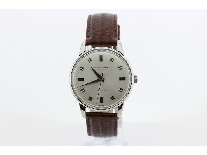 Merk: IWC Product: Heren polshorloge Kleur: grijze wijzerplaat Materiaal: RVS Afmeting: 37 mm. BouwJaar: 60er jaren Conditie: gebruikt Specificaties: Vintage IWC stalen heren polshorloge met nieuw opgemaakte grijze wijzerplaat voorzien van een leren band en stalen gesp, nieuw plexiglas . Loopt redelijk +15 seconden per dag. Wij garanderen de echtheid ervan uitdrukkelijk, en u kunt deze bij een IWC verkoper laten verifiëren. Waterdichtheid niet gegarandeerd mits vermeld. Inclusief neutrale horloge verpakking en eigen certificaat van echtheid. Functies: Uur, minuut en seconde Uurwerktype: Automatisch Hoogte: 11,5 mm Polsomvang: 18 cm