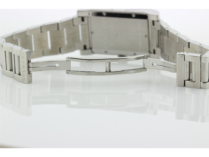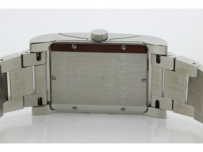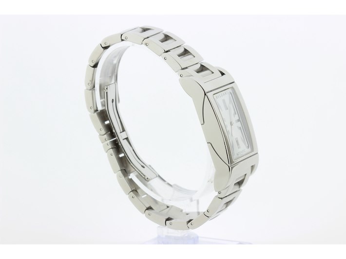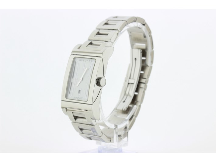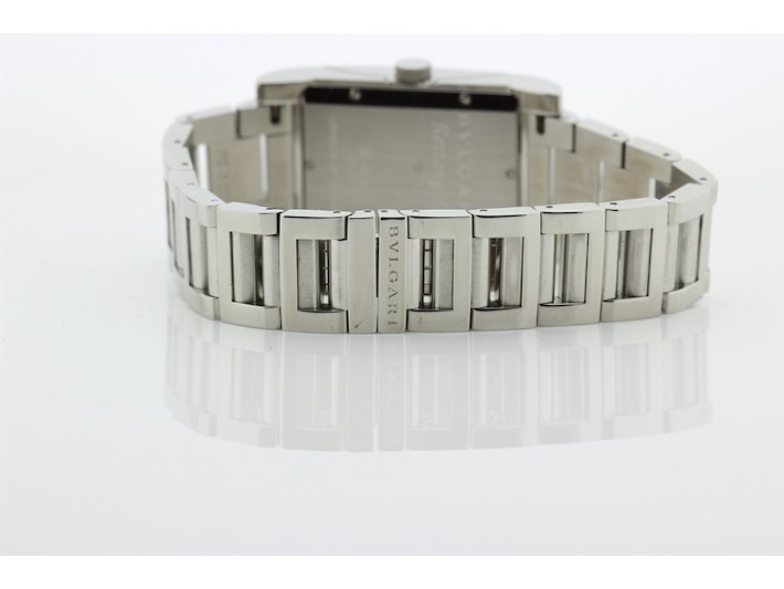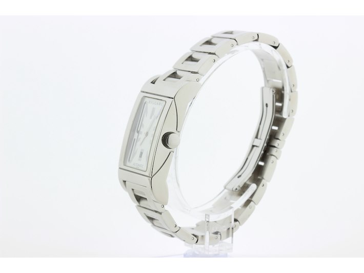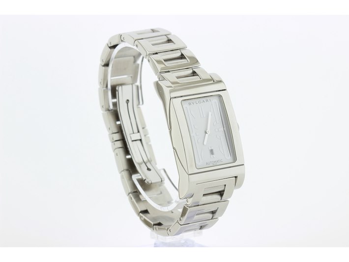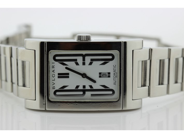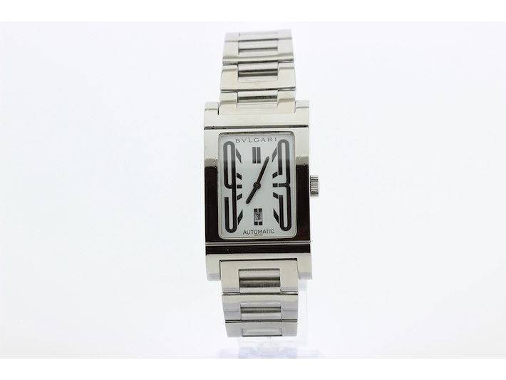 Merk: Bvlgari Product: Heren polshorloge Kleur: witte wijzerplaat Materiaal: RVS Afmeting: 45 x 26 mm. BouwJaar: ca 2000 Conditie: gebruikt Specificaties: Bvlgari stalen heren polshorloge, model Rettangolo, met witte wijzerplaat met stalen band in zeer goede staat. Onbeschadigd saffierglas en revisie door eigen horlogemaker. Loopt goed +13 seconden per dag. Wij garanderen de echtheid ervan uitdrukkelijk, en u kunt deze bij een Bvlgari verkoper laten verifiëren. Waterdichtheid niet gegarandeerd mits vermeld. Inclusief universele horloge doos en eigen certificaat van echtheid. Serienummer: L5133 Functies: Uur, minuut en datum Uurwerktype: automatisch Hoogte: 8,8 mm Polsomvang: 19 cm