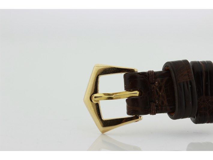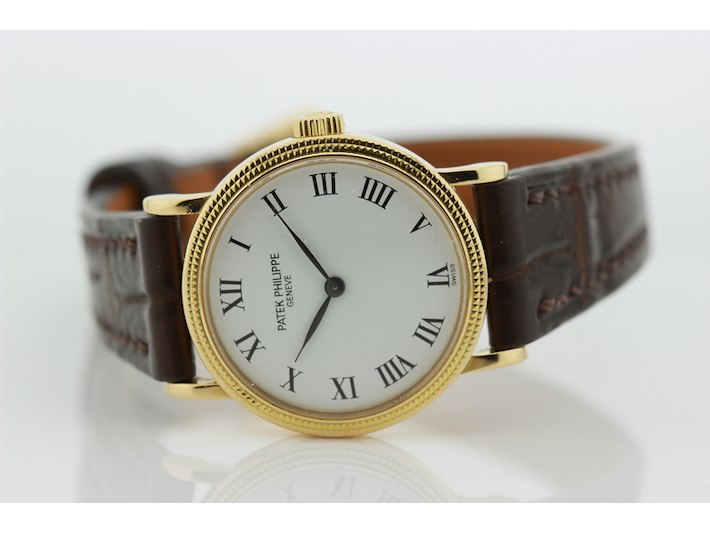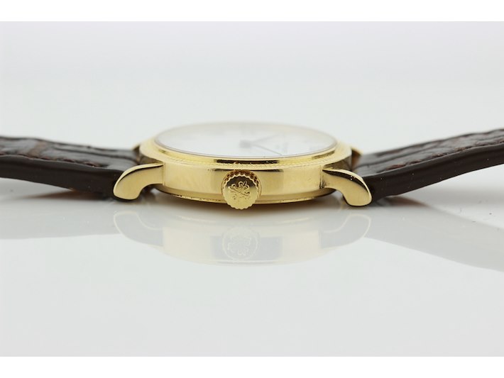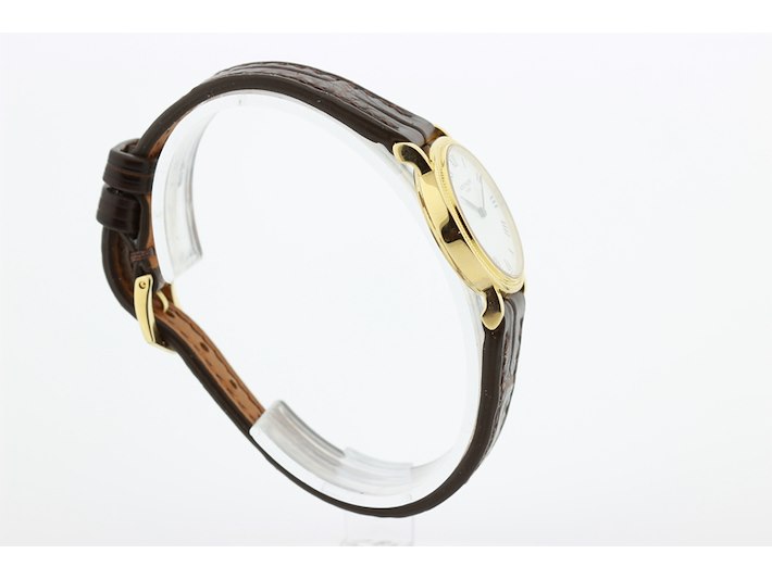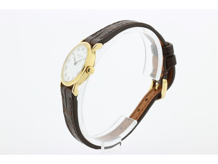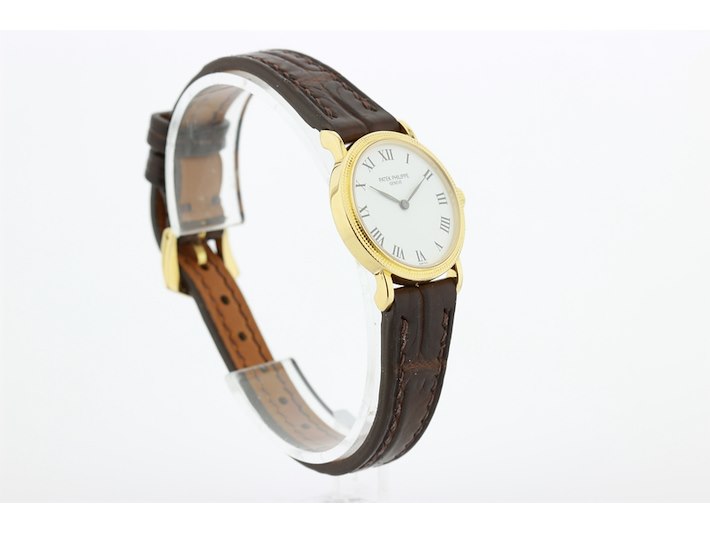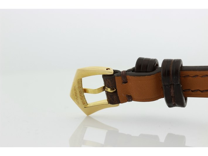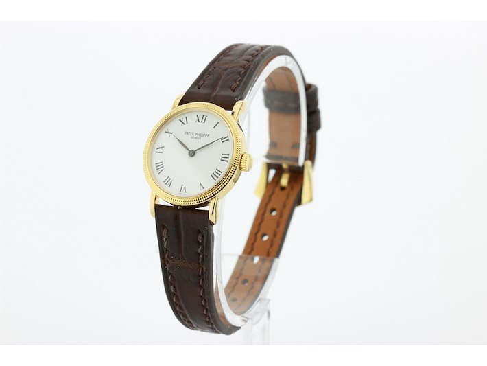 Merk: Patek Philippe Product: Dames polshorloge Kleur: witte wijzerplaat Materiaal: 18 karaat geelgoud Afmeting: 26 mm. BouwJaar: 1999 Conditie: gebruikt Specificaties: Patek Philippe 18 karaats geelgouden dames polshorloge, model Calatrava, met witte wijzerplaat met leren band en originele geelgouden gesp, in zeer goede staat. Onbeschadigd saffierglas. Loopt goed +14 seconden per dag. Wij garanderen de echtheid ervan uitdrukkelijk, en u kunt deze bij een Patek Philippe verkoper laten verifiëren. Waterdichtheid niet gegarandeerd mits vermeld. Inclusief originele doos en aankoopnota. Functies: Uur en minuut Uurwerktype: mechanisch Hoogte: 6 mm Polsomvang: 17 cm