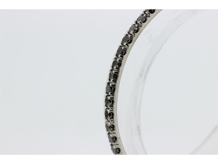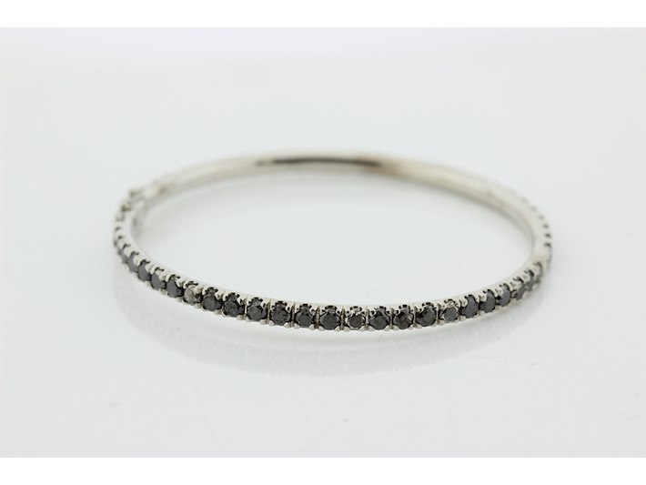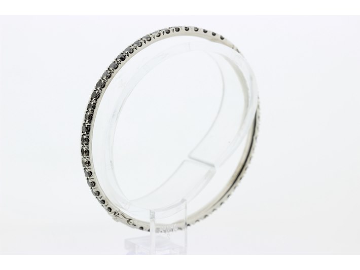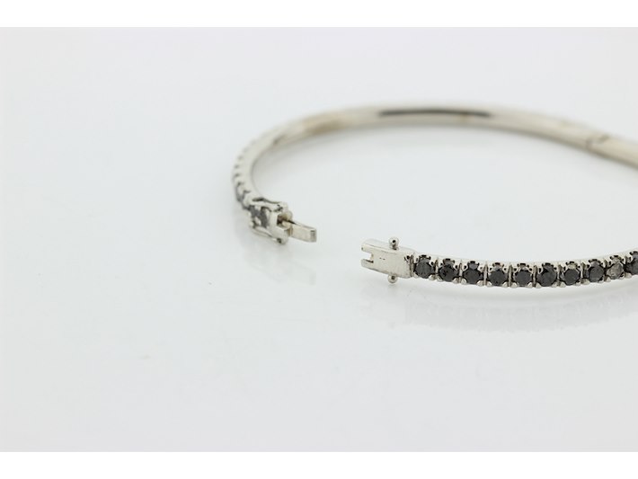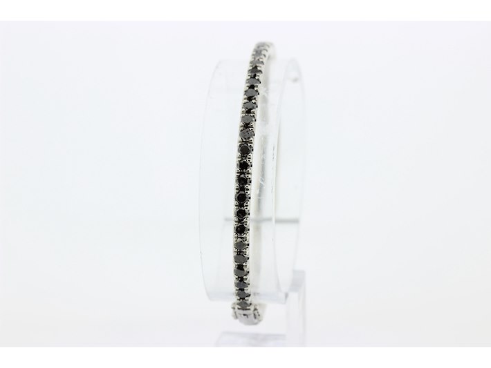 Product: Dames slaven armband Materiaal: 14 karaat witgoud Afmeting: 11,75 gram Conditie: nieuw Specificaties: 14 karaats witgouden slaven armband rondom gezet met 53 briljant geslepen zwarte diamanten met een gewicht van 6,81 crt. Diameter 5,20 cm. Goudgewicht 12,40 gram. Inclusief een armbanden doos en een taxatierapport met een verzekeringswaarde van € 2825,-- afgegeven door een gediplomeerd taxateur Edelsteen: Natuurlijke diamant Aantal: 53 stuks Slijpvorm: Briljant geslepen Gewicht: 6,81 karaat Kleur: Zwart Zuiverheid: NVT