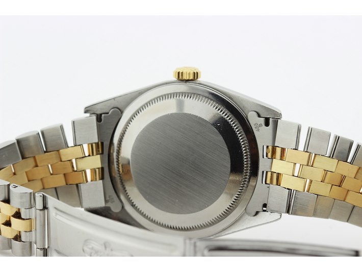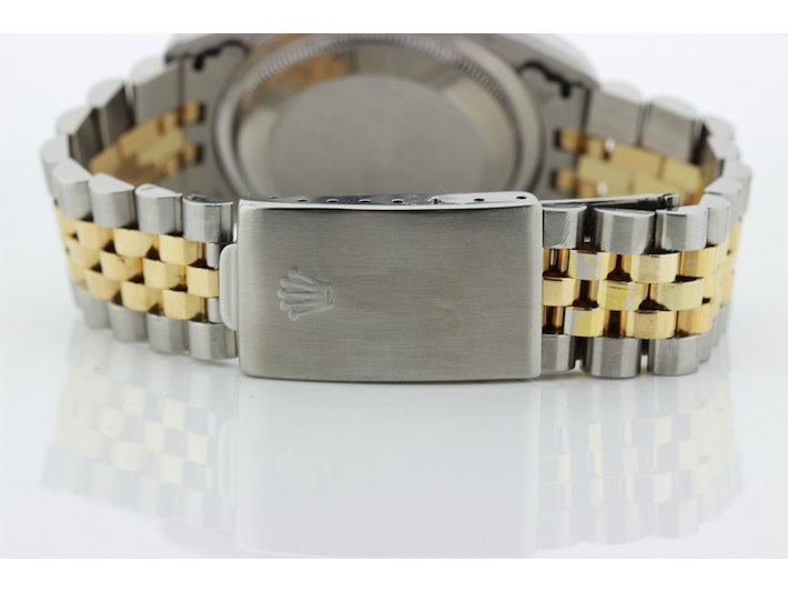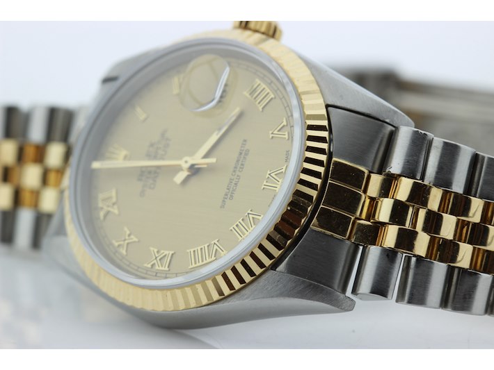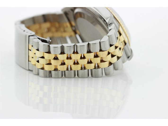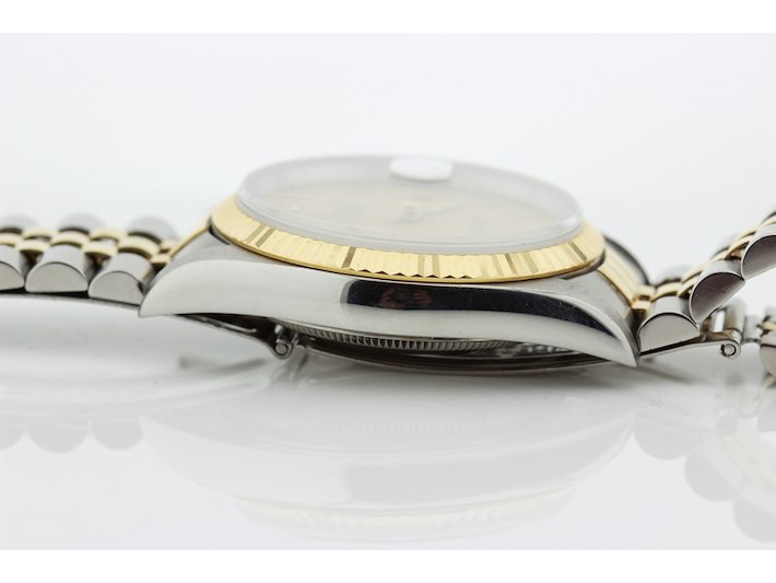 Merk: Rolex Product: Heren polshorloge Kleur: champagne wijzerplaat Materiaal: RVS/18 krt. Goud Afmeting: 36 mm. BouwJaar: 1993 Conditie: gebruikt Specificaties: Rolex Oyster perpetual Datejust met speciale champagne wijzerplaat (verticaal gestreept) met 18 krt. Goud/RVS jubileeband in zeer goede staat. Nieuwe 18 krt. geelgouden fluted bezel, nieuw saffierglas. Loopt perfect +3 seconden per dag. Wij garanderen de echtheid ervan uitdrukkelijk, en u kunt deze bij een Rolex verkoper laten verifiëren. Waterdichtheid niet gegarandeerd mits vermeld. Inclusief originele Rolex reis verpakking en eigen certificaat van echtheid. Serienummer: S679370 Functies: Uur, minuut en datum Uurwerktype: automatisch, kaliber 3035 Lunette: 18 krt. geelgouden bezel Hoogte: 11 mm Polsomvang: 18,5 cm