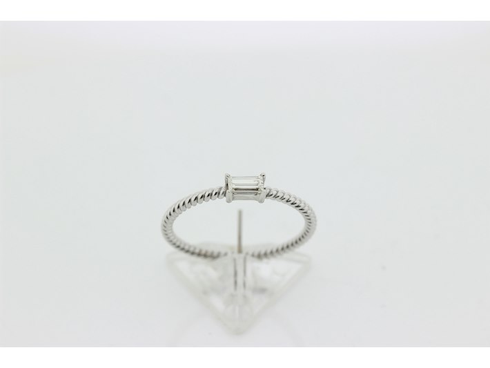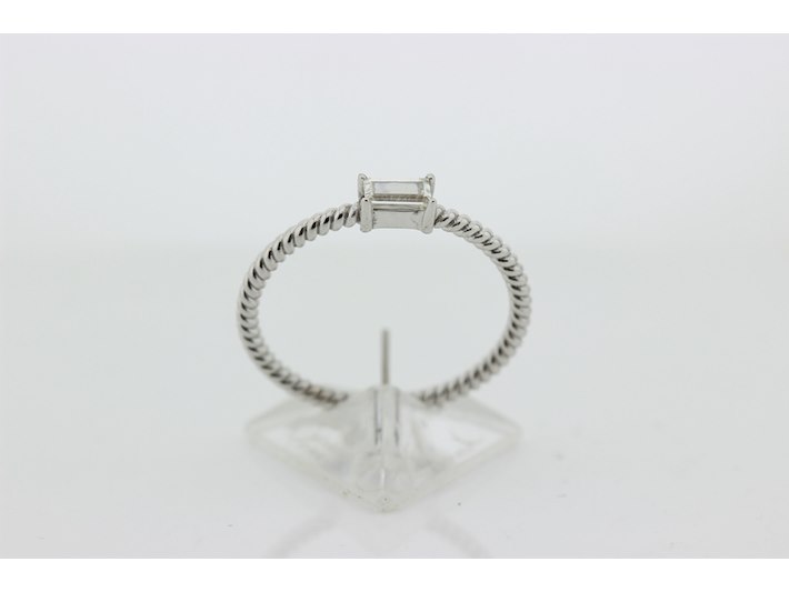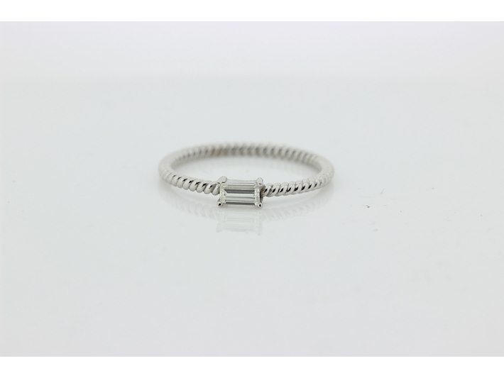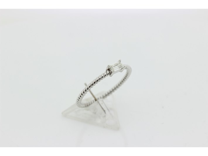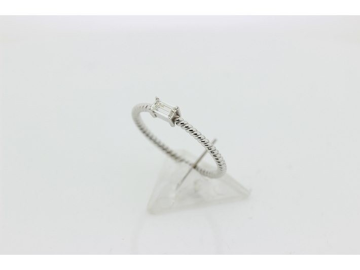Product: Dames ring Materiaal: 14 karaat witgoud Afmeting: 1,45 gram Conditie: gebruikt Specificaties: 14 karaats solitair ring gezet met 1 als baquette geslepen diamant met een gewicht van 0,20 crt, Kleur G en kwaliteit VVS. Inclusief een ringen doos en een taxatierapport met een verzekeringswaarde van € 1150,-- afgegeven door een gediplomeerd taxateur. Edelsteen: Natuurlijke diamant Aantal: 11 Slijpvorm: baquette Gewicht: 0,20 crt Kleur: G Zuiverheid: VVS Ringmaat 17.5