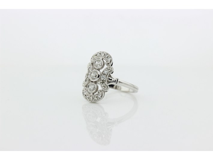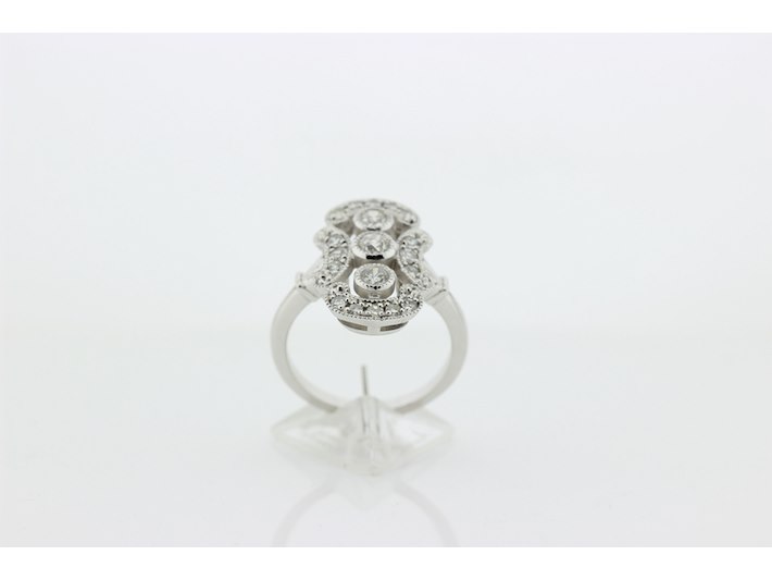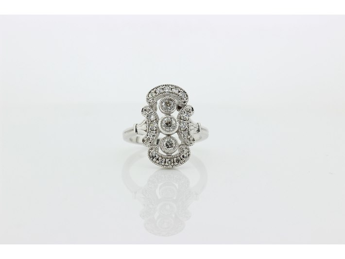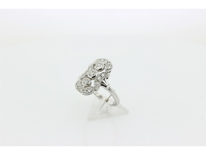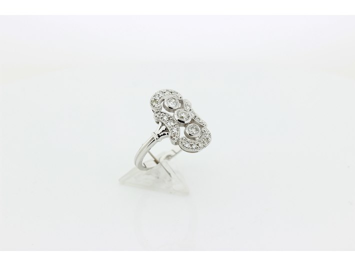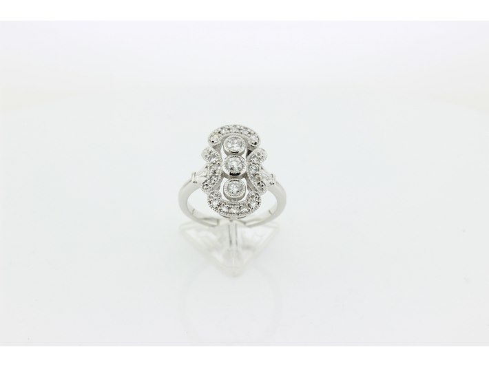 Product: Dames ring Materiaal: 14 karaat witgoud Afmeting: 5,9 gram Conditie: gebruikt Specificaties: Prinsesse ring uit de jaren 60 gezet met 3 als bolsewiek geslepen diamanten met een gewicht van 0,44 crt. Kleur G en kwaliteit SI. Rondom zijn 16 als 8/8 geslepen diamanten gezet met een gewicht van 0,32 crt. Kleur G en kwaliteit VS. Totaal gewicht 5,90 gram. Inclusief een Inclusief een ringen doos en een taxatierapport met een verzekeringswaarde van € 2950,-- afgegeven door een gediplomeerd taxateur. Edelsteen: Natuurlijke diamant Aantal: 3/16 Slijpvorm: Bolsewiek-8/8 diamant Gewicht: 0,44 karaat, 0,32 karaat Kleur: G Zuiverheid: SI/VS ringmaat: 16,8