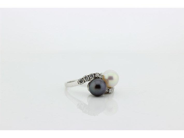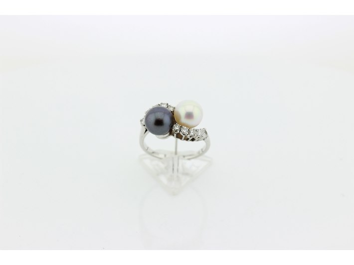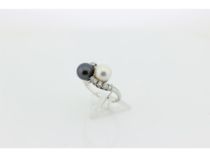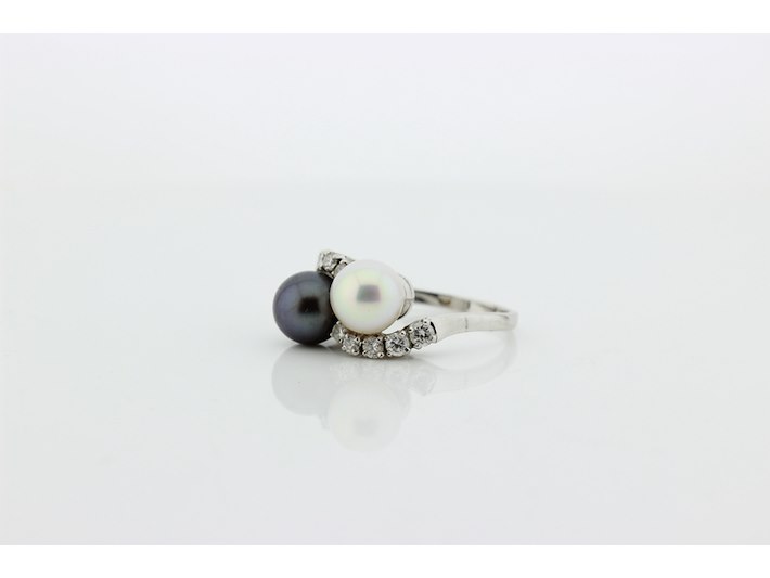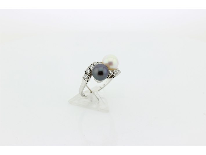 Product: Dames ring Materiaal: 18 karaat witgoud Afmeting: 4,7 gram Conditie: gebruikt Specificaties: 18 karaats witgouden parel toi et moi ring met een natuurlijke witte cultive zoutwaterparel met een diameter van 7,5 mm, mooi luster en gave huid. en een een natuurlijke zwarte cultive zoutwaterparel met een diameter van 7,5 mm. Op de scheen zijn 10 als briljant geslepen diamanten gezet met een gewicht van 0,50 crt, Kleur G en kwaliteit VS. Inclusief een ringen doos en een taxatierapport met een verzekeringswaarde van € 2295,-- afgegeven door een gediplomeerd taxateur Edelsteen: Natuurlijke diamant Aantal: 10 Slijpvorm: Briljant geslepen Gewicht: 0,50 karaat Kleur: G Zuiverheid: VS ringmaat: 16,3