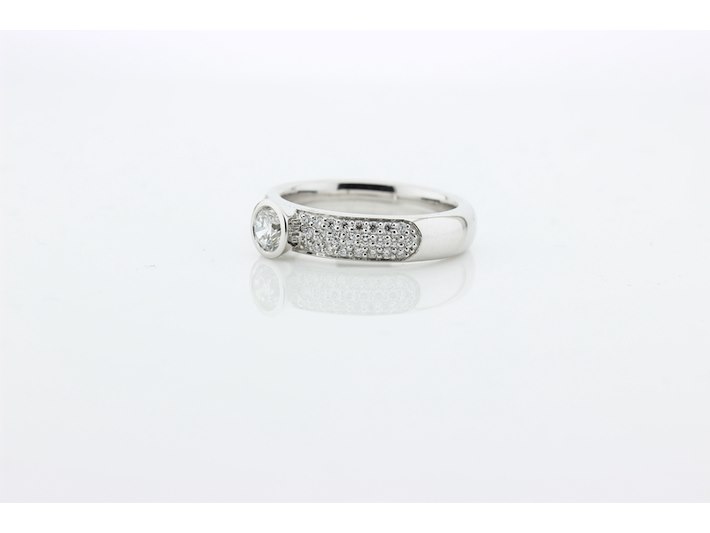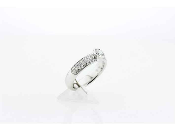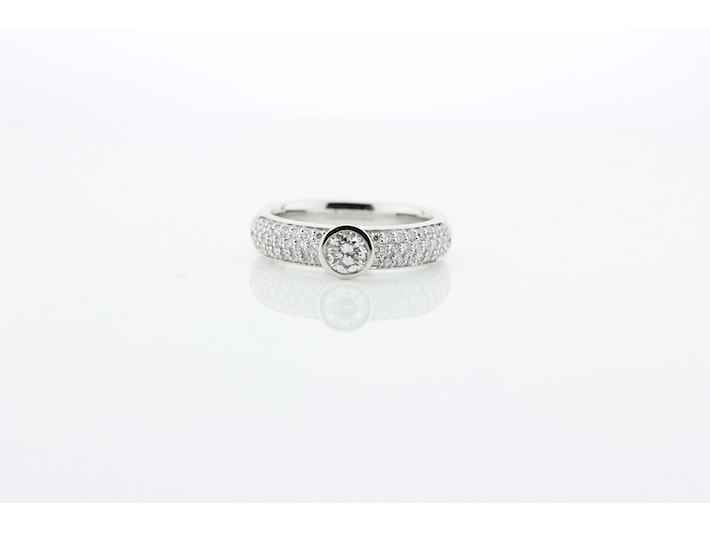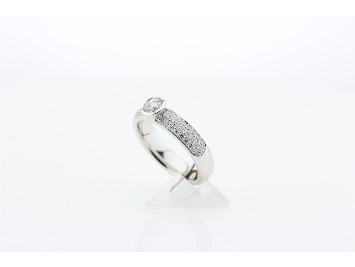Product: Dames ring Materiaal: 14 karaat witgoud Afmeting: 6,5 gram Conditie: gebruikt Specificaties: 14 karaats witgouden bolle ring gezet met 1 briljant geslepen diamant met een gewicht van 0,45 crt, Kleur G en kwaliteit VS. Op de scheen zijn 48 als briljant geslepen diamanten gezet met een gewicht van 0,48 crt, Kleur G en kwaliteit VS. Inclusief een ringen doos en een taxatierapport met een verzekeringswaarde van € 2950,-- afgegeven door een gediplomeerd taxateur. Edelsteen: Natuurlijke diamant Aantal: 49 Slijpvorm: Briljant geslepen Gewicht: 1-0,45 crt /48-0.48 crt Kleur: G Zuiverheid: VS Ringmaat 18