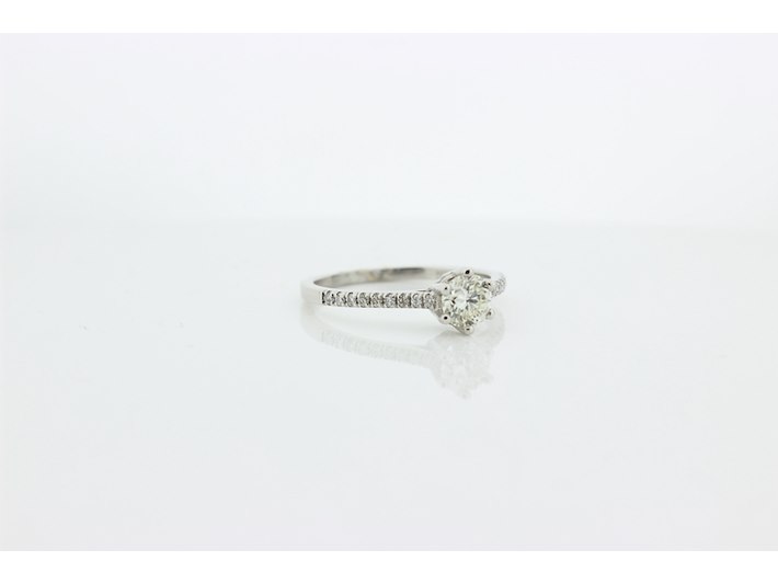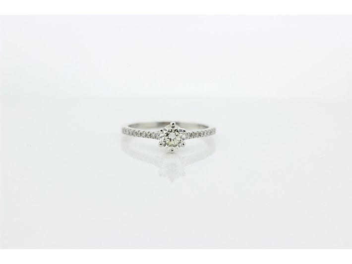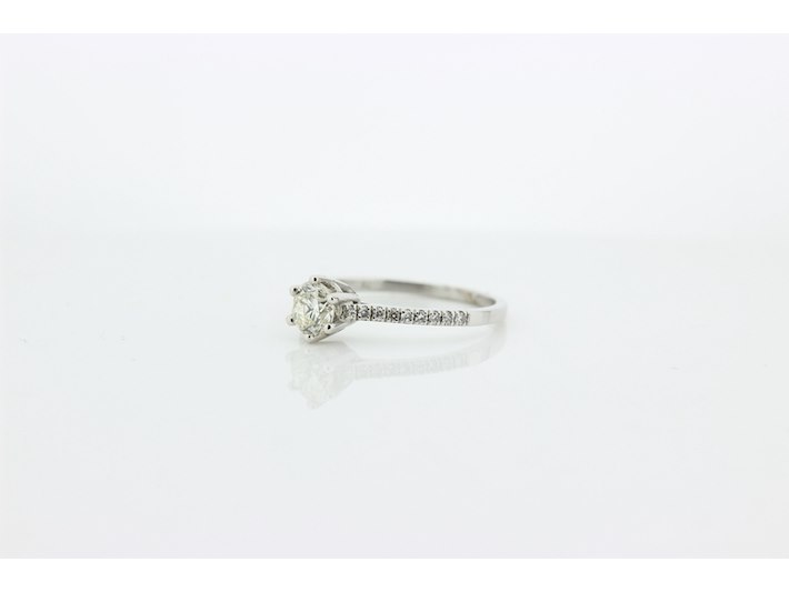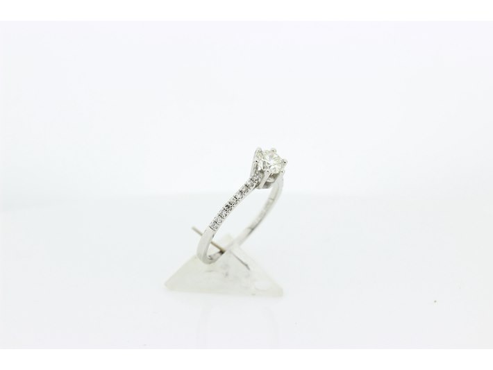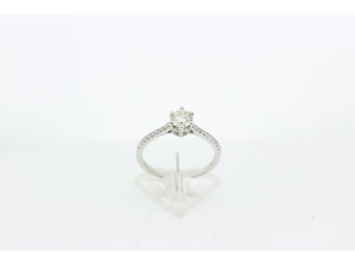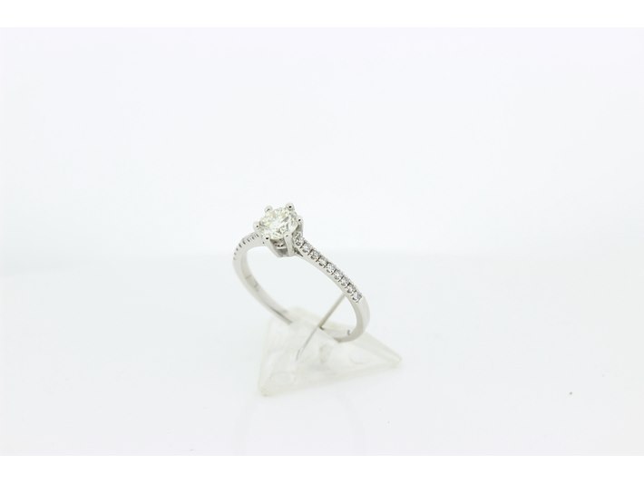 Product: Dames ring Materiaal: 14 karaat witgoud Afmeting: 3,7 gram Conditie: gebruikt Specificaties: Solitair met als hoofdsteen 1 briljant geslepen diamant met een gewicht van 0.51 crt. Kleur K en kwaliteit VS. Op de scheen zijn 18 briljant geslepen diamanten gezet met een totaal gewicht van 0.15 crt. Kleur G en kwaliteit VS. Inclusief een ringen doos en een taxatierapport met een verzekeringswaarde van € 2950,-- afgegeven door een gediplomeerd taxateur. Edelsteen: Natuurlijke diamant Aantal: 1/15 Slijpvorm: Briljant Gewicht: 0,51 karaat/0,15 karaat Kleur: K/G Zuiverheid: VS ringmaat: 16,75