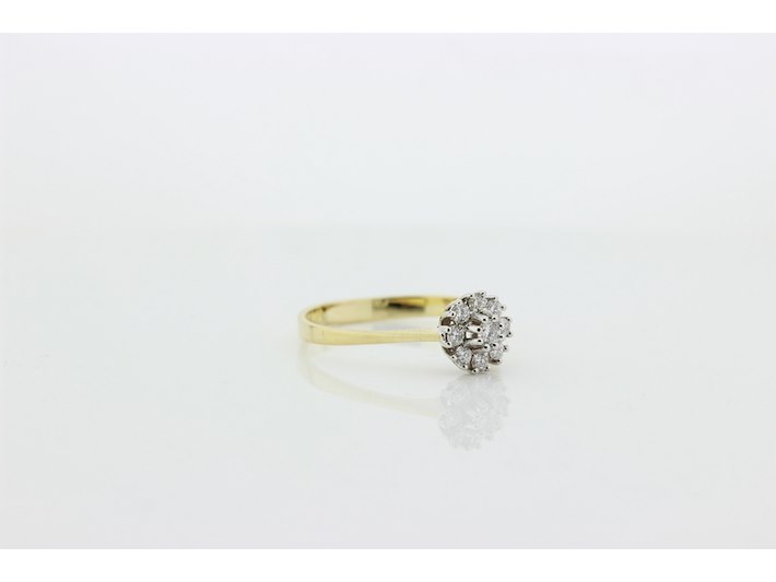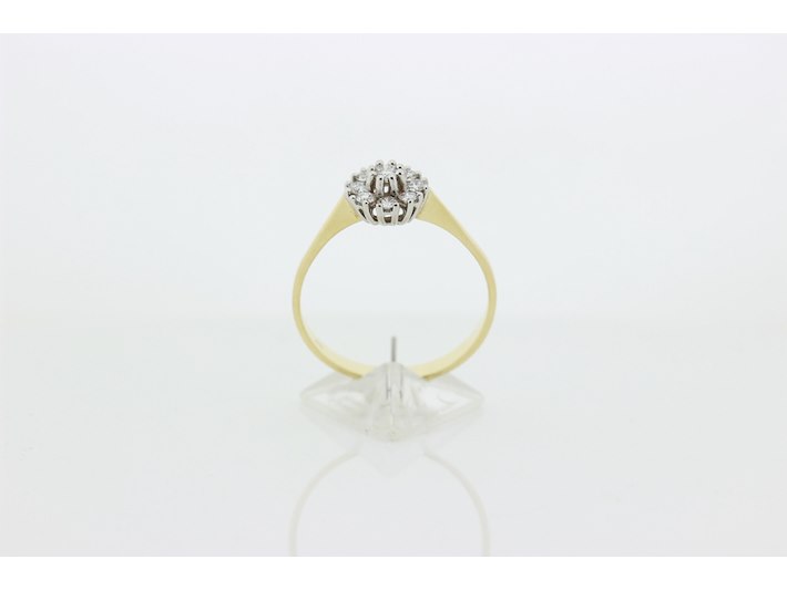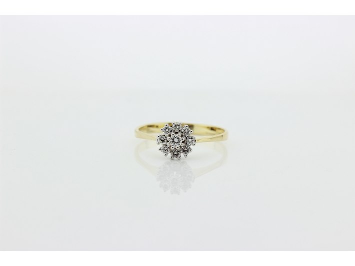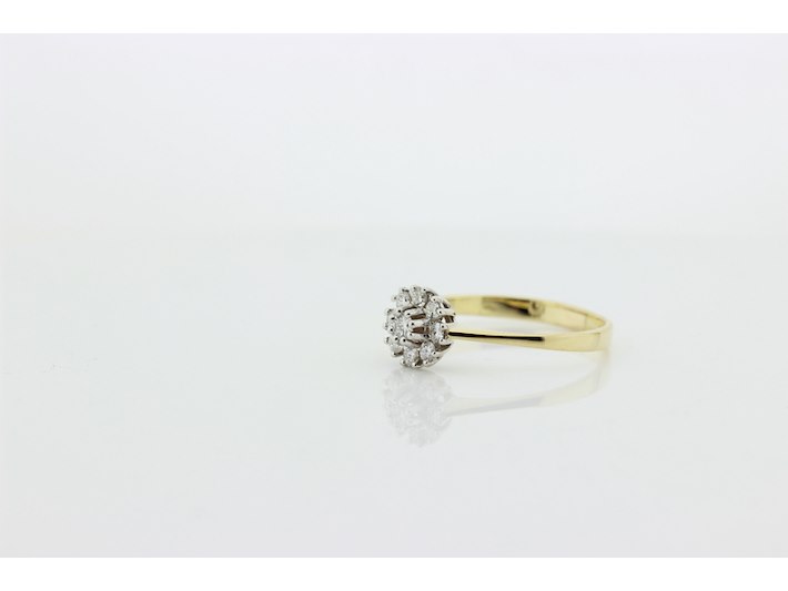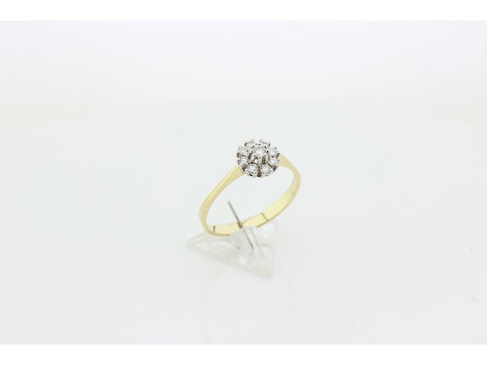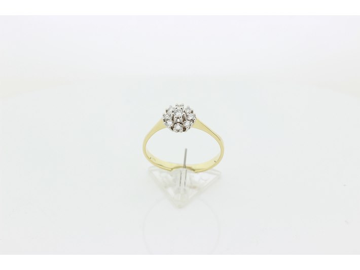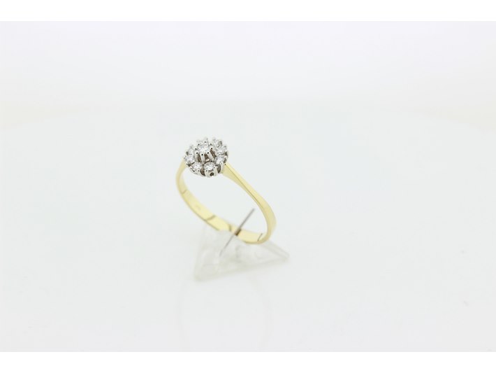Product: Dames ring Materiaal: 14 karaat bi-color Afmeting: 2,55 gram Conditie: gebruikt Specificaties: Rozetring met als hoofdsteen 1 briljant geslepen diamant met een gewicht van 0.10 crt. Kleur G en kwaliteit VS. Rondom zijn 8 briljant geslepen diamanten gezet met een totaal gewicht van 0.24 crt. Kleur G en kwaliteit VS. Inclusief een ringen doos en een taxatierapport met een verzekeringswaarde van € 1450,-- afgegeven door een gediplomeerd taxateur. Edelsteen: Natuurlijke diamant Aantal: 1/8 Slijpvorm: Briljant Gewicht: 0,10 karaat/0,27 karaat Kleur: G Zuiverheid: VS ringmaat: 20