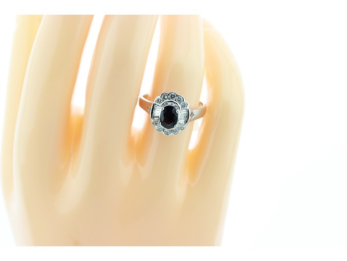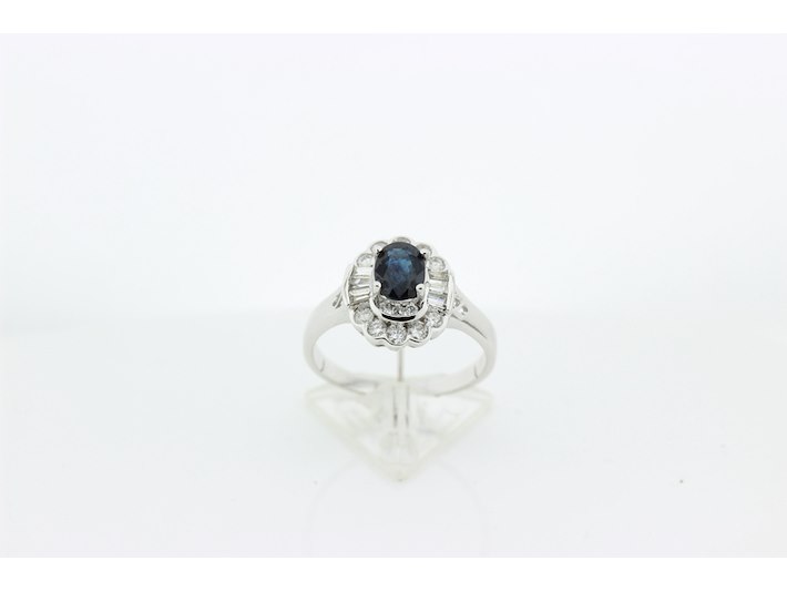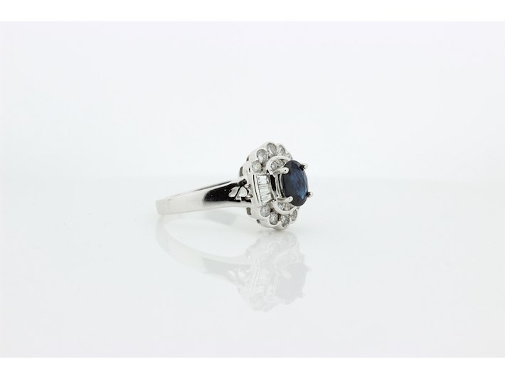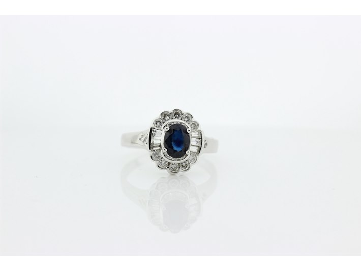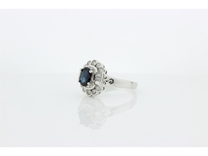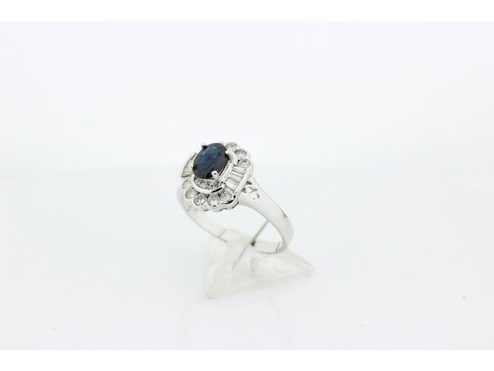 Product: ring Materiaal: 18 karaat Afmeting: 4,15 gram Conditie: gebruikt Specificaties: Witgouden 18 karaats witgouden rozetring gezet 1 naturlijke saffier met een gewicht van ca. 0,80 crt. Hier omheen zijn 6 als tape geslepen diamanten gezet en 16 als briljant geslepen diamanten, kleur H, kwaliteit SI. Inclusief een ringendoos en een taxatierapport met een verzekeringswaarde van € 2650,-- afgegeven door een gediplomeerd taxateur. Edelsteen: Natuurlijke saffier/diamant Aantal: 1/16 Slijpvorm: Ovaal/tape/briljant Gewicht: 0,80crt./0,8crt Kleur: H Zuiverheid: SI Ringmaat: 17,5