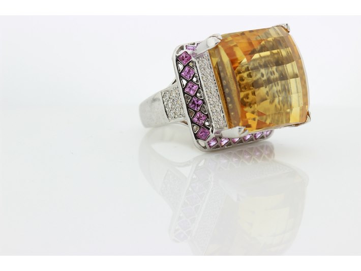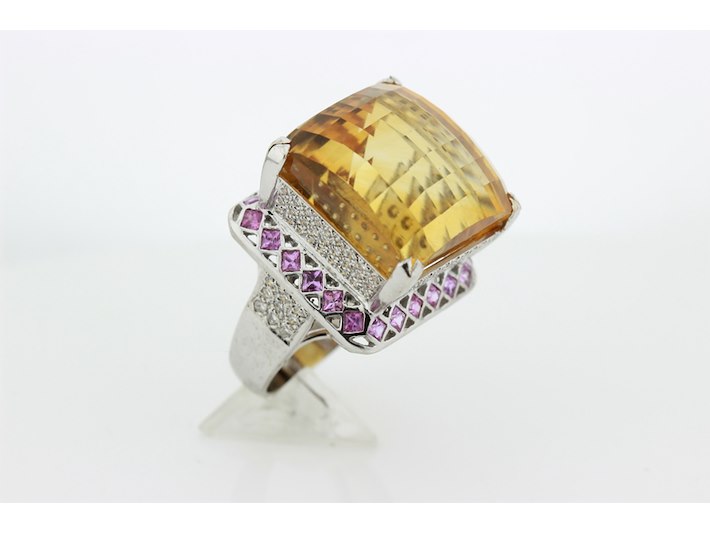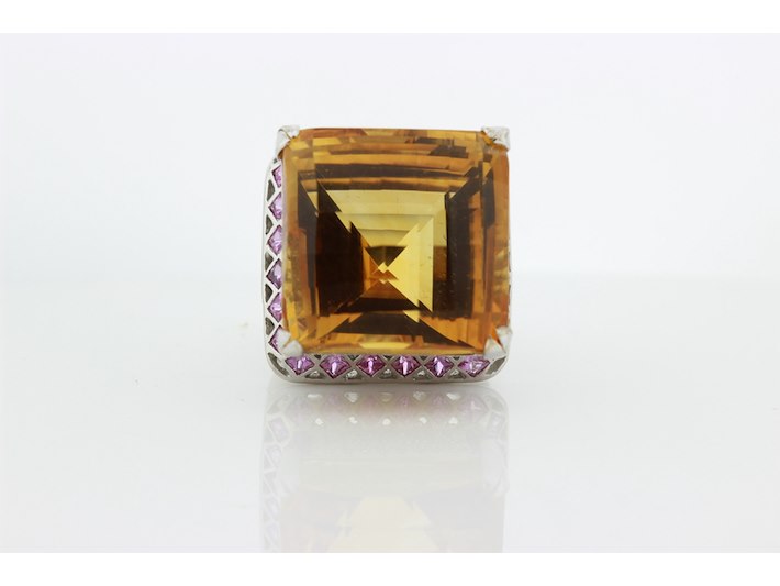 Product: Dames ring Materiaal: 18 karaat witgoud Afmeting: 30 gram Conditie: nieuw Specificaties: 18 karaat witgouden fantasiering gezet met een natuurlijke citrien met een diameter van 20 mm. Op de zijkanten van de zetkast, en op de ringscheen zijn 138 als briljant geslepen diamanten gezet met een gewicht van 1,05 crt. en 24 natuurlijke roze saffieren. Inclusief een ringen doos en een taxatierapport met een verzekeringswaarde van € 5375,-- afgegeven door een gediplomeerd taxateur. Edelsteen: 24 natuurlijke saffieren Edelsteen: 138 natuurlijke briljanten Slijpvorm: briljant geslepen Gewicht: 1,90 crt./1,05 crt Kleur: Roze/G Zuiverheid: VS Ringmaat 17